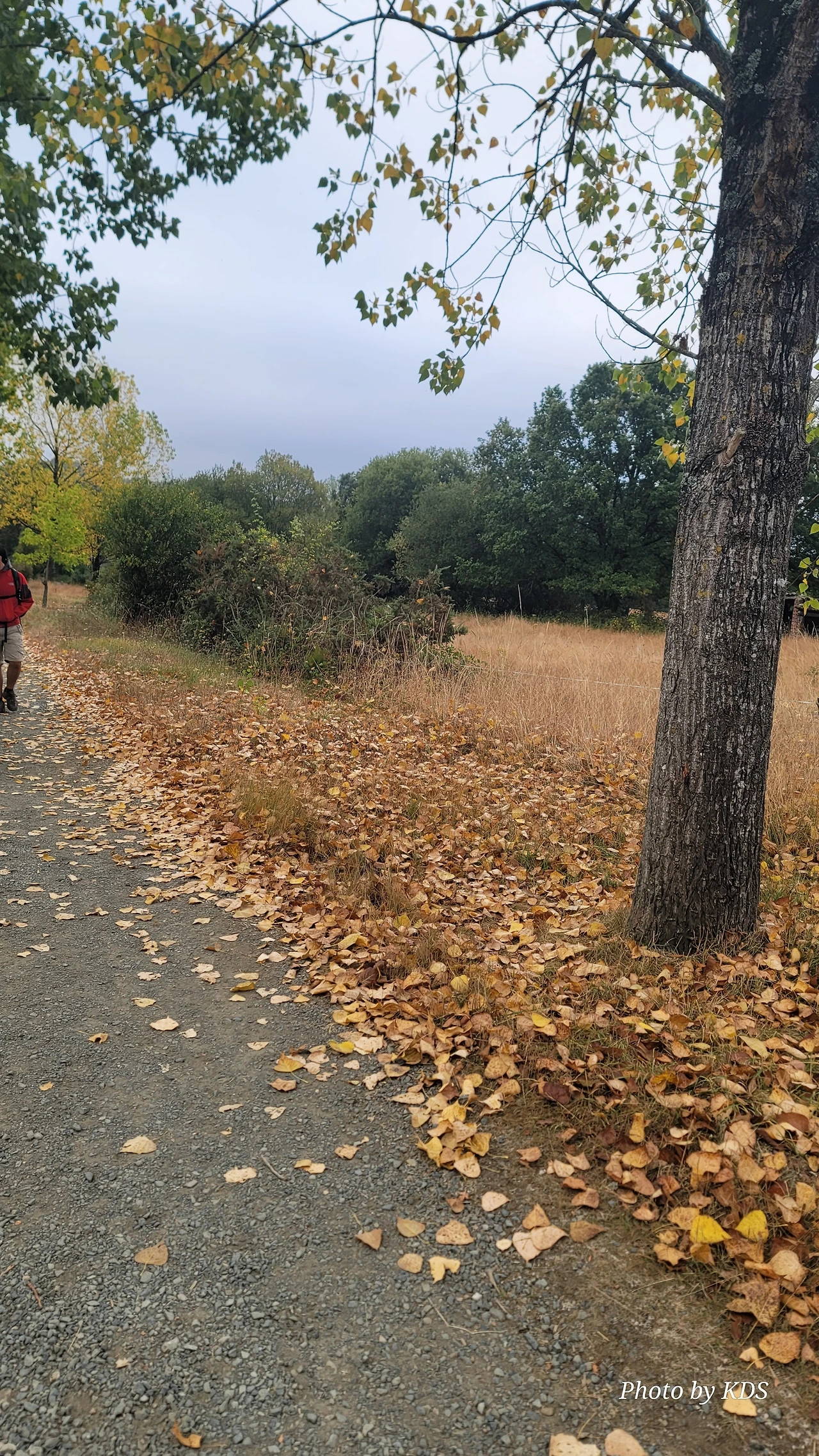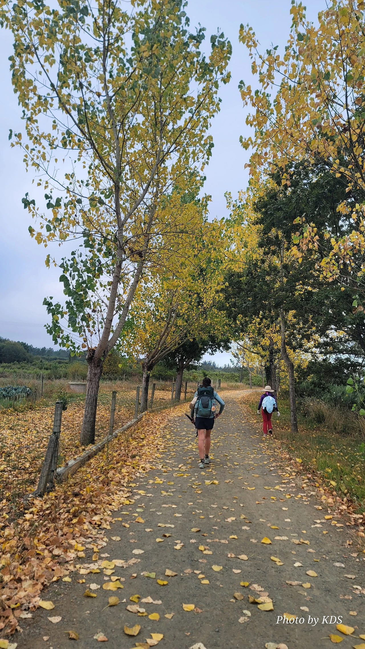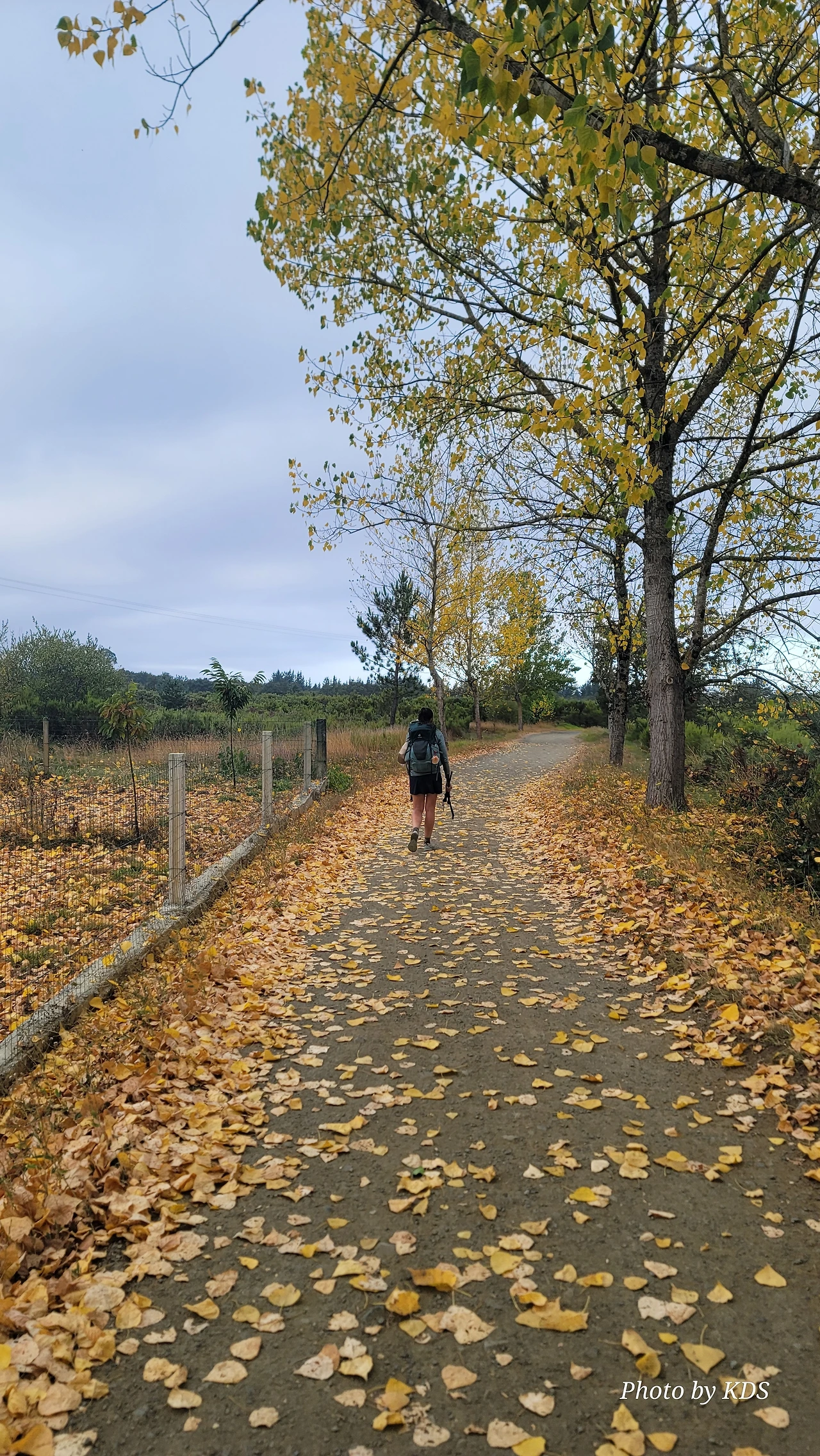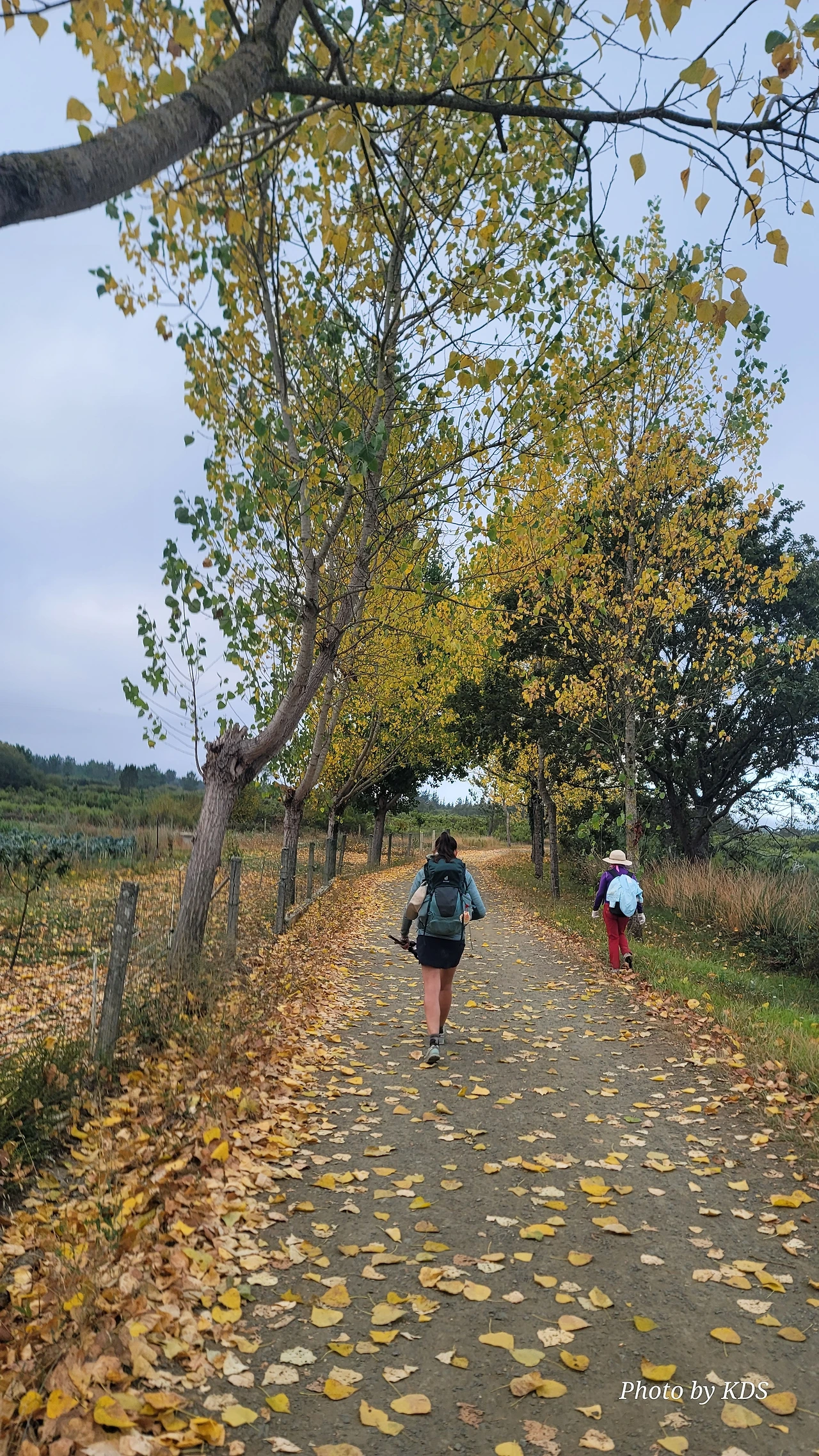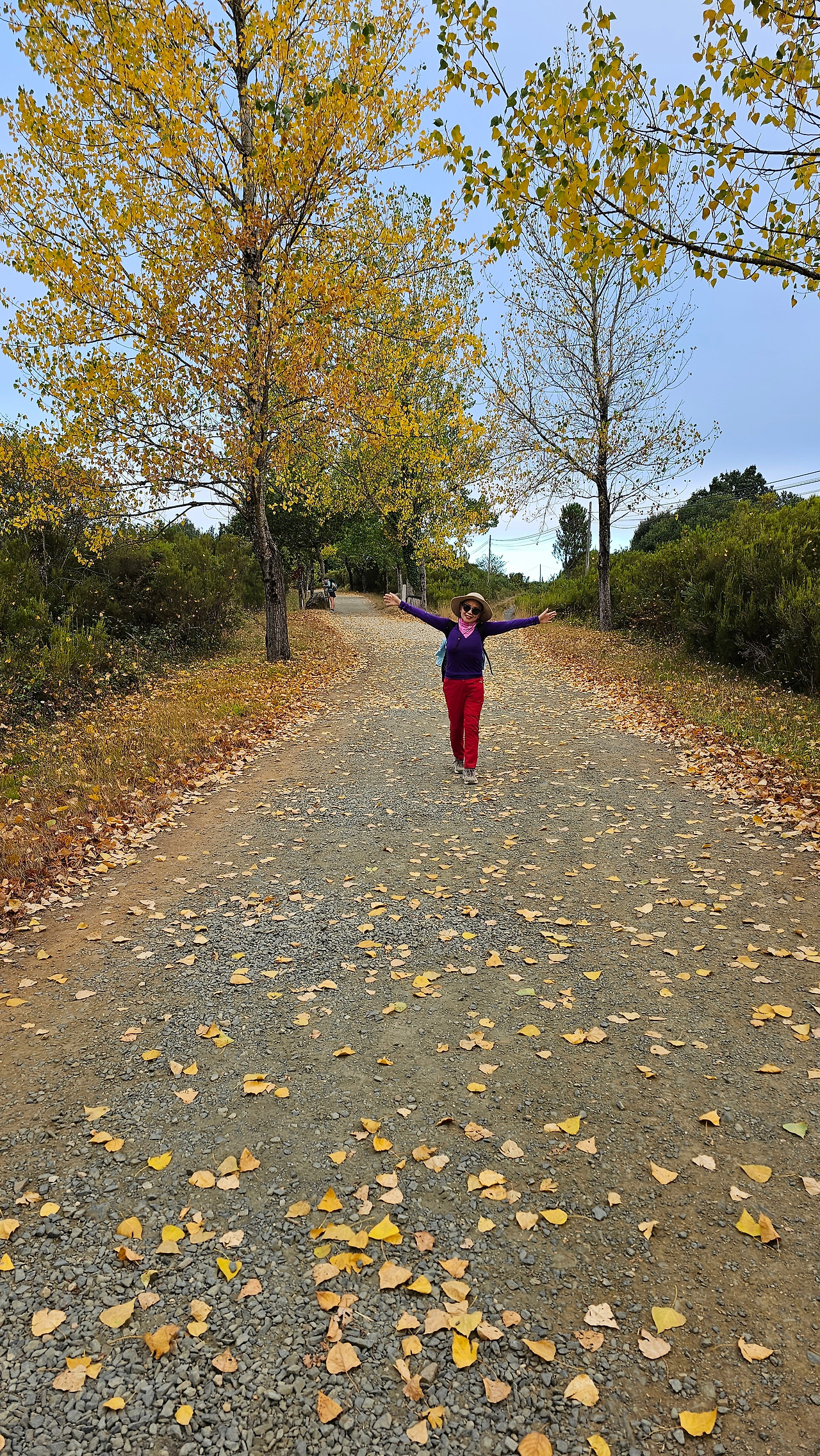 레보레이로(Leboreiro) 마을에서 푸레로스(Furelos) 마을로 이동하는 순례길에서 기이한 광경이 또 나타났다. 계절산 8월이면 모든 나무들이 잎이 무성하게 피어 있어야 정상인데, 이곳에 있는 가로수 들은 노랗게 변하여 낙엽이 되어 대부분 떨어지고 앙상한 나뭇가지를 드러내고 있었다. 덕분에 순례길은 노란 낙엽길이 되어 순례객들이 걷기에 운치가 아주 좋은 길이 되어 있었다. 나무의 수종(樹種)은 은사시나무 비슷하게 생겼다. 같은 종류의 나무가 수 Km정도 심어져 있었지만 이곳의 1Km 정도만 이런 현상을 보이는 걸 보면 나뭇잎에 치명적인 전염병에 걸렸거나, 그렇지 않으면 이 지역의 토양 특성 때문인지도 모르겠다. 아무튼 나무가 죽을 정도는 아니고 8월의 크리스마스를 보듯이 8월의 낙엽길을 만나기 감회가 색다르게 느껴졌다.