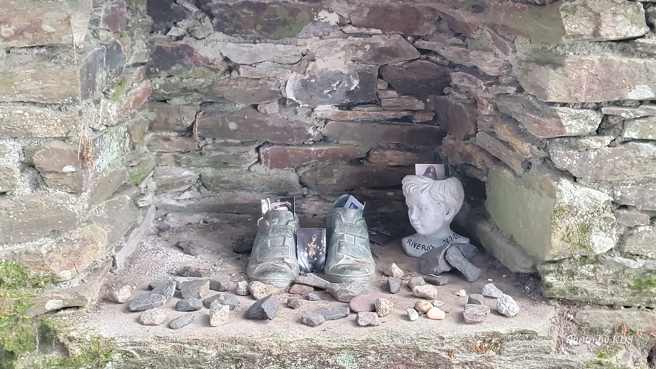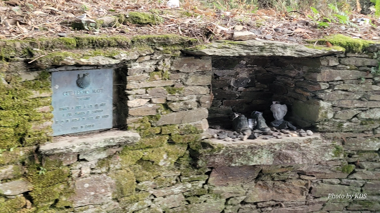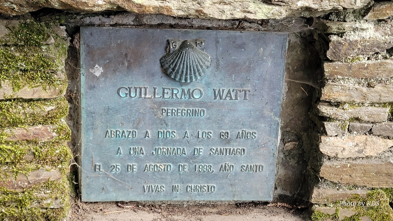 레스토랑도 알베르게도 안중에 없다. 부지런히 걷고 또 걷는데, 외딴 마을을 지나고 약간의 언덕길에서 또 하나의 인생 순례길을 마친 기념물이 눈앞에 나타난다. 순례길의 선배인 기념물을 차마 그냥 스칠 수가 없었다. 길레르모 와뜨(Guillermo Watt)라는 순례자로서 69세 1993년 8월 25일에 이곳에서 하느님의 곁으로 인생 순례를 마치고 돌아갔다고 표시되어 있다. 800Km의 순례길을 걸으면서 길에서 인생을 마감한 많은 먼저 간 순례자 기념비를 보았다. 우리도 언젠가는 인생 순례를 마감하고 하늘나라로 갈 것이다. 그 길이 순조로웠든 가시밭길이었든 그 길을 버리고 가는 것이다. 그가 신었던 신발 모형의 조형물이 가슴을 서늘하게 한다. 이 길을 지나가던 순례객들이 하나씩 주어다 올려놓은 조약돌들이 같이 그를 기리고 있다.