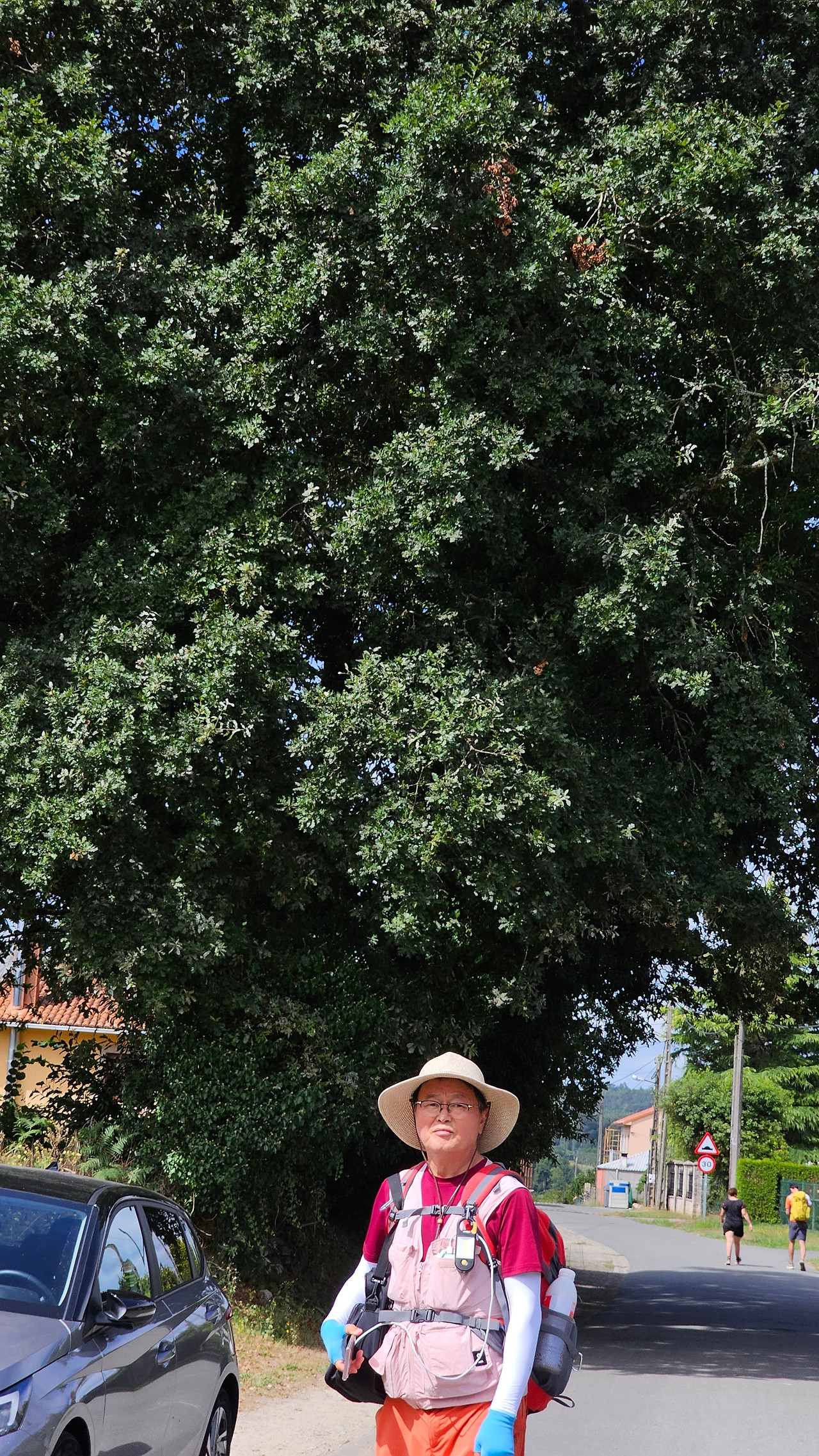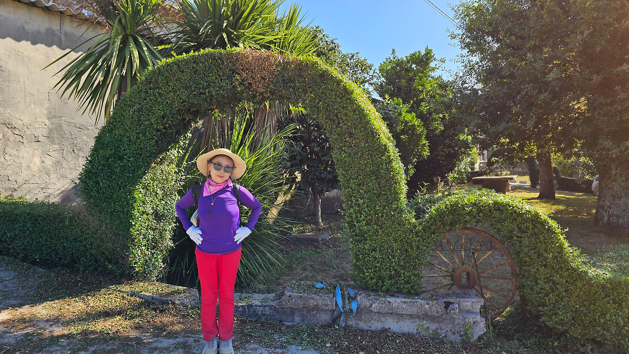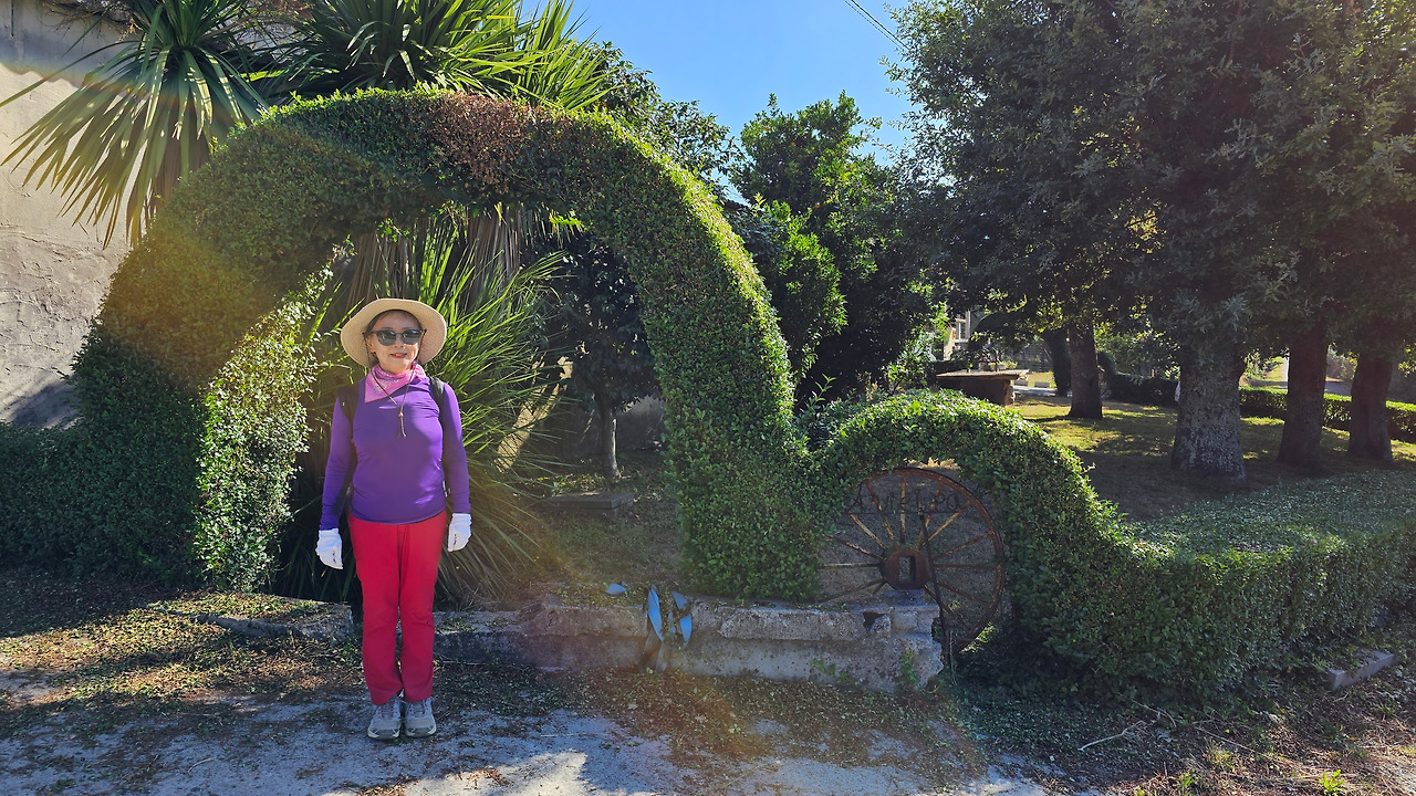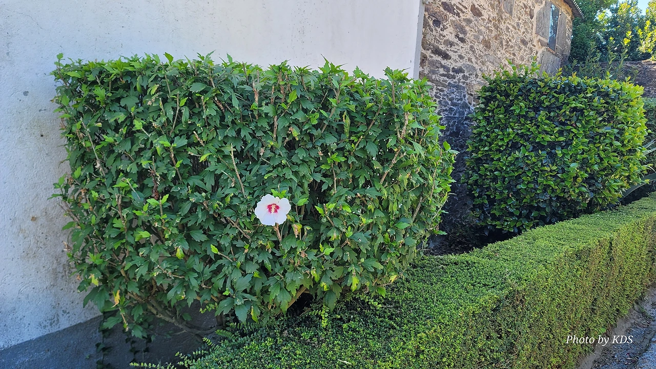 아침에 아르수아(Arzua) 숙소에서 6시에 출발하여 지름길, 조림지길 등 빠르다고 생각되는 길로 마구 이동하다 보니 어느덧 목적지 산티아고사 10Km 정도를 남긴 마을인 라바꼬야(Labacolla)에 당도한 것이다. 마을에 들르지 않고 변칙적인 이동로를 택한 결과이다. 그러니 자연 전통적인 순례길에서 거쳐야 하는 마을을 대부분 생략하게 된 것이다. 생략된 마을을 기록을 해 두어야 혹시 이 글을 읽고 순례길을 걷게 될 나중의 순례자들에게 알림이 될 것 같아서 표기해 둔다. Pregontuno(2.4Km), Calzada(6Km), Calle(7.7Km), Boavista(9.2Km), Salceda(11.2Km), Santa Irene(15.8Km), A Rua(18Km), O Pedrouzo(19Km), San Anton(19.5Km), Amenal(21.3Km), San Paio(25.3Km), Labacolla(29Km) 등이다. 괄호 안의 거리 표시는 아르수아 마을에서부터의 거리이다. 마을 근처에 오니 어느 집의 담장에 정원수로 무궁화를 밀생하여 키우고 있는데, 딱 한송이의 무궁화가 활짝 피어서 조선 과객 금삿갓을 향한 반가이 웃고 있어서 가슴이 뭉클하였다. 마치 고향 까마귀를 만난 기분이었다. 순례길을 걷다가 무궁화를 본 것이 몇 번 정도 된다. 특히 비야뚜에르따(Villatuerta) 마을의 가로수는 모두 무궁화나무였다. 활짝 핀 무궁화로 가로수를 만들어 둔 마을의 정감이 깊었는데, 여기서 다시 한송이 무궁화 꽃을 만나니 정말 뿌듯하다. 또 조금 더 걸어가니 마침 현대 소나타 자동차가 길옆에 주차되어 있어서 그것 또한 반가웠다.