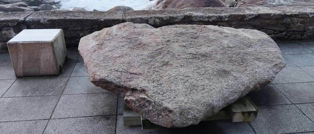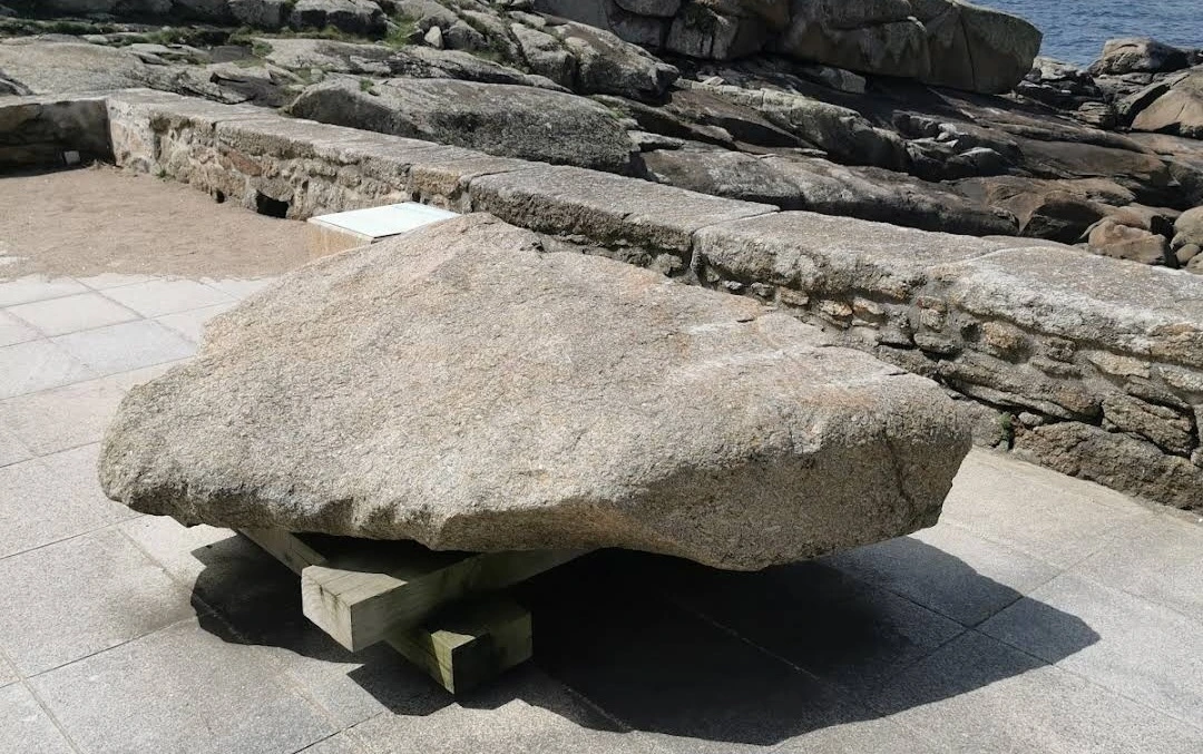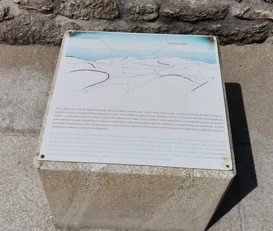 이 바위는 성모 마리아가 타고 온 돌배의 방향타 구실을 했던 바위란다. 이름은 Pedra do Timon이다. 이 바위는 2014년 격렬한 폭풍이 몰아칠 때 큰 파도에 의해 부서져서 위의 사진처럼 조각만 남아서 바위 언덕 위쪽으로 이전하여 이렇게 전시해 놓고 있다. 이 바위는 죄지은 사람이 유죄인지 무죄인지를 측정하는 신비한 능력을 가졌다고 한다. 범죄 혐의자나 불륜 의심되는 사람을 바위 위에 올라서게 하면 그 바위의 진동이나 흔들림으로 그 죄를 알 수 있다고 한다. 옛날 어떤 도둑이 성모 마리아 성소에 들어가서 성물을 훔치려고 하자 이 바위가 춤을 추면 움직여서 도둑이 물건을 두고 도망갔다고 한다.