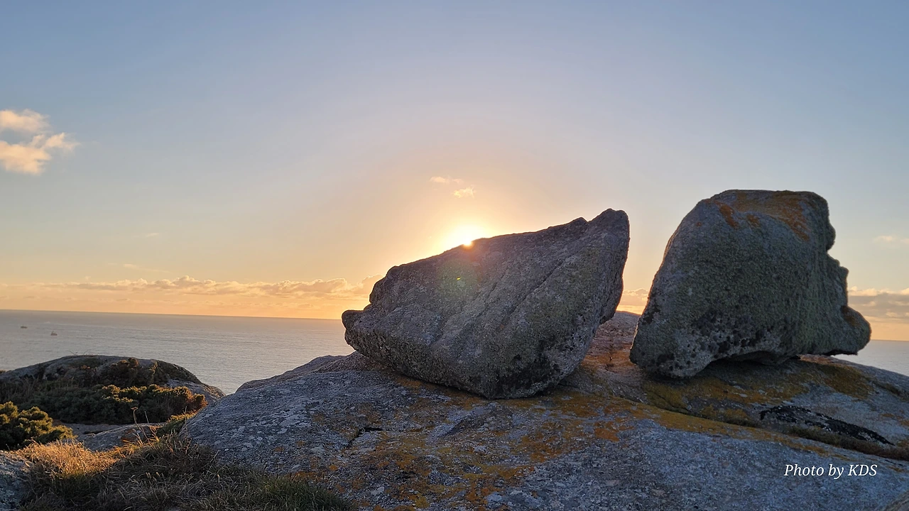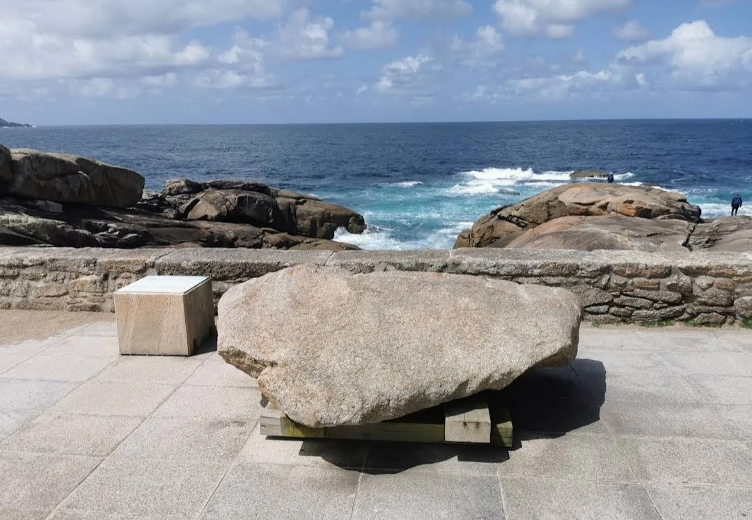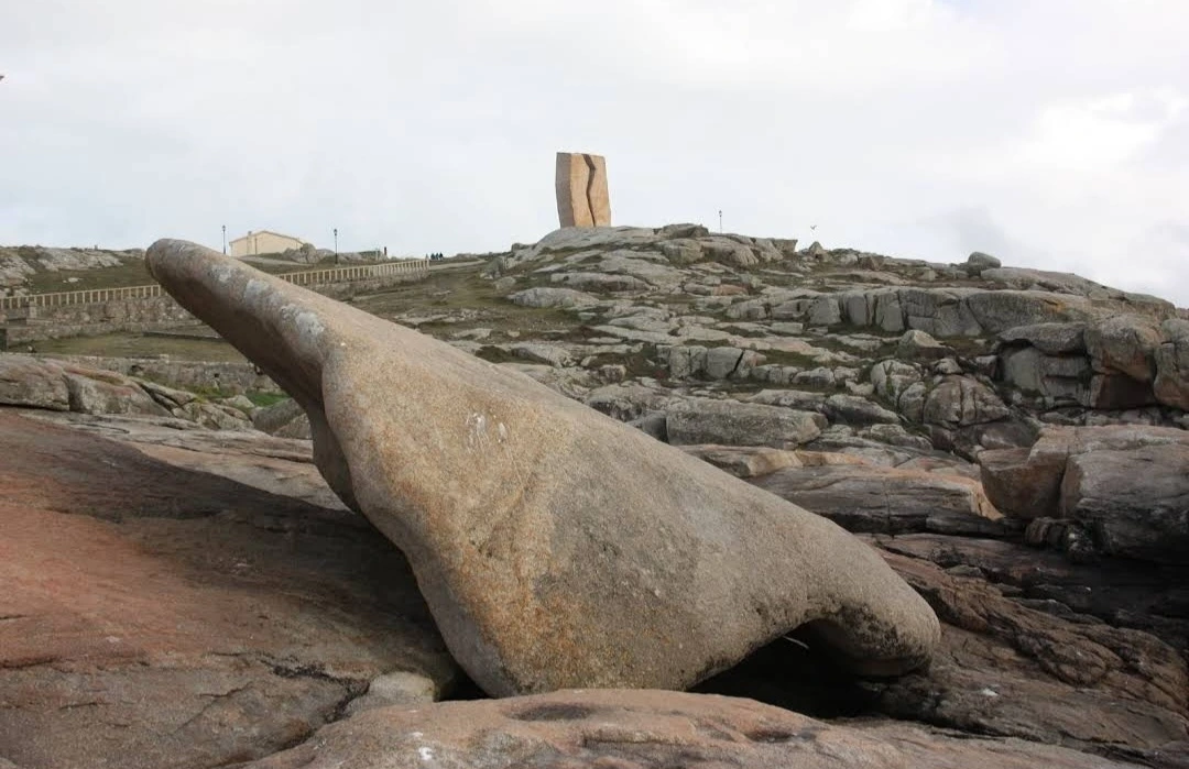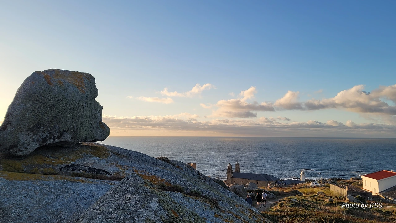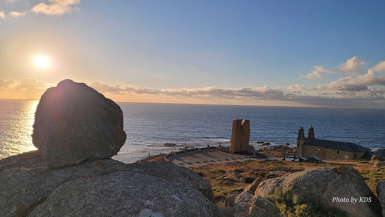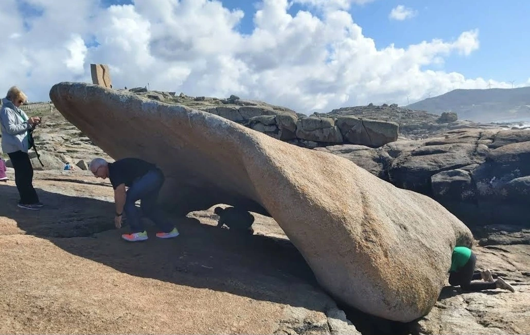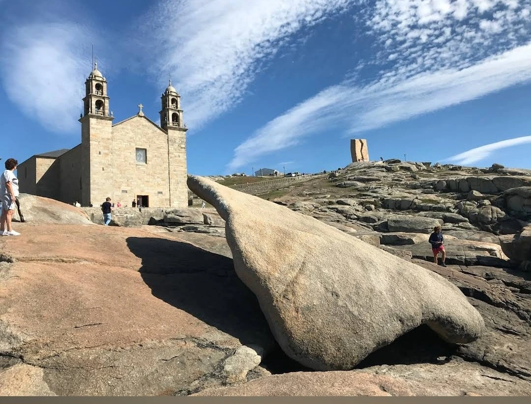 묵시아(Muxia)는 땅끝 마을로 조그마한 바위산의 기슭에 있는 마을인데, 대서양 쪽의 땅끝에 신성한 전설의 바위가 있다. 옛날 성 야고보가 이곳에서 전도를 위한 설교를 하는데 당시 이곳은 이교도들의 지역이라서 전도가 수월하지 않았다. 전도에 힘을 달라고 기도를 하지 성모 마리아가 돌배를 타고 이곳으로 성 야고보를 격려하러 왔다고 한다. 깜짝 놀란 성 야고보는 그 돌배의 일부를 가져다가 지금의 등대 옆에 성소와 제단을 간단하게 차렸다. 그리고 본인도 성모 마리아를 알현하러 예루살렘으로 돌아갔다가 거기서 순교를 당하고 말았다. 나머지 돌배의 일부가 지금 까지 남아있다고 한다. 아래 사진의 제일 첫 번째 것이 그 돌배의 돛이라고 한다. 이름이 Pedra dos Cadris이다. 생긴 모양이 인간의 신장을 닮았다고 한다. 그런데 조선 과객 금삿갓의 눈에는 전혀 그렇게 보이지 않고 커다란 상어의 입처럼 보인다. 큰 백상아리가 먹이를 삼키려고 입을 크게 벌리고 있는 형상이다. 이 바위 밑의 구멍으로 9번을 통과하면 신장병과 허리통증이 완전히 낫는다는 전설이 있다. 실제 어른이든 이이든 이 바위 밑으로 들락날락하고 있었다.