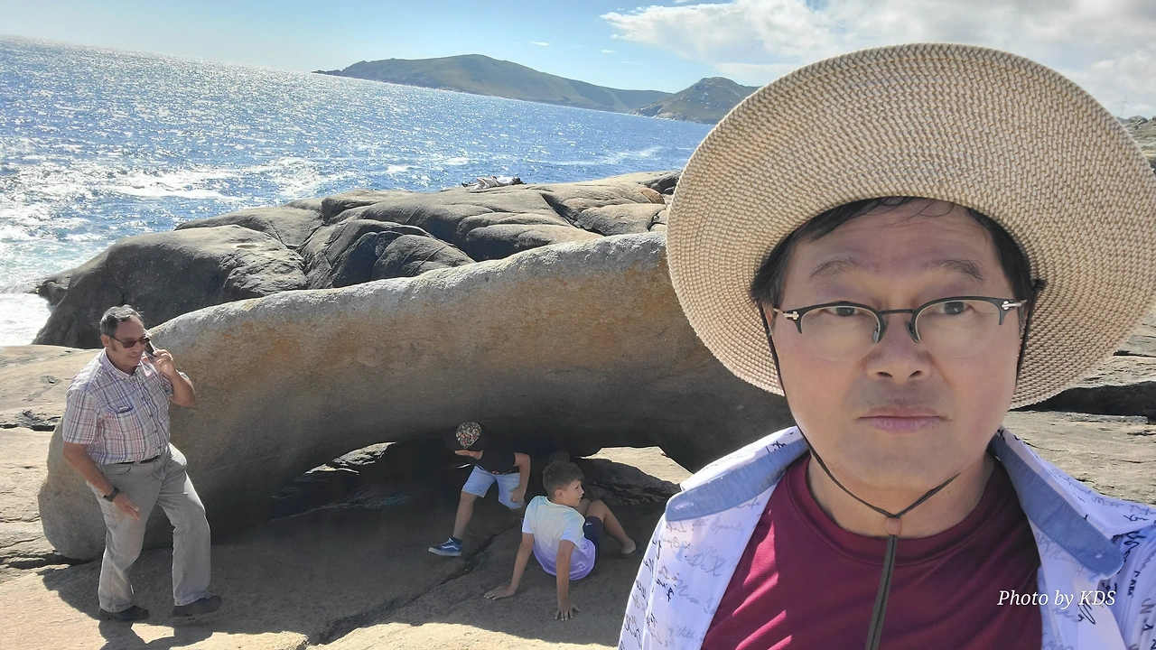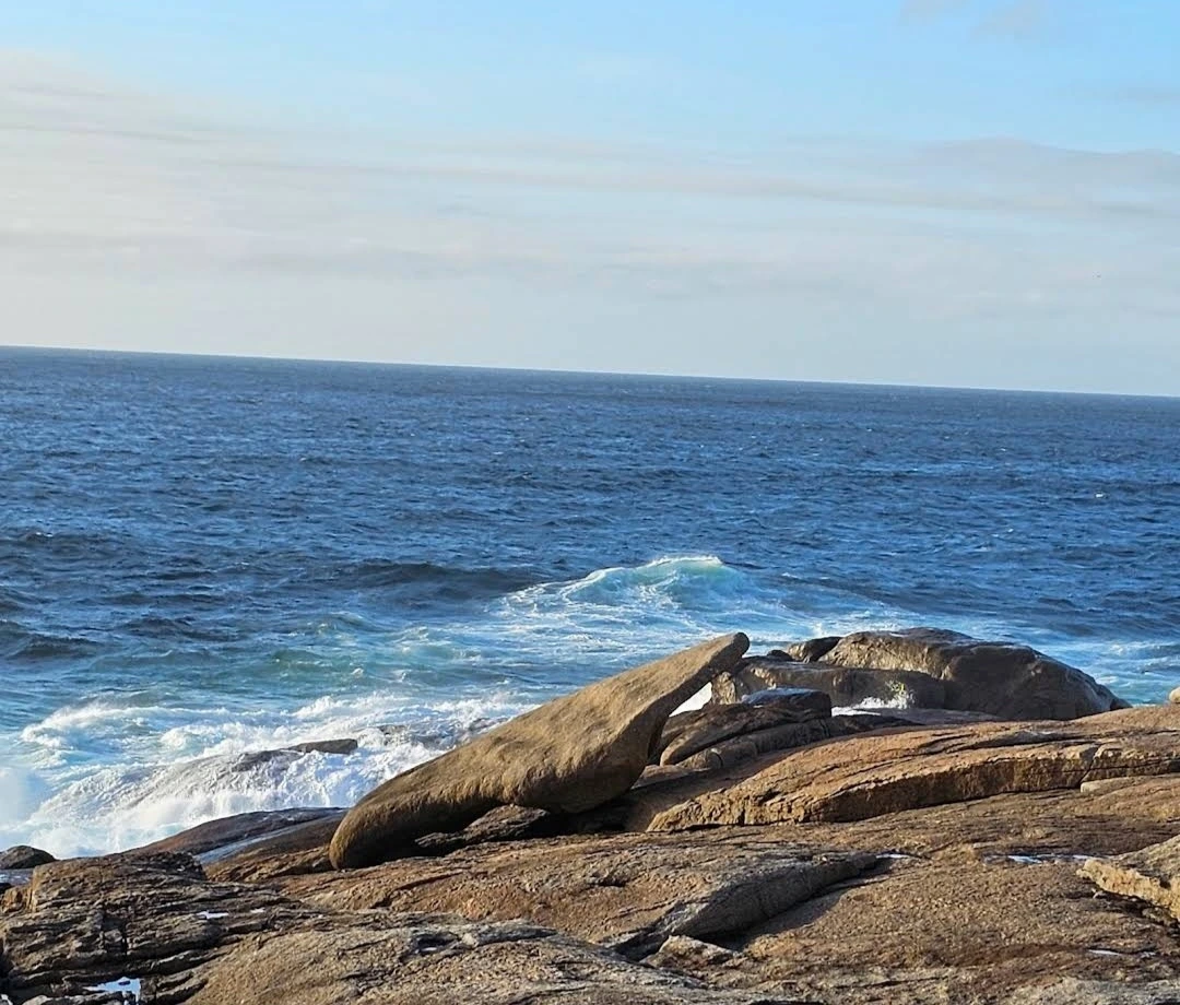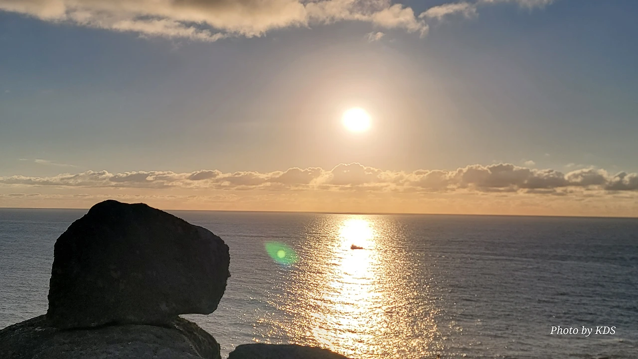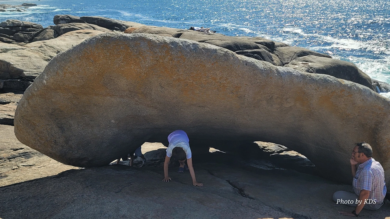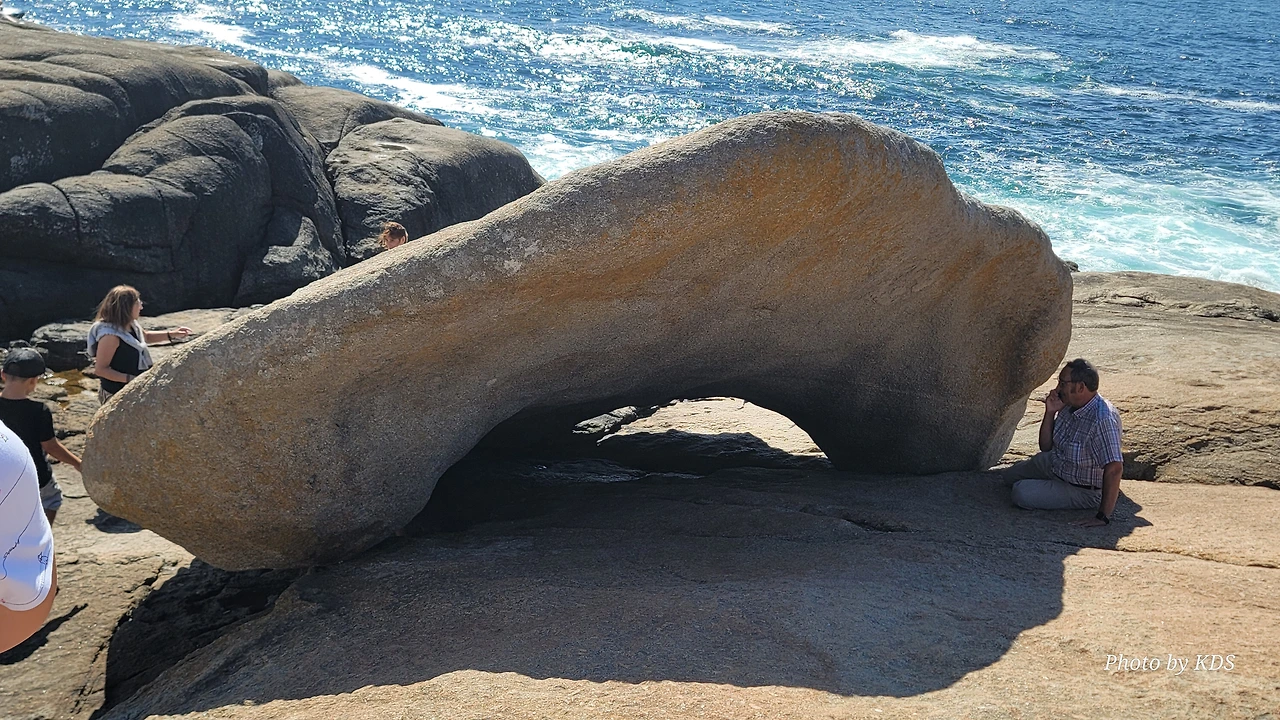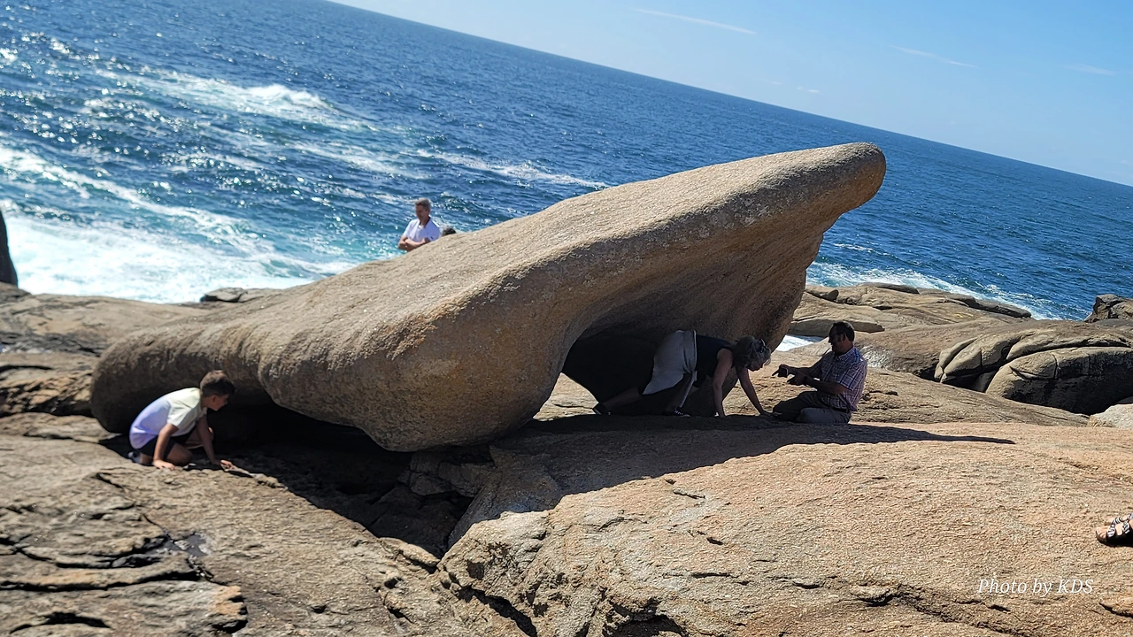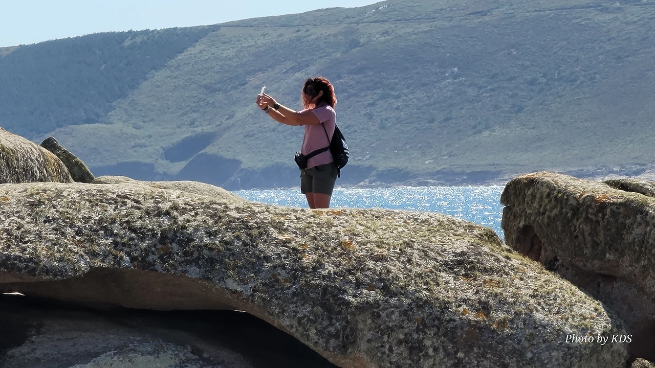 묵시아(Muxia)는 땅끝 마을로 조그마한 바위산의 기슭에 있는 마을인데, 대서양 쪽의 땅끝에 신성한 전설의 바위가 있다. 옛날 성 야고보가 이곳에서 전도를 위한 설교를 하는데 당시 이곳은 이교도들의 지역이라서 전도가 수월하지 않았다. 전도에 힘을 달라고 기도를 하지 성모 마리아가 돌배를 타고 이곳으로 성 야고보를 격려하러 왔다고 한다. 깜짝 놀란 성 야고보는 그 돌배의 일부를 가져다가 지금의 등대 옆에 성소와 제단을 간단하게 차렸다. 그리고 본인도 성모 마리아를 알현하러 예루살렘으로 돌아갔다가 거기서 순교를 당하고 말았다. 나머지 돌배의 일부가 지금 까지 남아있다고 한다. 아래 사진의 제일 첫 번째 것이 그 돌배의 돛이라고 한다. 이름이 Pedra dos Cadris이다. 생긴 모양이 인간의 신장을 닮았다고 한다. 그런데 조선 과객 금삿갓의 눈에는 전혀 그렇게 보이지 않고 커다란 상어의 입처럼 보인다. 큰 백상아리가 먹이를 삼키려고 입을 크게 벌리고 있는 형상이다. 이 바위 밑의 구멍으로 9번을 통과하면 신장병과 허리통증이 완전히 낫는다는 전설이 있다. 실제 어른이든 이이든 이 바위 밑으로 들락날락하고 있었다.