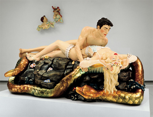 그는 일련의 작품군(作品群)을 <Made in Heaven>으로 포장하여 세상과 소통한다. 그중 한 두 작품을 예로 보자. <Dirty - Jeff on Top>과 <Jeff and Ilona>는 작품의 구도가 비슷하다. 바위처럼 생긴 단상 위에 일로나가 누워있고, 제프는 그녀 위로 올라간다. 그리고 아무런 내색 없이 그녀와 함께 성행위에 열중하는 것이다. 언뜻 제프는 오로지 그녀와 자신만의 세계에 몰입하여 모든 거추장스러운 관습에서 드디어 해방된 것 같다. 두 작품이 조금 다른 것은 주변의 도구이다. 하나는 황금색 구렁이가 혀를 날름거리며 두 사람의 사랑의 침상을 지키고 있다. 그가 <천사들>이라고 이름 붙인 어린아이들이 그들의 애정 행각을 내려다보지는 않지만 자기들끼리 눈짓을 주고받으면 함께하고 있다. 이것은 마치 인간의 원죄(原罪)인 뱀의 황홀한 유혹을 뿌리치지 못하여 후손을 만들기 위해 성행위를 하고, 그 행위에서 열락을 얻는 근원적인 의식의 표현처럼 보인다.