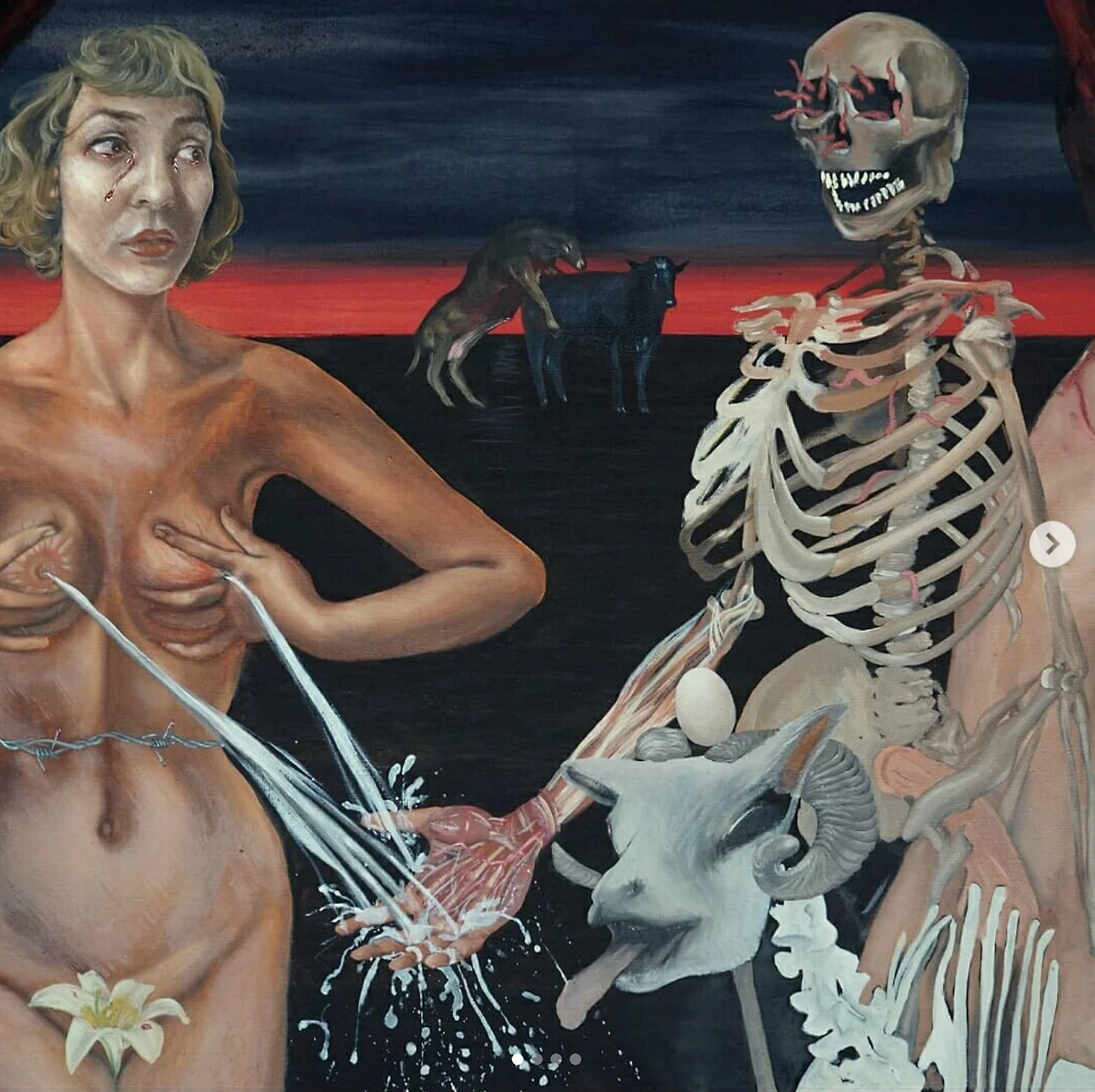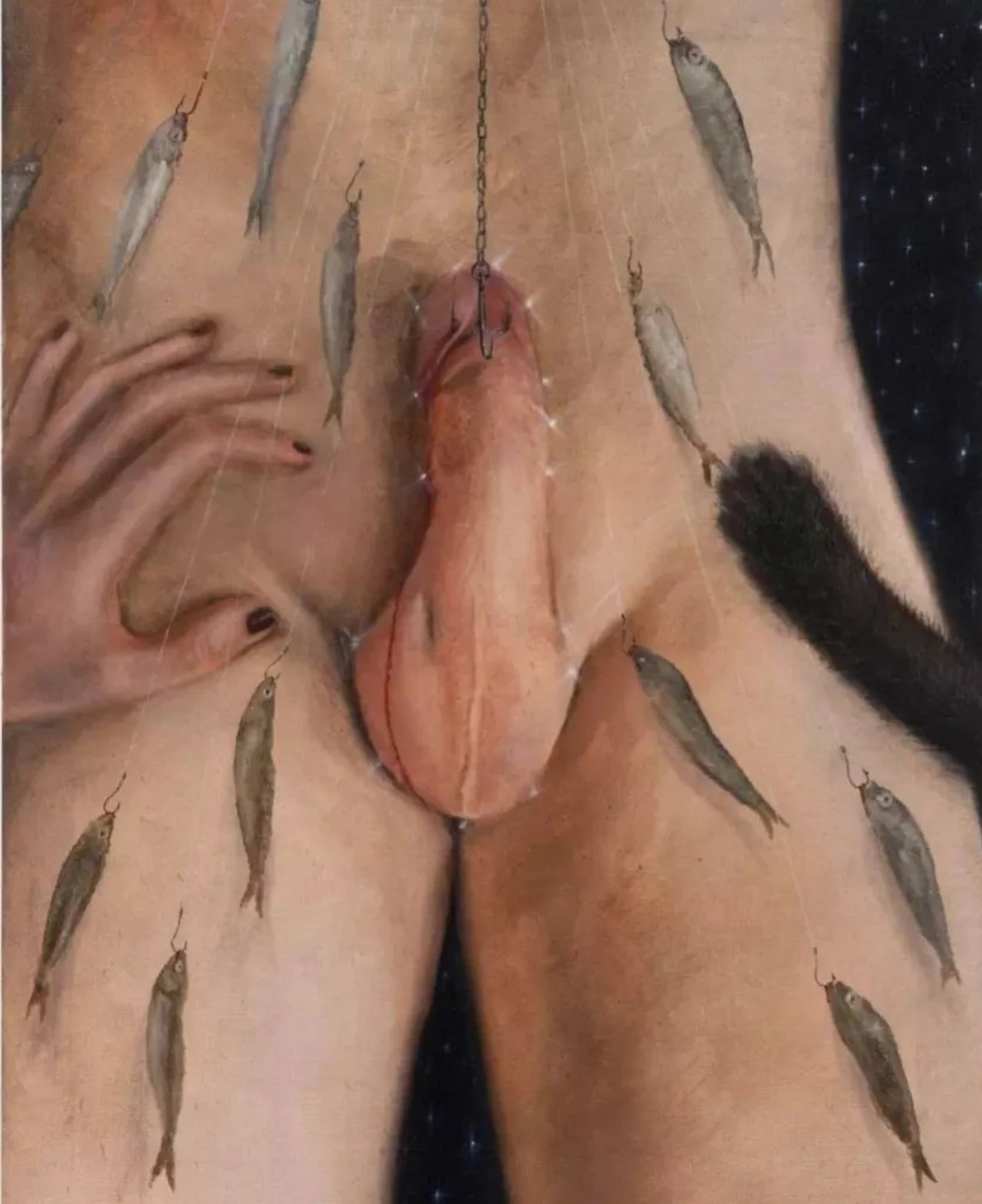 여성의 가녀린 손이 남성의 음경을 잡고 그 아래 부분을 노출시키고 있다. 손톱은 검정 매니큐어를 칠하고 그녀의 손가락 끝을 통해 구세주처럼 십자가에 못 박혀서 고정되어 있다. 그 사이로 손가락에서 나온 것인지 음경에서 나온 것인지 모를 소량의 피가 한 가닥 실처럼 아래로 흘러내린다. 여성의 손목에는 십자가가 있는 팔찌가 걸려 있다. 폴란드 젊은 화가 아가타 슬로박(Agata Slowak)의 <영원한 안식(R.I.P.)>이다. 바로 옆은 핏 줄기만 더 많이 흘러내리는 비슷한 구도의 작품이다. 그녀는 자기의 그림에 대하여 이렇게 표현한다. “내 그림에는 야생 동물의 본능, 어두운 욕망, 육욕적 충동이 만난다. 나는 억압적인 가부장적 태도와 수세기에 걸쳐 예술계에서 여성의 지위에 대한 관찰을 통해 그림에서 이 주제를 다루도록 격려받았다. 나의 그림은 과도한 노출, 섹스, 가톨릭 교회와 젠더에 대한 비판이 여전히 폴란드에서 스캔들을 불러일으키고 있다는 사실에 대한 반대를 표명하는 것이다.” 바로 밑에 있는 그녀의 비슷한 작품 <음경 별자리(Penis Constellation-Kitty Paw)>도 남성의 음경에 낚시 바늘을 걸어서 들어 올리고, 수많은 물고기들도 같이 낚시에 걸려 있다.
