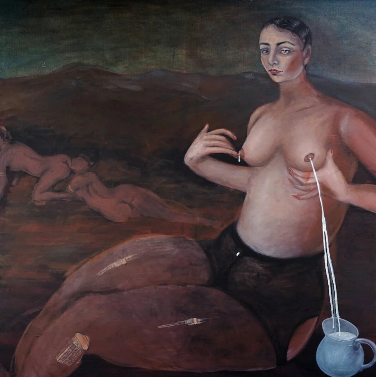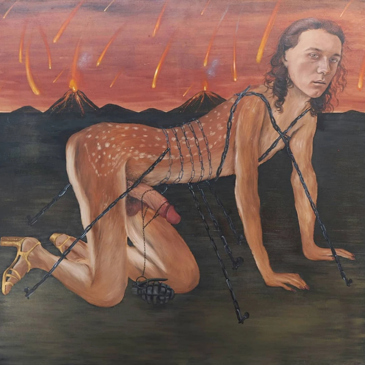 아래 작품은 <은하수(Milky way)>이다. 반라의 여인이 젖가슴을 주물러 젖을 분수처럼 짜서 젖병에 담는다. 뒤쪽에는 발가벗은 사람들이 커닐링구스 자세로 무언가를 열중하고 있다. 마지막 작품은 쇠사슬이 묶인 전라의 남성이 하이힐을 신고 말처럼 엎드려 있다. 거대한 남성의 음경이 말의 그것을 상징하는 듯 하다. 등판은 마치 꽃사슴의 등처럼 장식되어 있다.