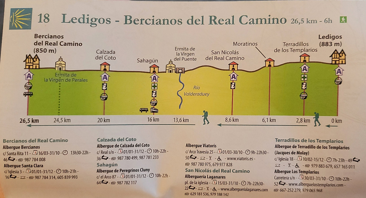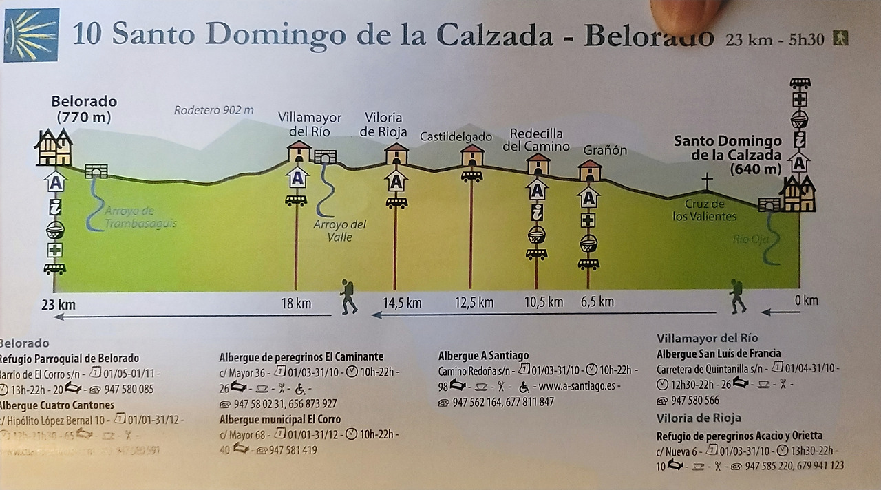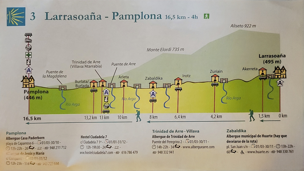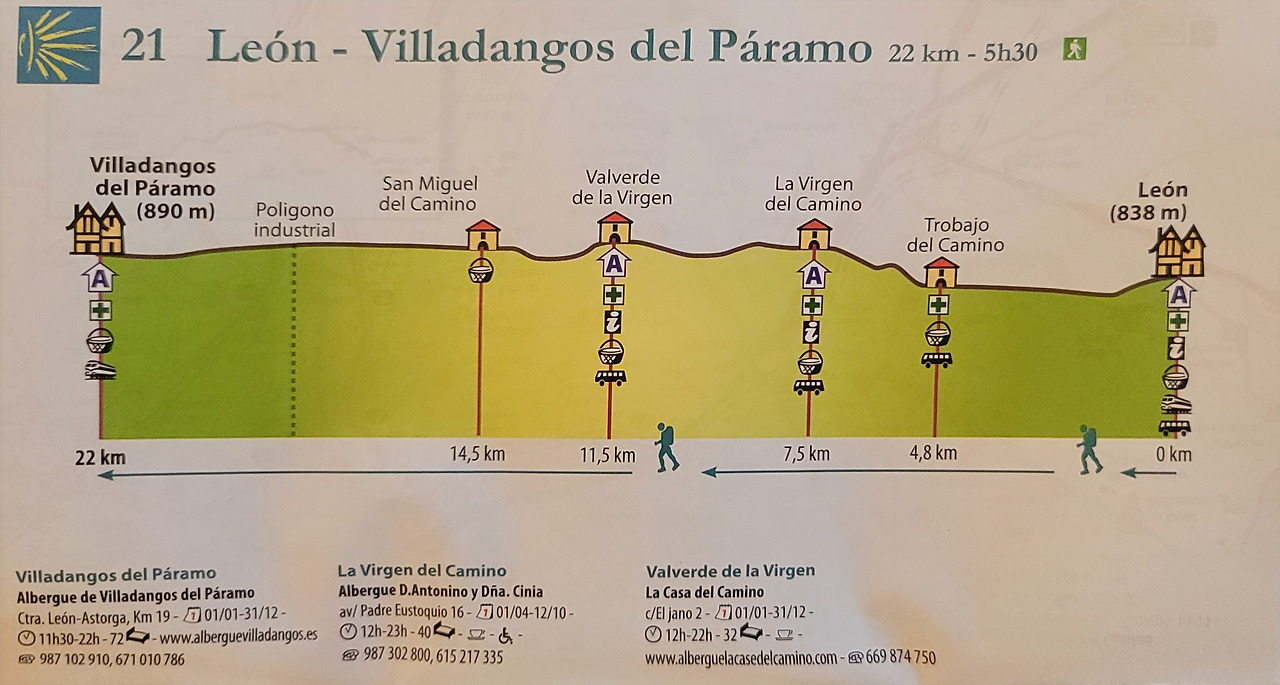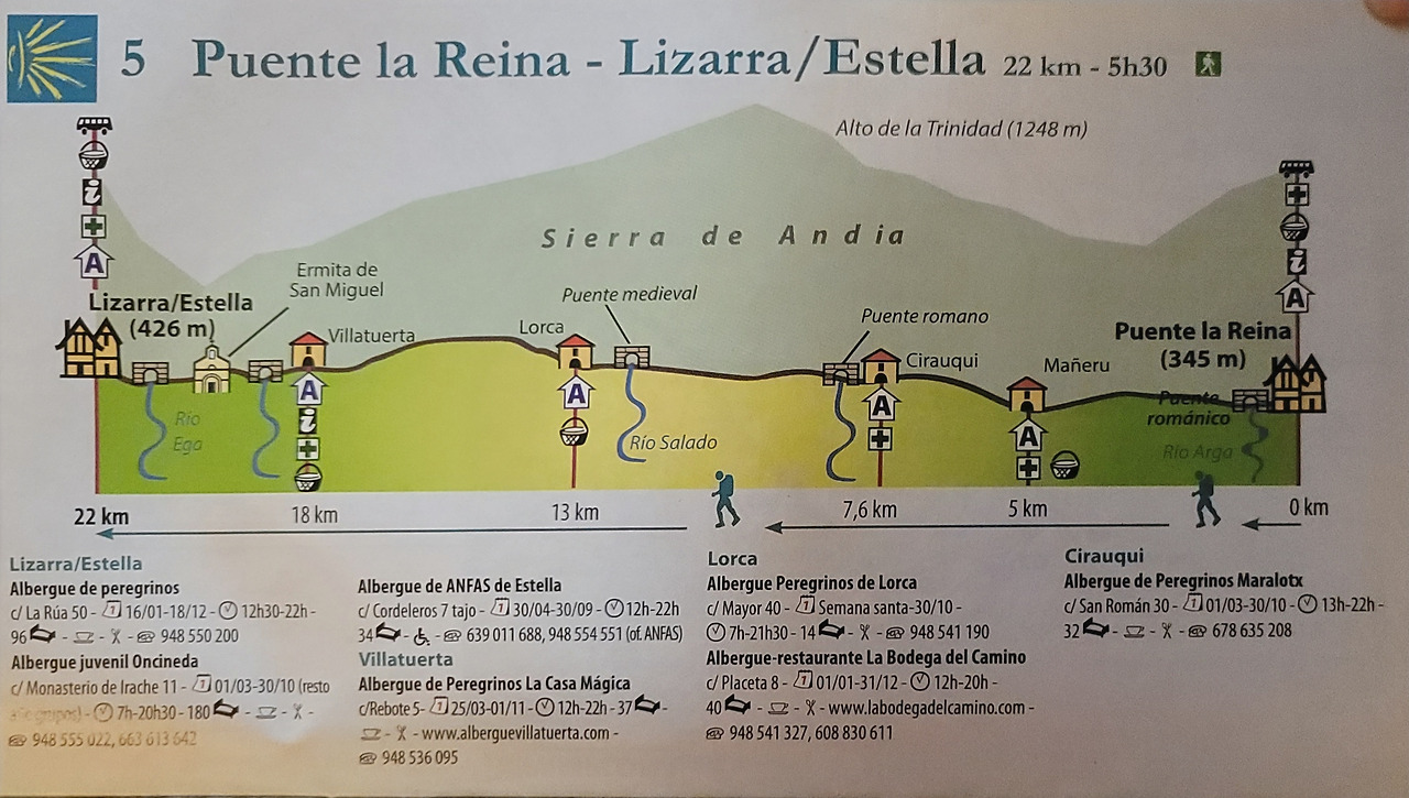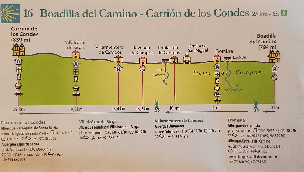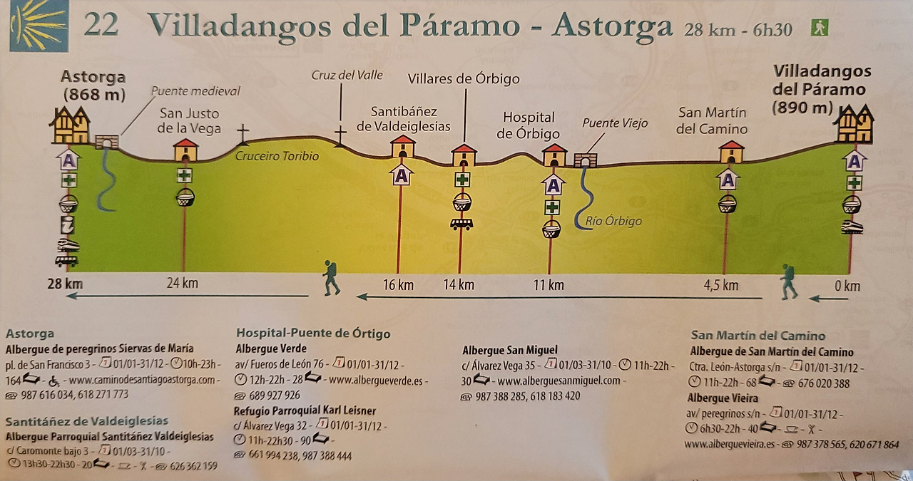 이 지도는 매일 일차별(日次別) 걷기에 도움이 될 수 있도록 800Km 전구간을 적당한 거리로 나누어서 순례에 도움이될만한 정보를 상세히 표기한 지도이다. 구간별 거리, 지나는 마을, 이용 가능한 시설(알베르게, 상점, 약국, 교통), 중간의 유적지, 지나는 길의 고도(高度), 다리 등을 비교적 자세히 표시해 놓아서 순례객의 나침판 역할을 한다. 꼭 이대로 걷지 않고 순례자의 능력에 따라 적당히 조정해서 걸으면 된다. 조선 과객 금삿갓은 30일에 완주를 하였다.