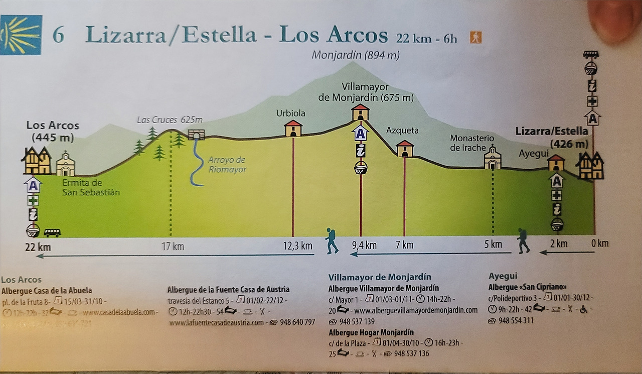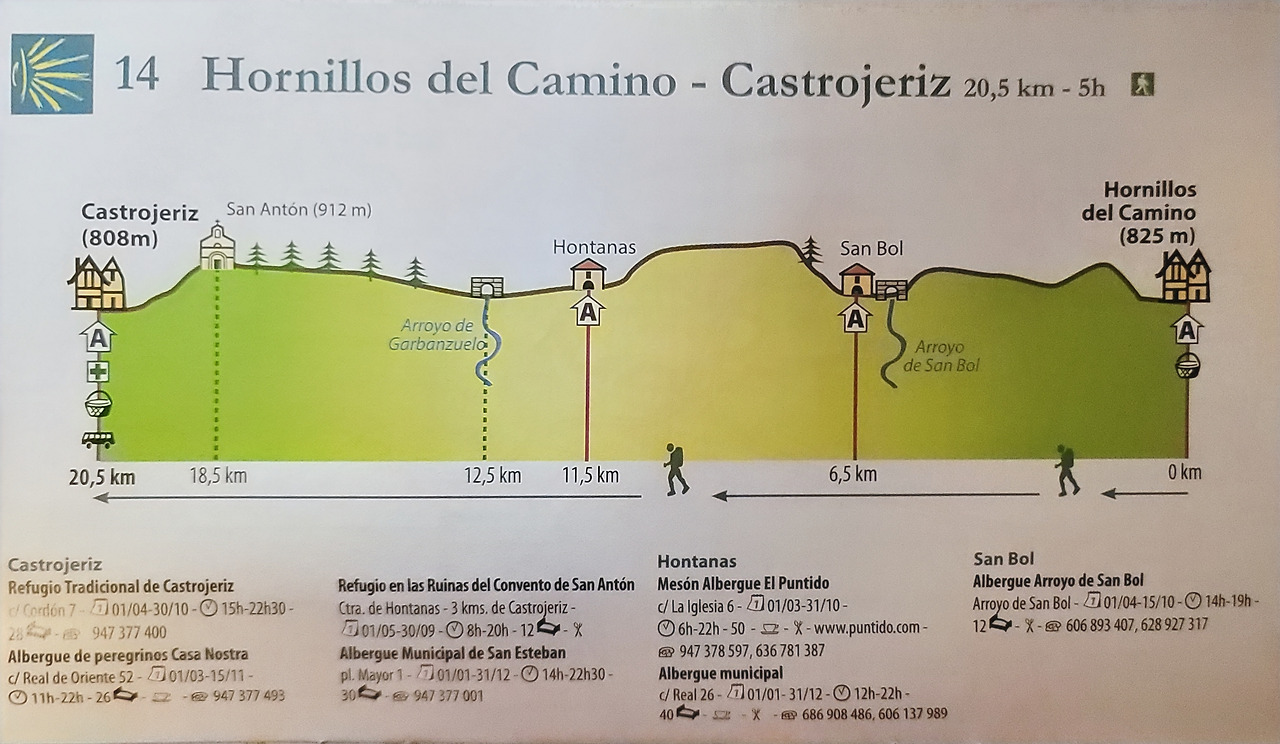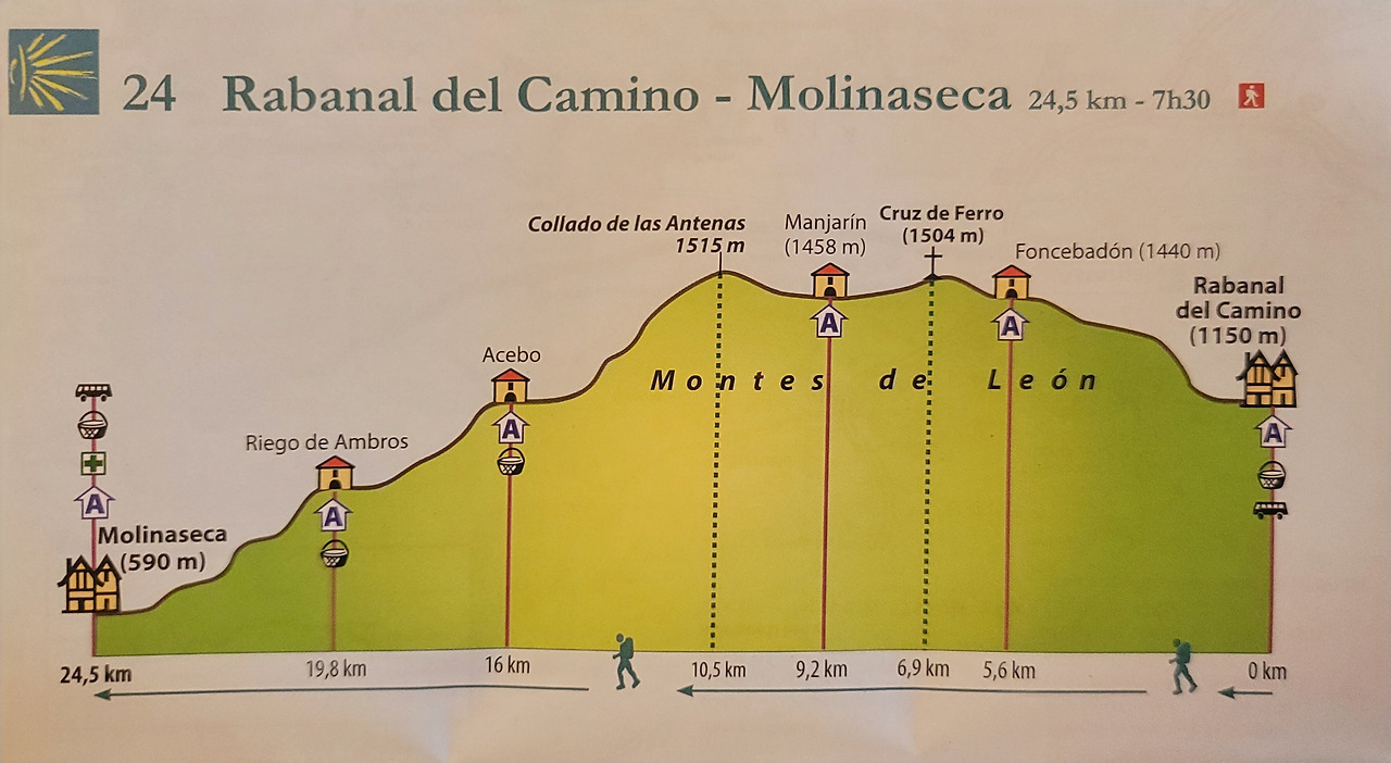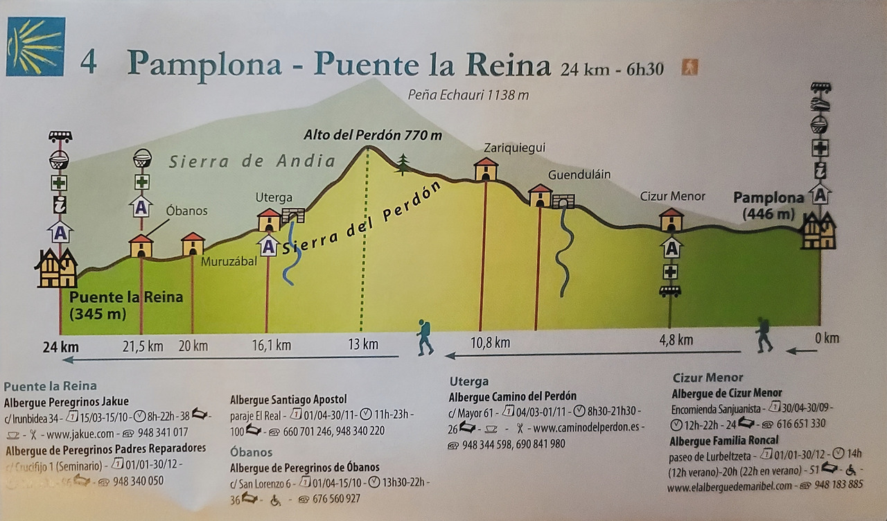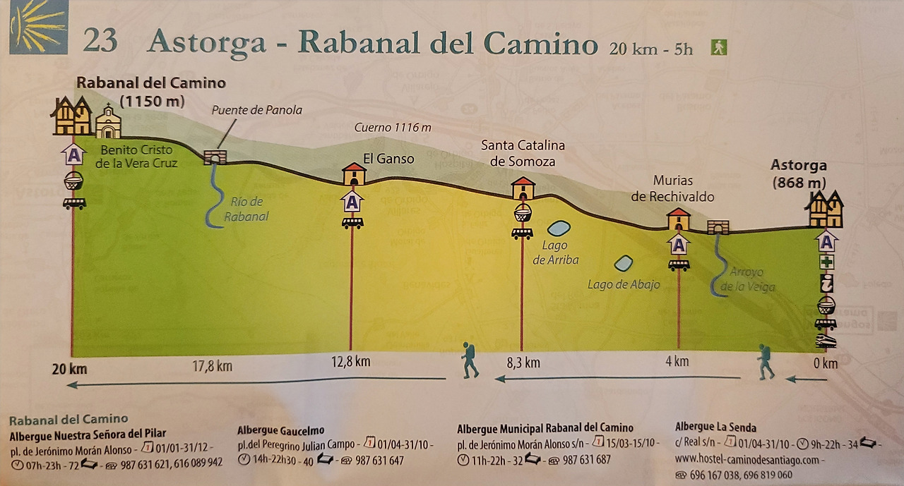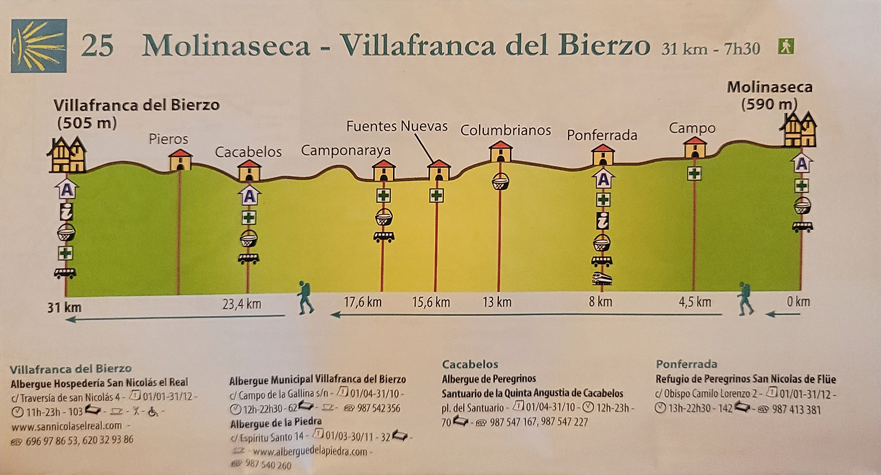 이 지도는 매일 일차별(日次別) 걷기에 도움이 될 수 있도록 800Km 전구간을 적당한 거리로 나누어서 순례에 도움이될만한 정보를 상세히 표기한 지도이다. 구간별 거리, 지나는 마을, 이용 가능한 시설(알베르게, 상점, 약국, 교통), 중간의 유적지, 지나는 길의 고도(高度), 다리 등을 비교적 자세히 표시해 놓아서 순례객의 나침판 역할을 한다. 꼭 이대로 걷지 않고 순례자의 능력에 따라 적당히 조정해서 걸으면 된다. 조선 과객 금삿갓은 30일에 완주를 하였다.