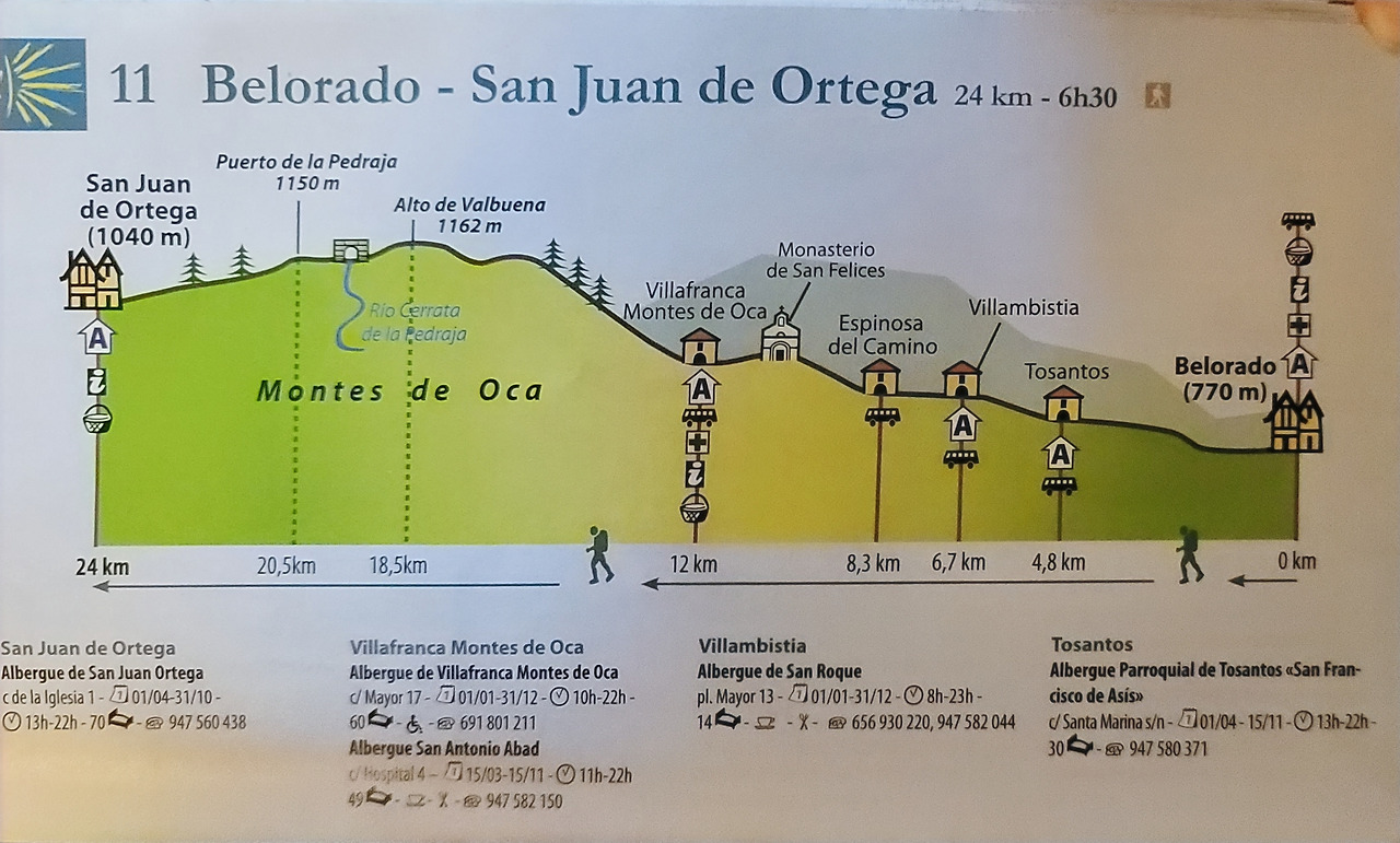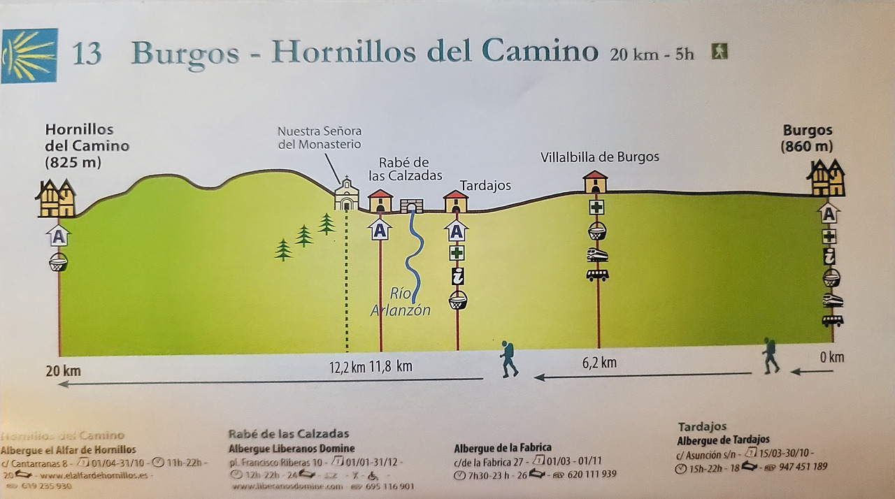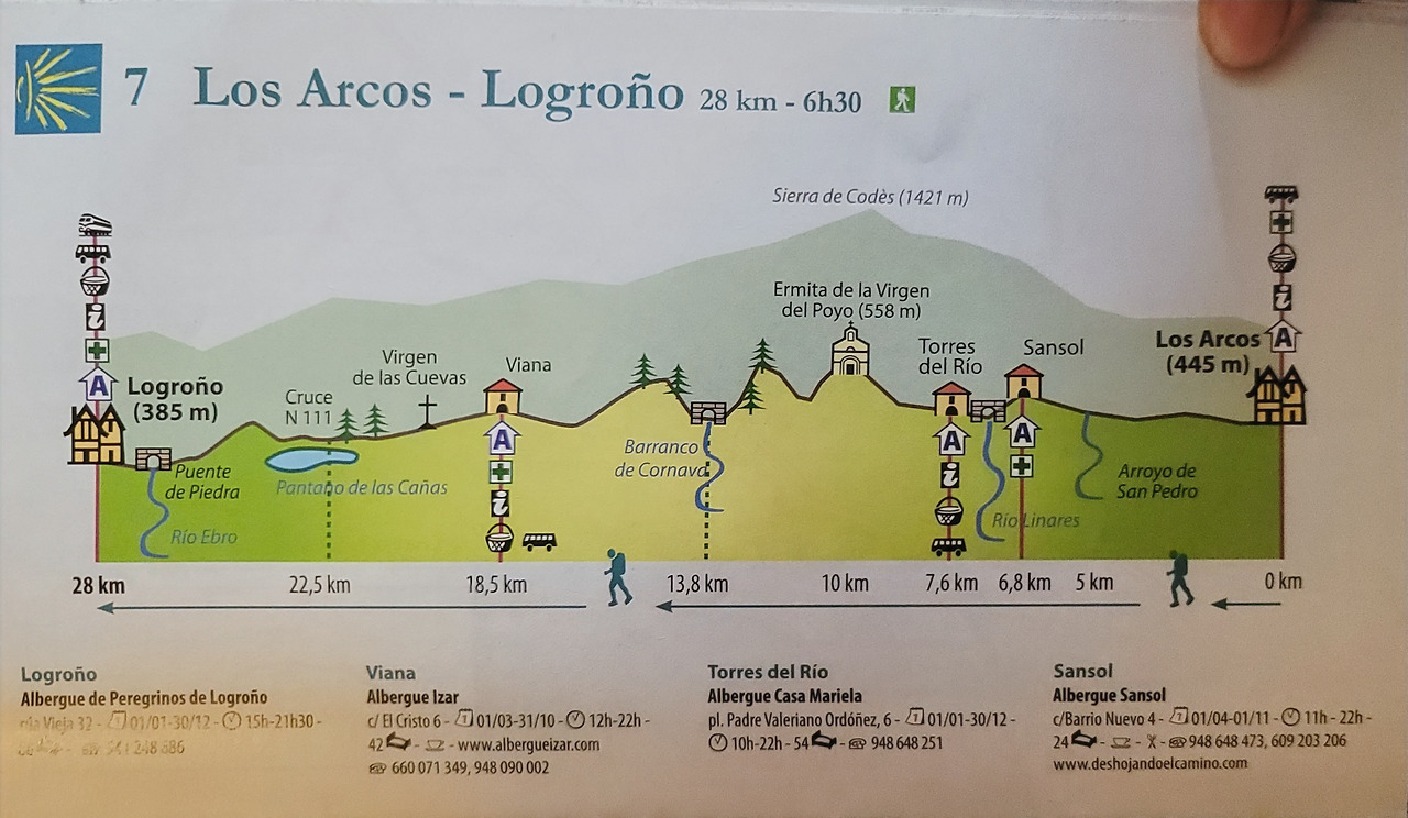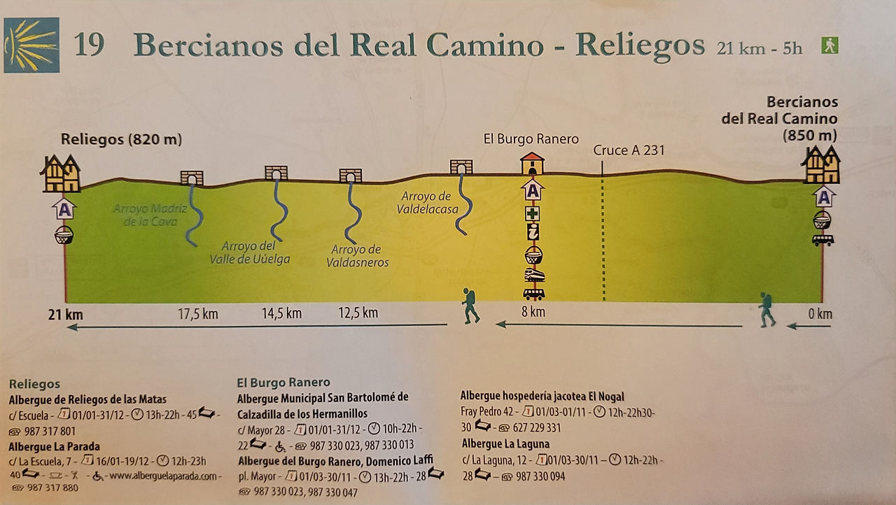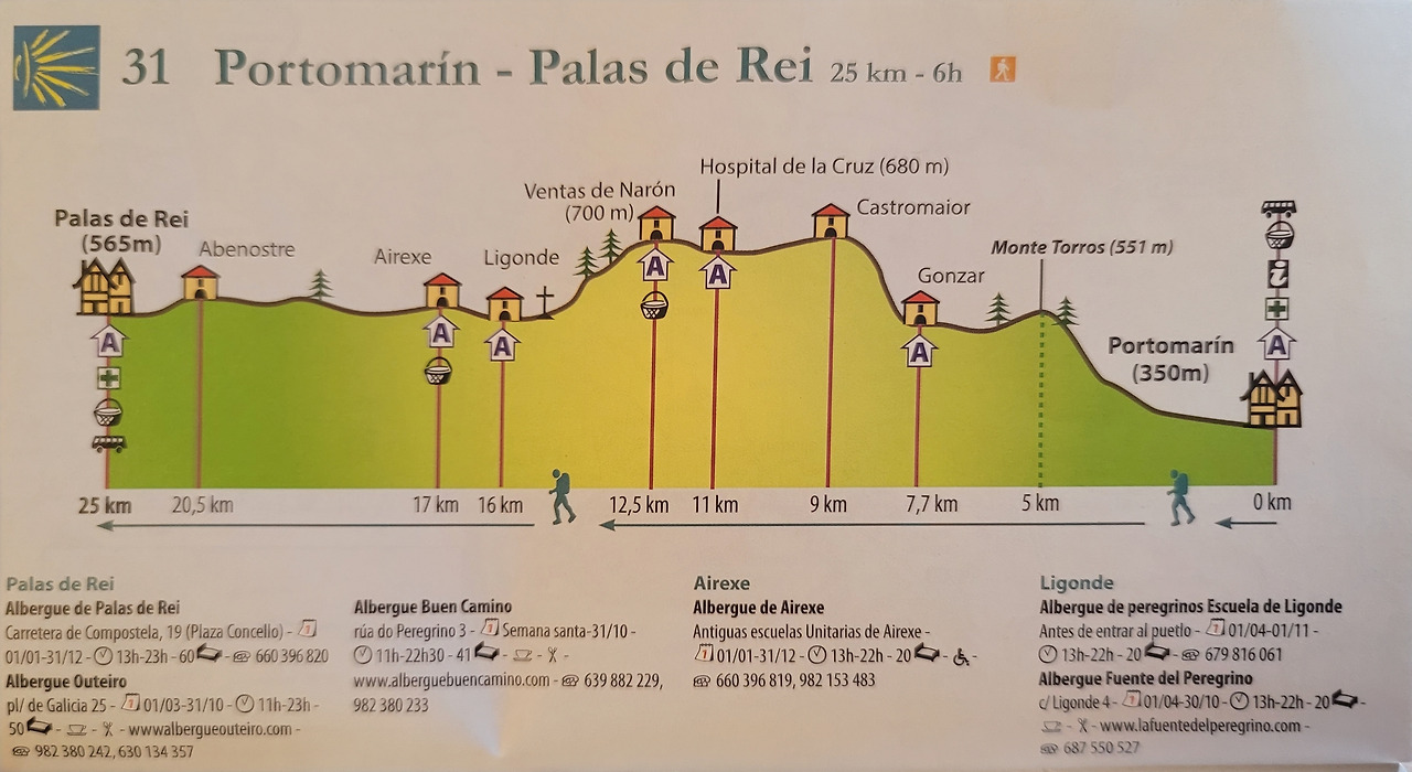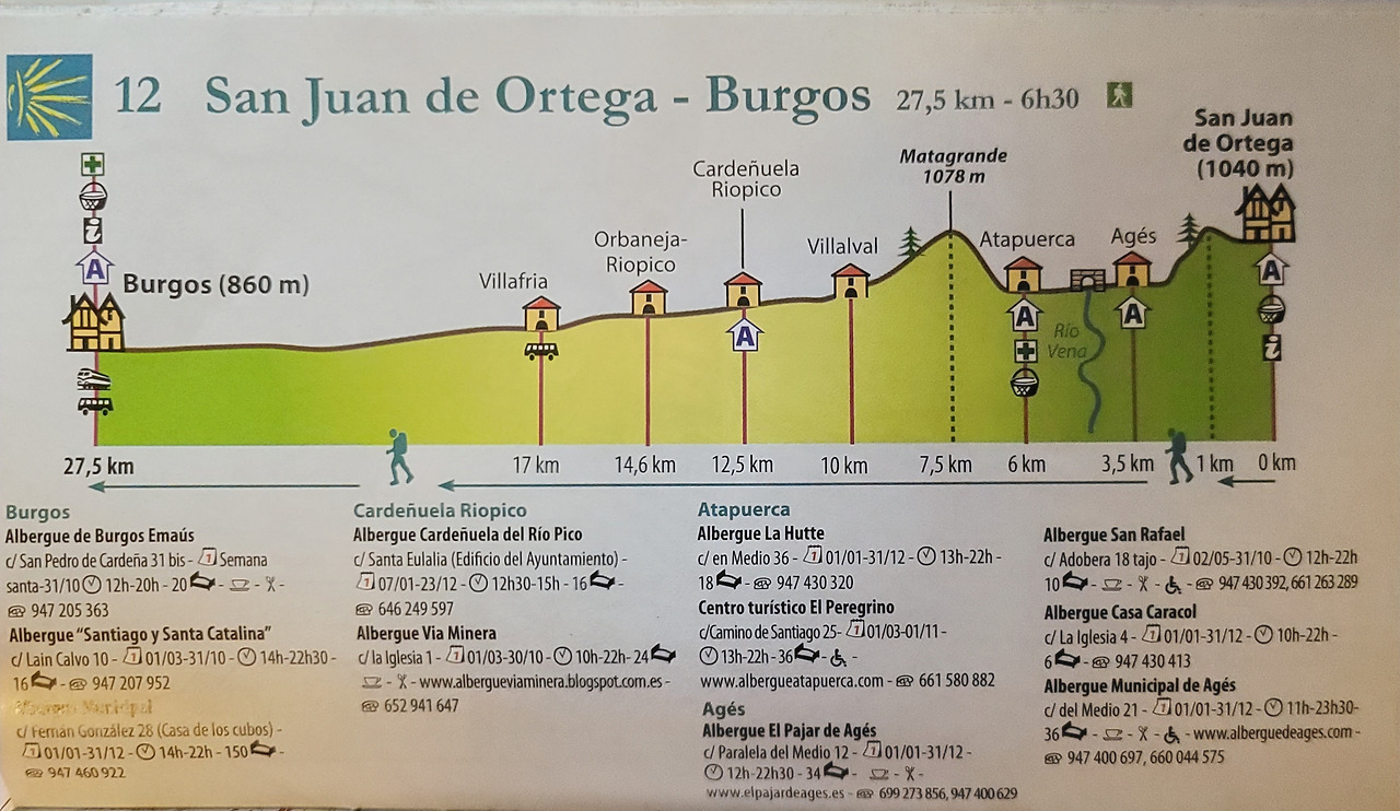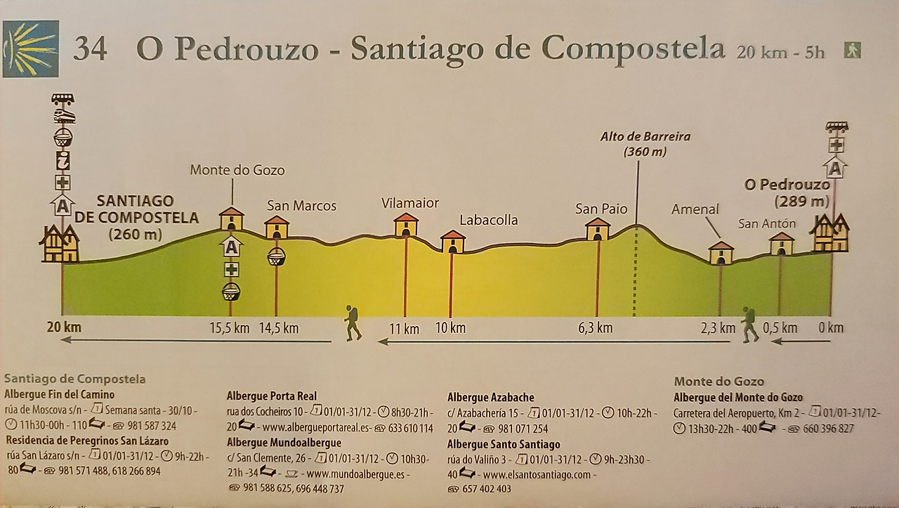 이 지도는 매일 일차별(日次別) 걷기에 도움이 될 수 있도록 800Km 전구간을 적당한 거리로 나누어서 순례에 도움이될만한 정보를 상세히 표기한 지도이다. 구간별 거리, 지나는 마을, 이용 가능한 시설(알베르게, 상점, 약국, 교통), 중간의 유적지, 지나는 길의 고도(高度), 다리 등을 비교적 자세히 표시해 놓아서 순례객의 나침판 역할을 한다. 꼭 이대로 걷지 않고 순례자의 능력에 따라 적당히 조정해서 걸으면 된다. 조선 과객 금삿갓은 30일에 완주를 하였다.