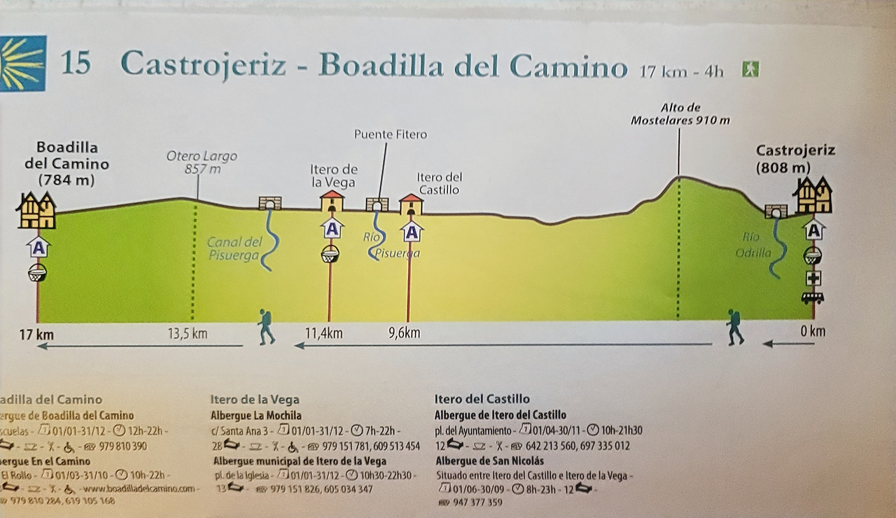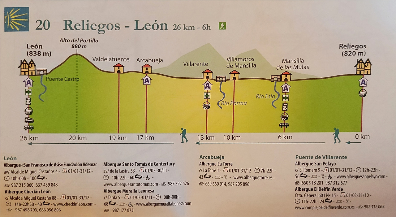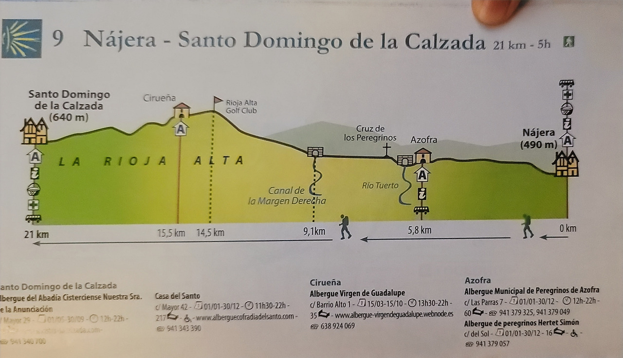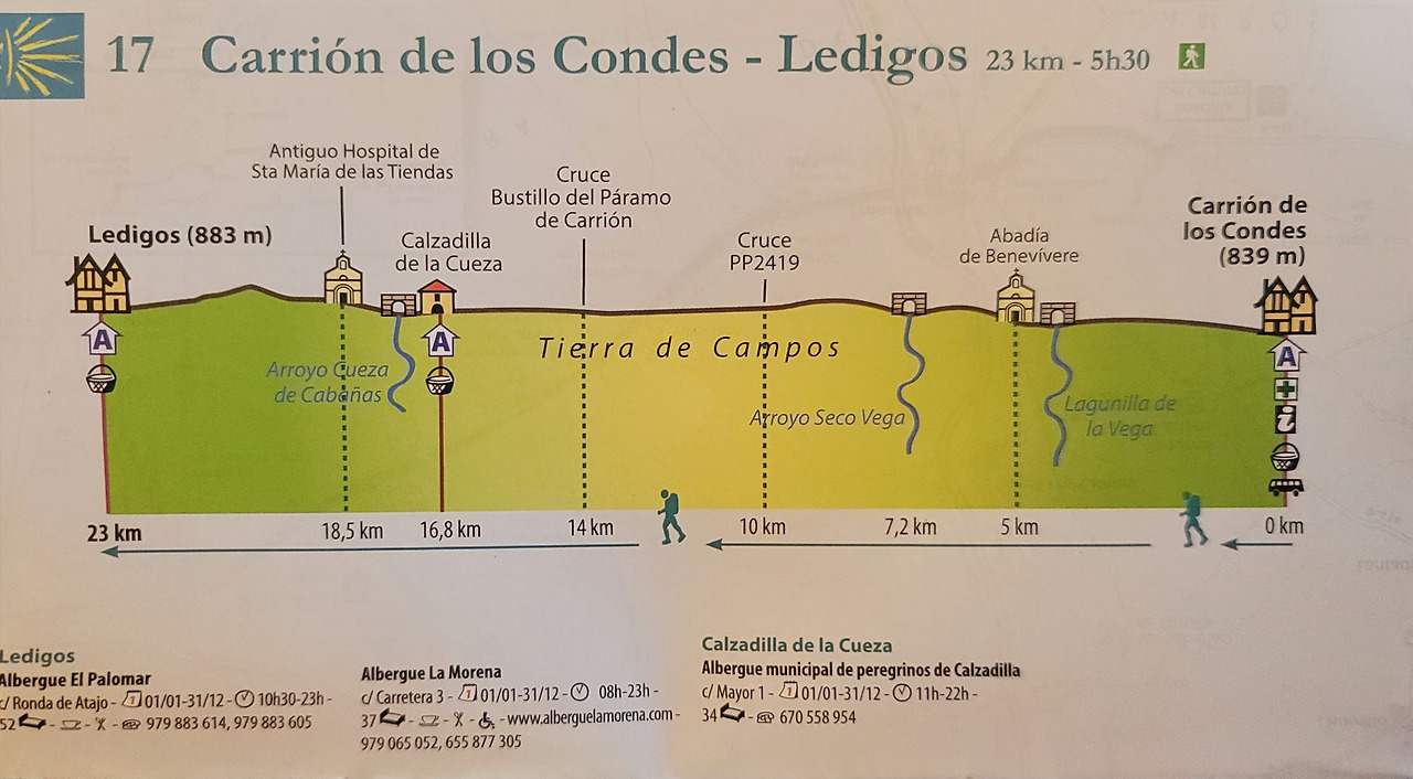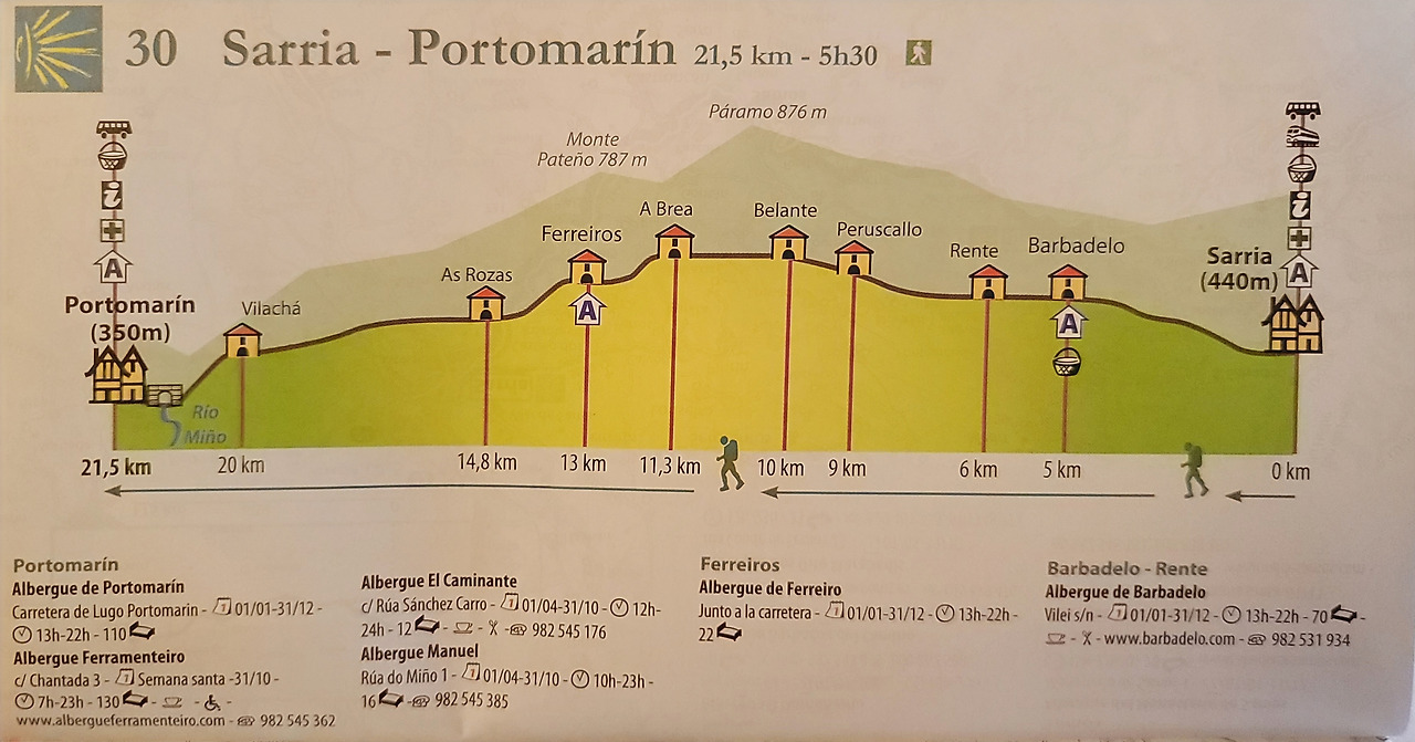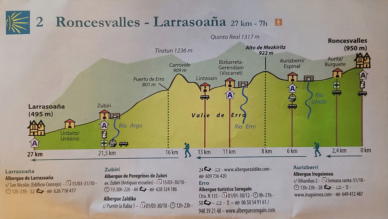 이 지도는 매일 일차별(日次別) 걷기에 도움이 될 수 있도록 800Km 전구간을 적당한 거리로 나누어서 순례에 도움이될만한 정보를 상세히 표기한 지도이다. 구간별 거리, 지나는 마을, 이용 가능한 시설(알베르게, 상점, 약국, 교통), 중간의 유적지, 지나는 길의 고도(高度), 다리 등을 비교적 자세히 표시해 놓아서 순례객의 나침판 역할을 한다. 꼭 이대로 걷지 않고 순례자의 능력에 따라 적당히 조정해서 걸으면 된다. 조선 과객 금삿갓은 30일에 완주를 하였다.