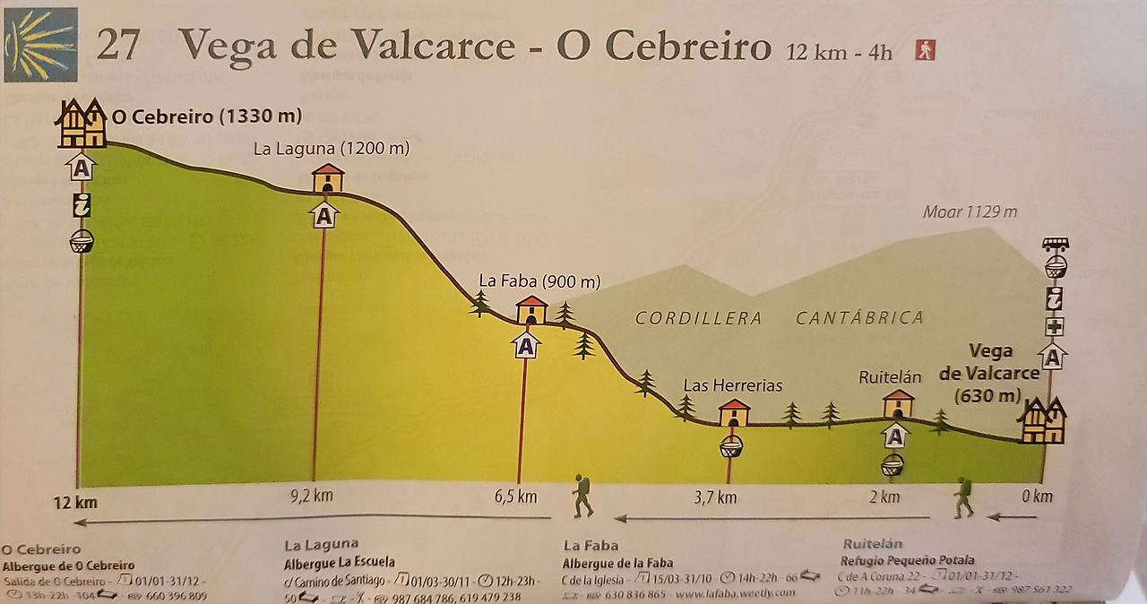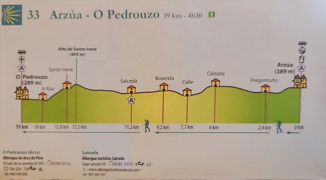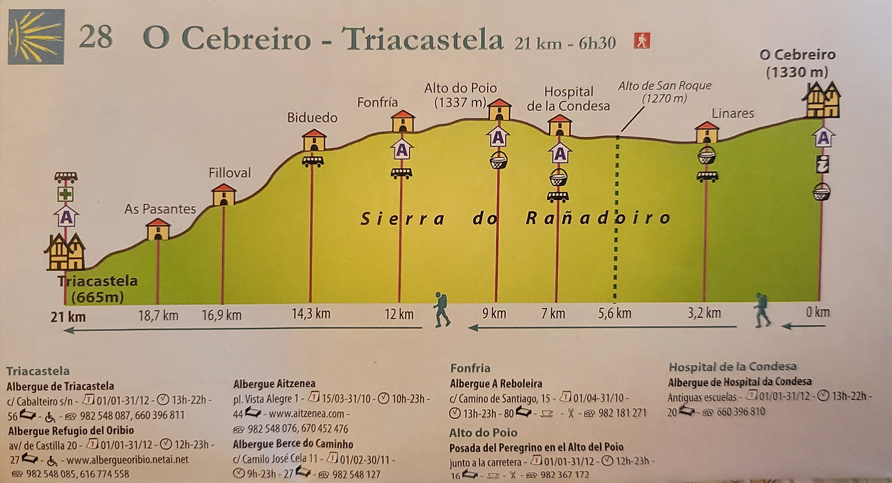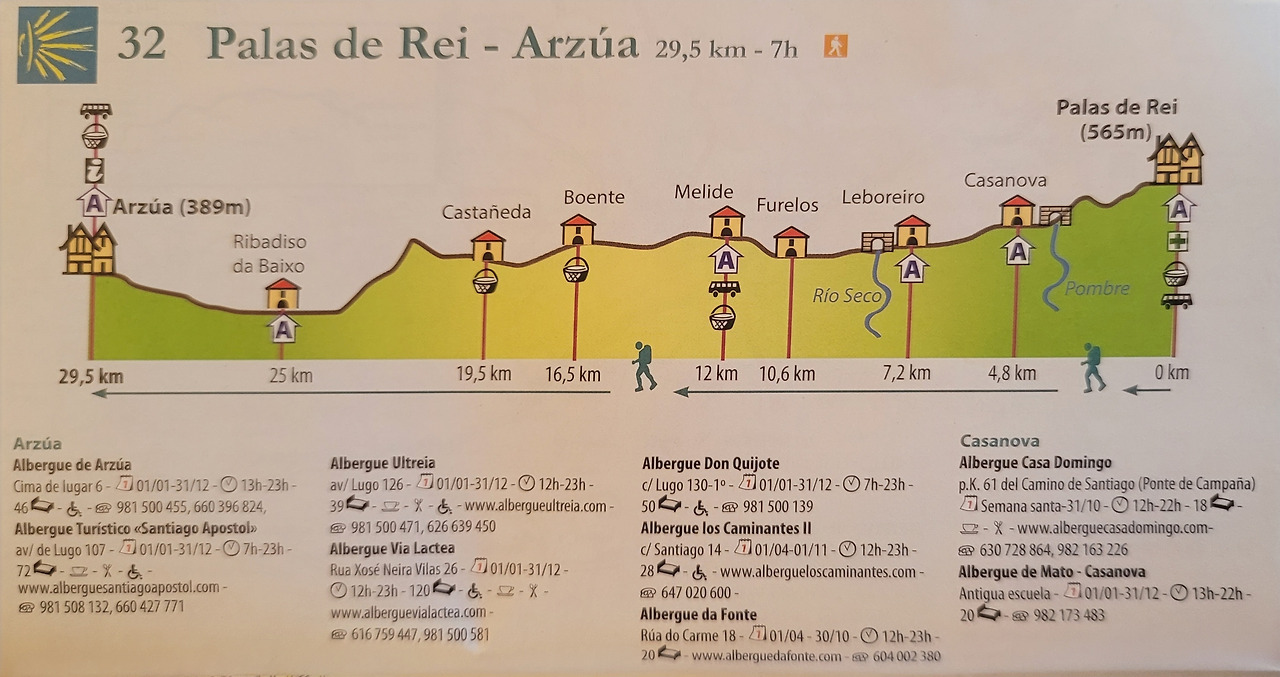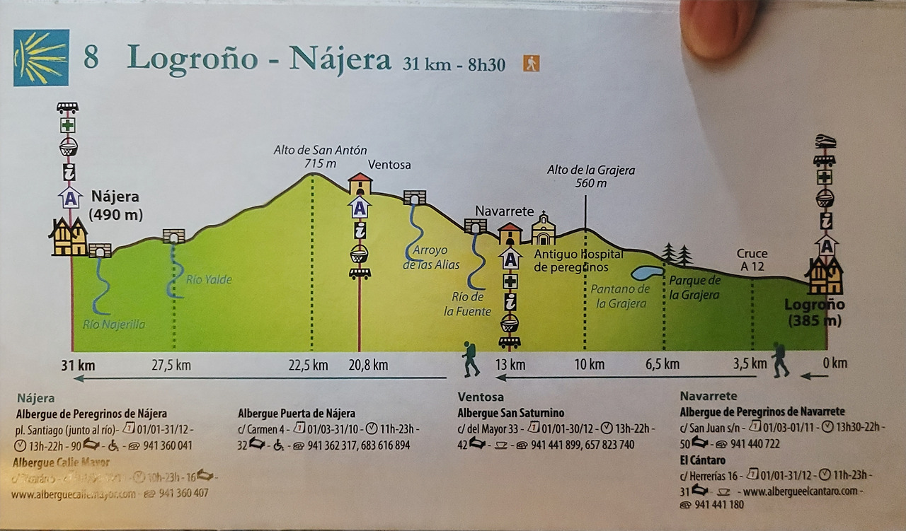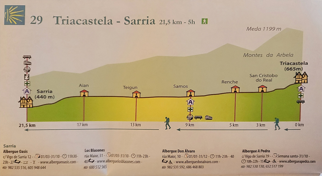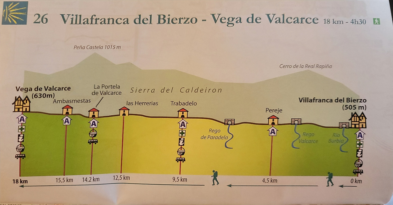 이 지도는 매일 일차별(日次別) 걷기에 도움이 될 수 있도록 800Km 전구간을 적당한 거리로 나누어서 순례에 도움이될만한 정보를 상세히 표기한 지도이다. 구간별 거리, 지나는 마을, 이용 가능한 시설(알베르게, 상점, 약국, 교통), 중간의 유적지, 지나는 길의 고도(高度), 다리 등을 비교적 자세히 표시해 놓아서 순례객의 나침판 역할을 한다. 꼭 이대로 걷지 않고 순례자의 능력에 따라 적당히 조정해서 걸으면 된다. 조선 과객 금삿갓은 30일에 완주를 하였다.