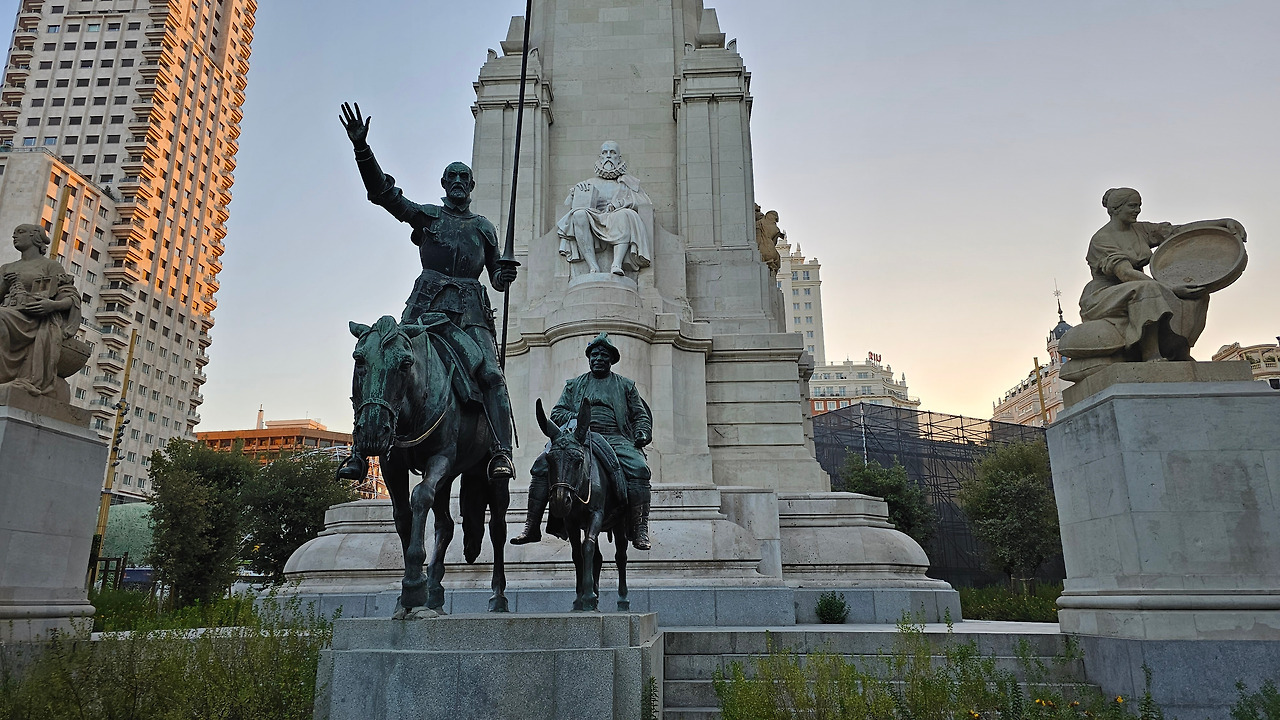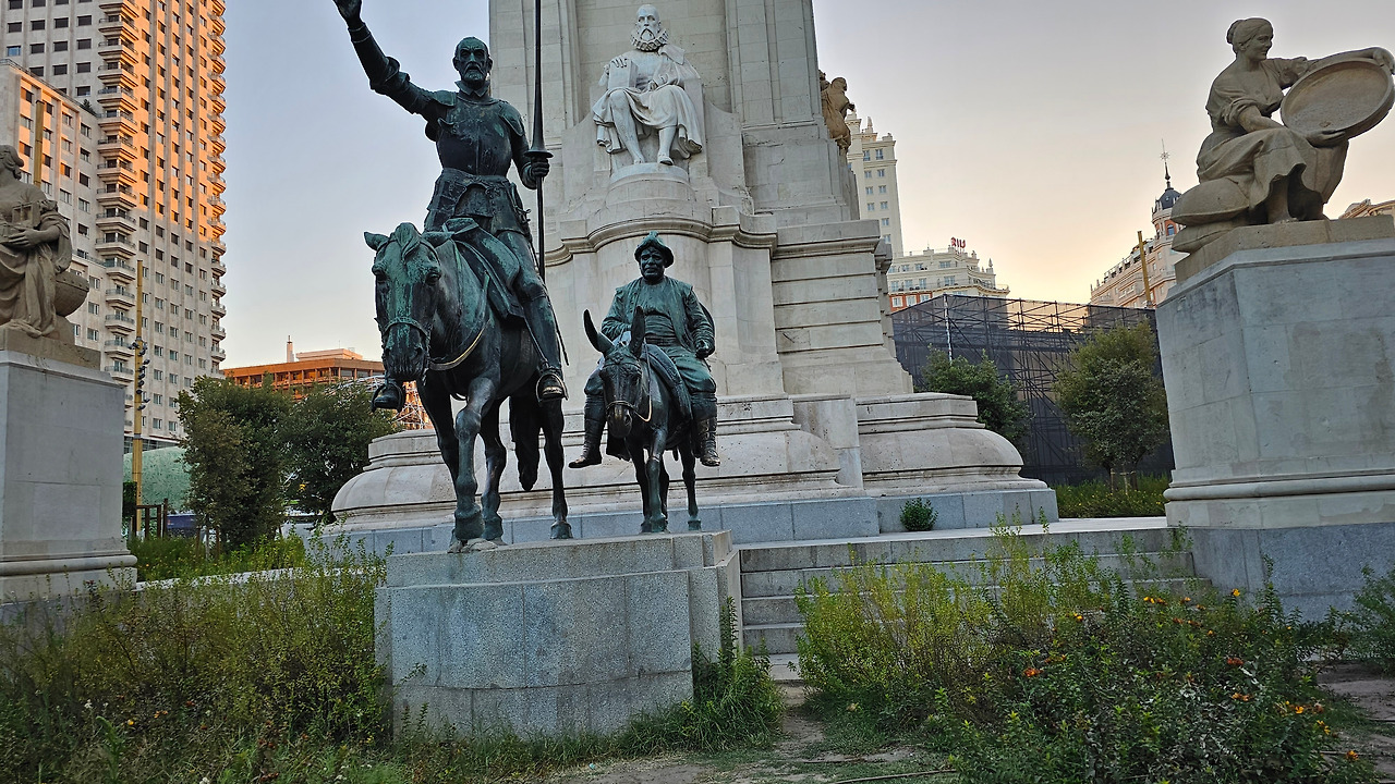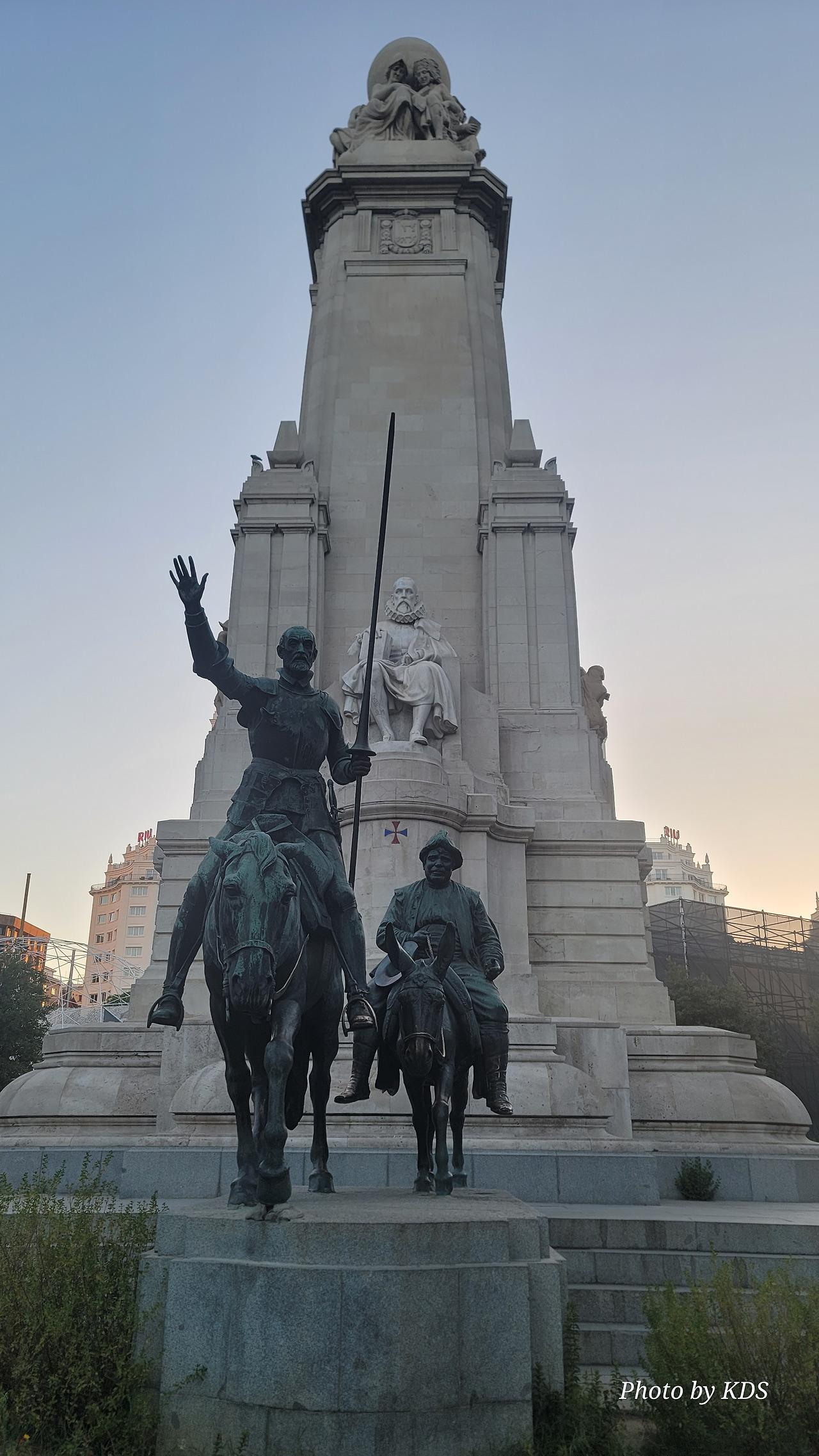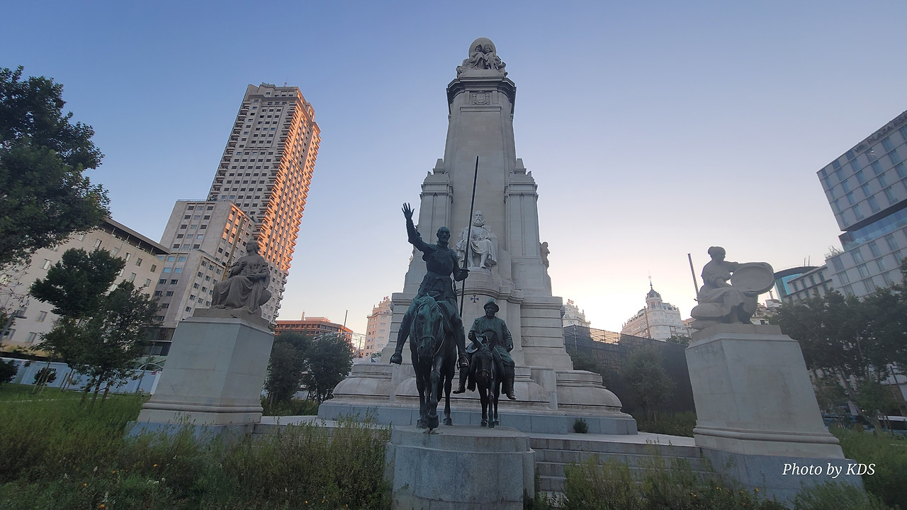 로마에 있는 스페인 광장이 아니다. 오드리 헵번(Audrey Hepburn)이 섹시하게 아이스크림을 먹는 영화 <로마의 휴일>에 나오는 곳이 아니다. 멋진 계단도 바르카차(Barcaccia)의 분수도 없다. 다만 스페인의 문호 미겔 데 세르반테스(Miguel de Cervantes Saavedra)와 그가 쓴 소설 <돈키호테 (Don Quixote de La Mancha)>의 주인공들이 동상으로 서 있다. 금삿갓도 어릴 적에 공상 속의 세계를 그리며 읽은 재미있었던 소설이다. 세르반테스 서거 300주면을 기념하여 이 광장에 그의 기념탑을 우뚝하게 세웠다. 기념탑 정면에는 세르반테스가 망토를 입고 자기의 작품을 들고 앉아있는 모습이고, 돈키호테가 그의 명마 로시난테를 타고 세상의 거짓과 허상에 대항하는 모습으로 서있다. 그 옆에는 언제나 그렇듯이 노새를 탄 산초가 함께하고 있다. 또한 세르반테스 소설의 등장인물인 둘시네아와 알돈자 로렌초의 동상도 같이 있다. 이 근처에 얼마 멀지 않은 곳에 마드리드 왕궁이 있다. 광장 옆에는 마드리드에서 가장 높은 건물 두 개가 있는데, 1957년에 지어진 높이 142m(466피트)의 토레 데 마드리드 (Torre de Madrid, "마드리드 타워")와 1953년에 지어진 높이 117m(384피트)의 에디피시오 에스파냐( Edificio España , "스페인 빌딩")가 있다.