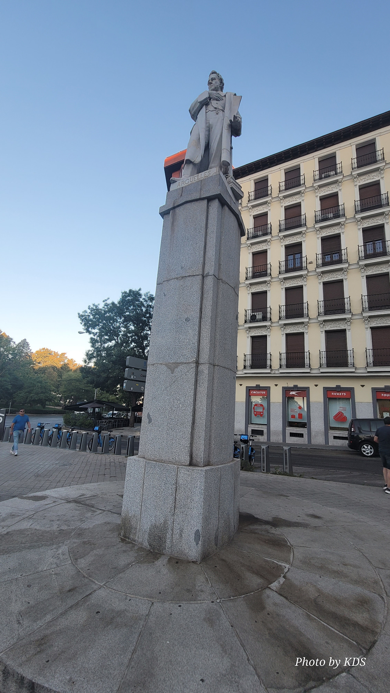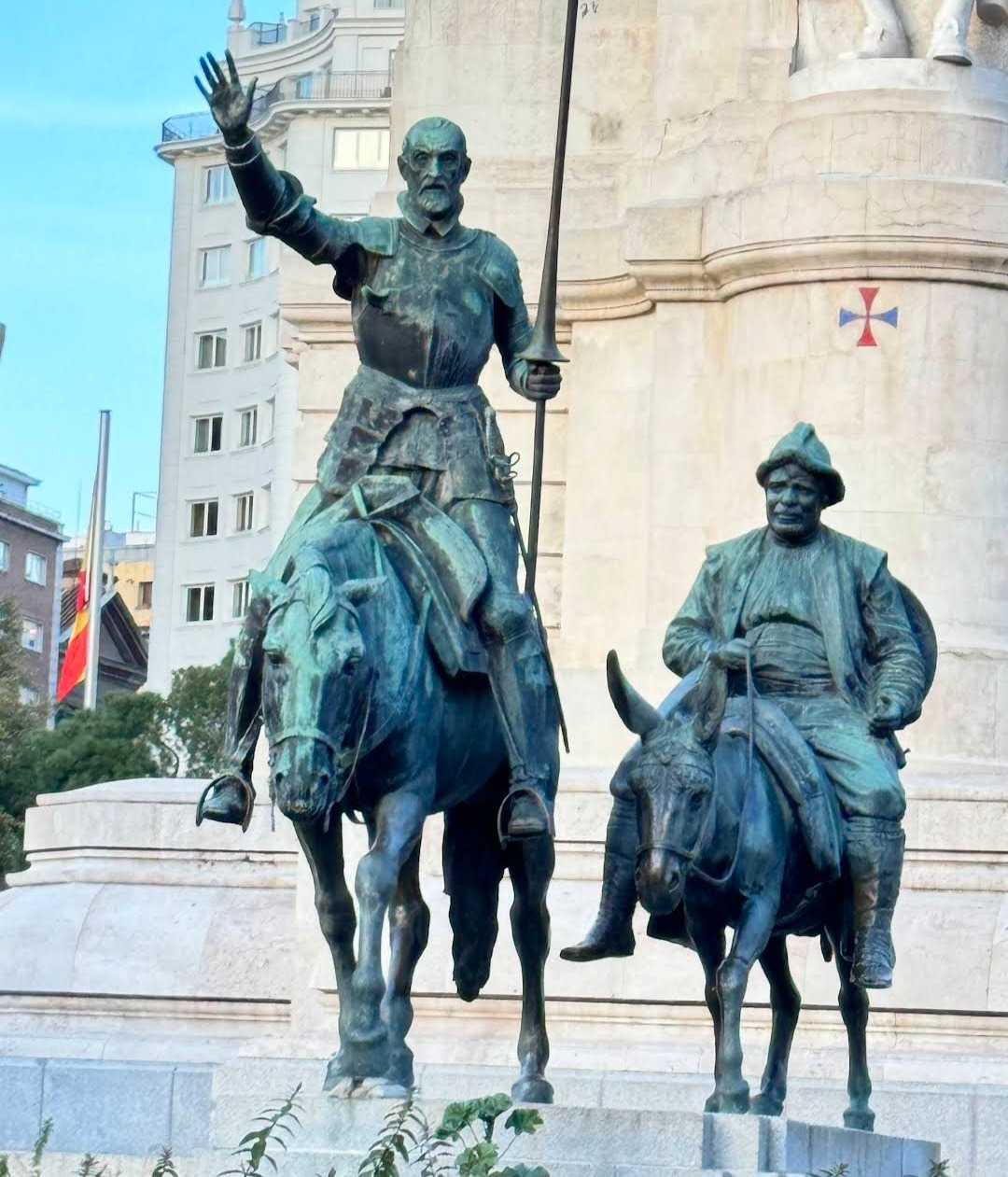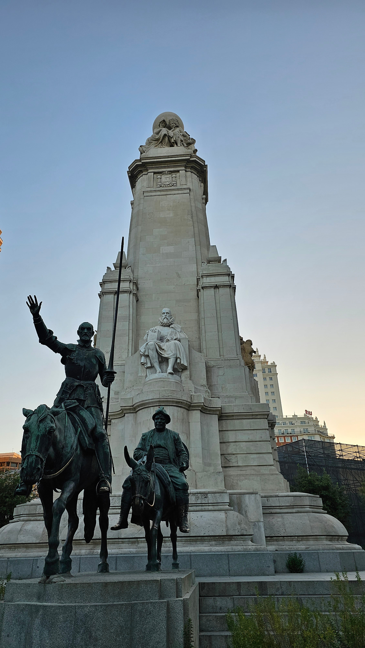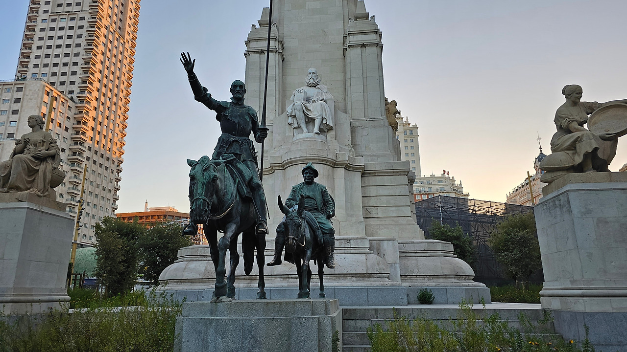 로마에 있는 스페인 광장이 아니다. 오드리 헵번(Audrey Hepburn)이 섹시하게 아이스크림을 먹는 영화 <로마의 휴일>에 나오는 곳이 아니다. 멋진 계단도 바르카차(Barcaccia)의 분수도 없다. 다만 스페인의 문호 미겔 데 세르반테스(Miguel de Cervantes Saavedra)와 그가 쓴 소설 <돈키호테 (Don Quixote de La Mancha)>의 주인공들이 동상으로 서 있다. 금삿갓도 어릴 적에 공상 속의 세계를 그리며 읽은 재미있었던 소설이다. 세르반테스 서거 300주면을 기념하여 이 광장에 그의 기념탑을 우뚝하게 세웠다. 기념탑 정면에는 세르반테스가 망토를 입고 자기의 작품을 들고 앉아있는 모습이고, 돈키호테가 그의 명마 로시난테를 타고 세상의 거짓과 허상에 대항하는 모습으로 서있다. 그 옆에는 언제나 그렇듯이 노새를 탄 산초가 함께하고 있다. 또한 세르반테스 소설의 등장인물인 둘시네아와 알돈자 로렌초의 동상도 같이 있다. 이 근처에 얼마 멀지 않은 곳에 마드리드 왕궁이 있다. 광장 옆에는 마드리드에서 가장 높은 건물 두 개가 있는데, 1957년에 지어진 높이 142m(466피트)의 토레 데 마드리드 (Torre de Madrid, "마드리드 타워")와 1953년에 지어진 높이 117m(384피트)의 에디피시오 에스파냐( Edificio España , "스페인 빌딩")가 있다.