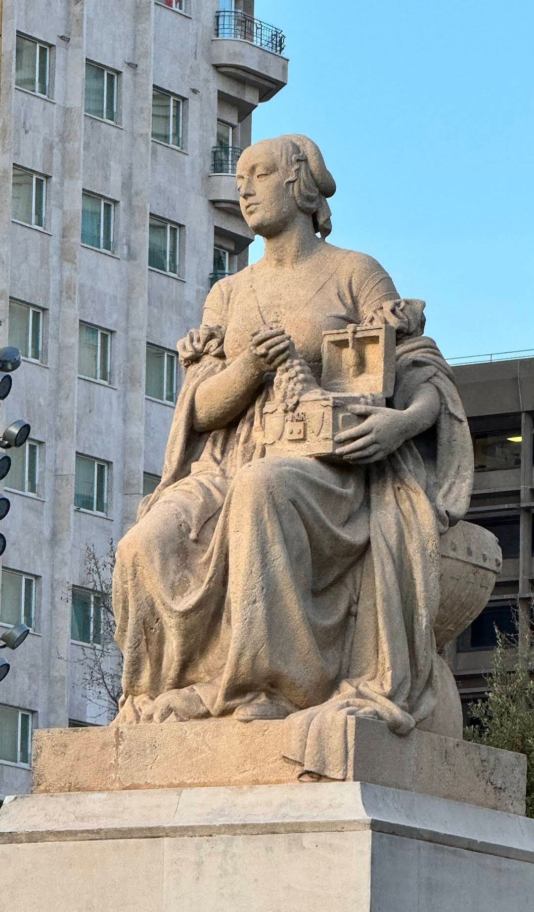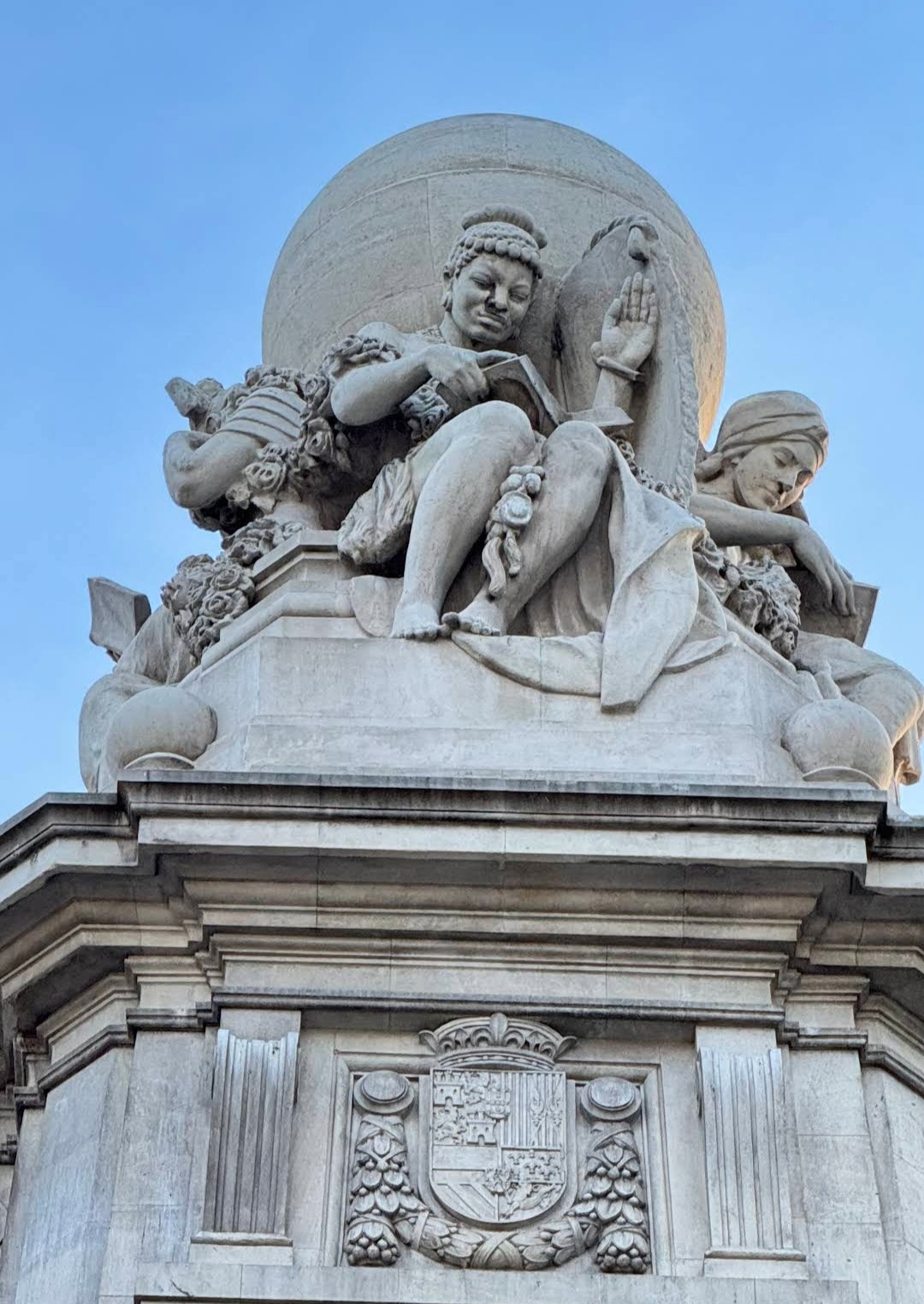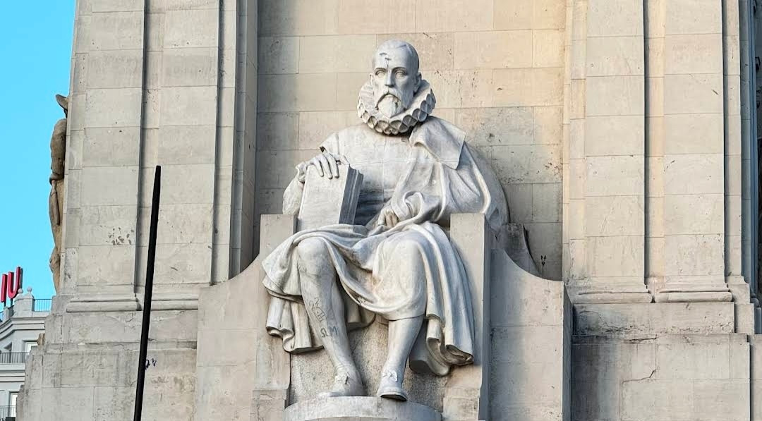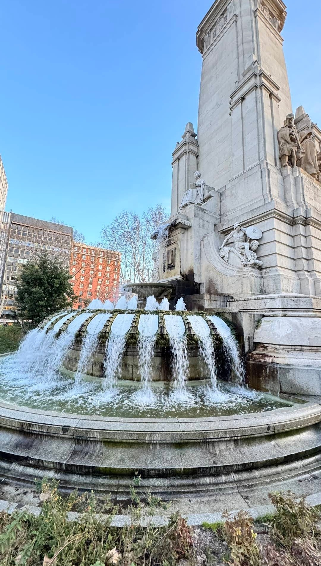 로마에 있는 스페인 광장이 아니다. 오드리 헵번(Audrey Hepburn)이 섹시하게 아이스크림을 먹는 영화 <로마의 휴일>에 나오는 곳이 아니다. 멋진 계단도 바르카차(Barcaccia)의 분수도 없다. 다만 스페인의 문호 미겔 데 세르반테스(Miguel de Cervantes Saavedra)와 그가 쓴 소설 <돈키호테 (Don Quixote de La Mancha)>의 주인공들이 동상으로 서 있다. 금삿갓도 어릴 적에 공상 속의 세계를 그리며 읽은 재미있었던 소설이다. 세르반테스 서거 300주면을 기념하여 이 광장에 그의 기념탑을 우뚝하게 세웠다. 기념탑 정면에는 세르반테스가 망토를 입고 자기의 작품을 들고 앉아있는 모습이고, 돈키호테가 그의 명마 로시난테를 타고 세상의 거짓과 허상에 대항하는 모습으로 서있다. 그 옆에는 언제나 그렇듯이 노새를 탄 산초가 함께하고 있다. 또한 세르반테스 소설의 등장인물인 둘시네아와 알돈자 로렌초의 동상도 같이 있다. 이 근처에 얼마 멀지 않은 곳에 마드리드 왕궁이 있다. 광장 옆에는 마드리드에서 가장 높은 건물 두 개가 있는데, 1957년에 지어진 높이 142m(466피트)의 토레 데 마드리드 (Torre de Madrid, "마드리드 타워")와 1953년에 지어진 높이 117m(384피트)의 에디피시오 에스파냐( Edificio España , "스페인 빌딩")가 있다.