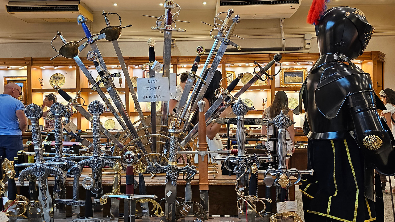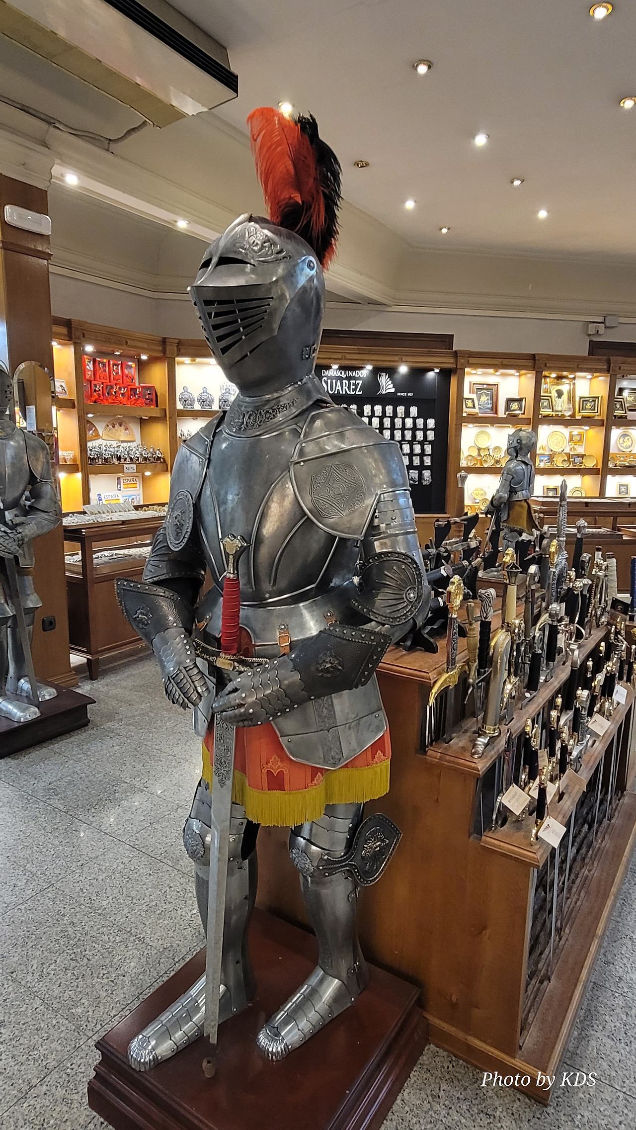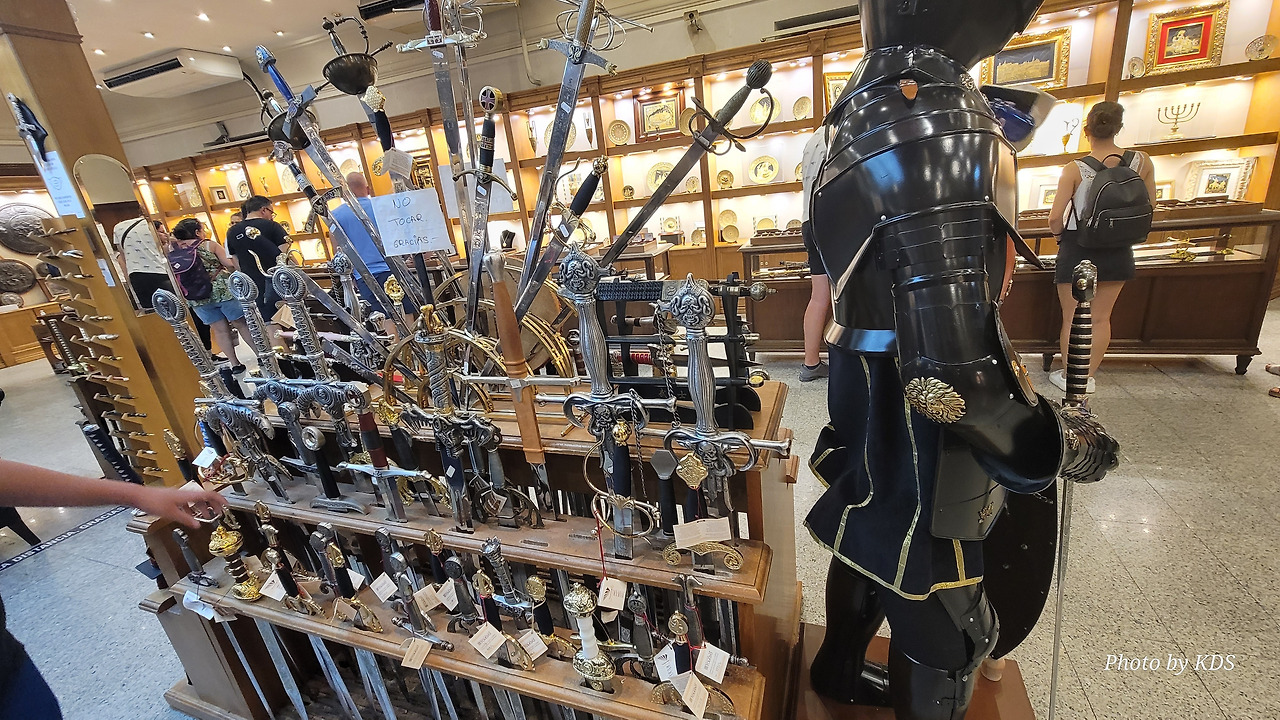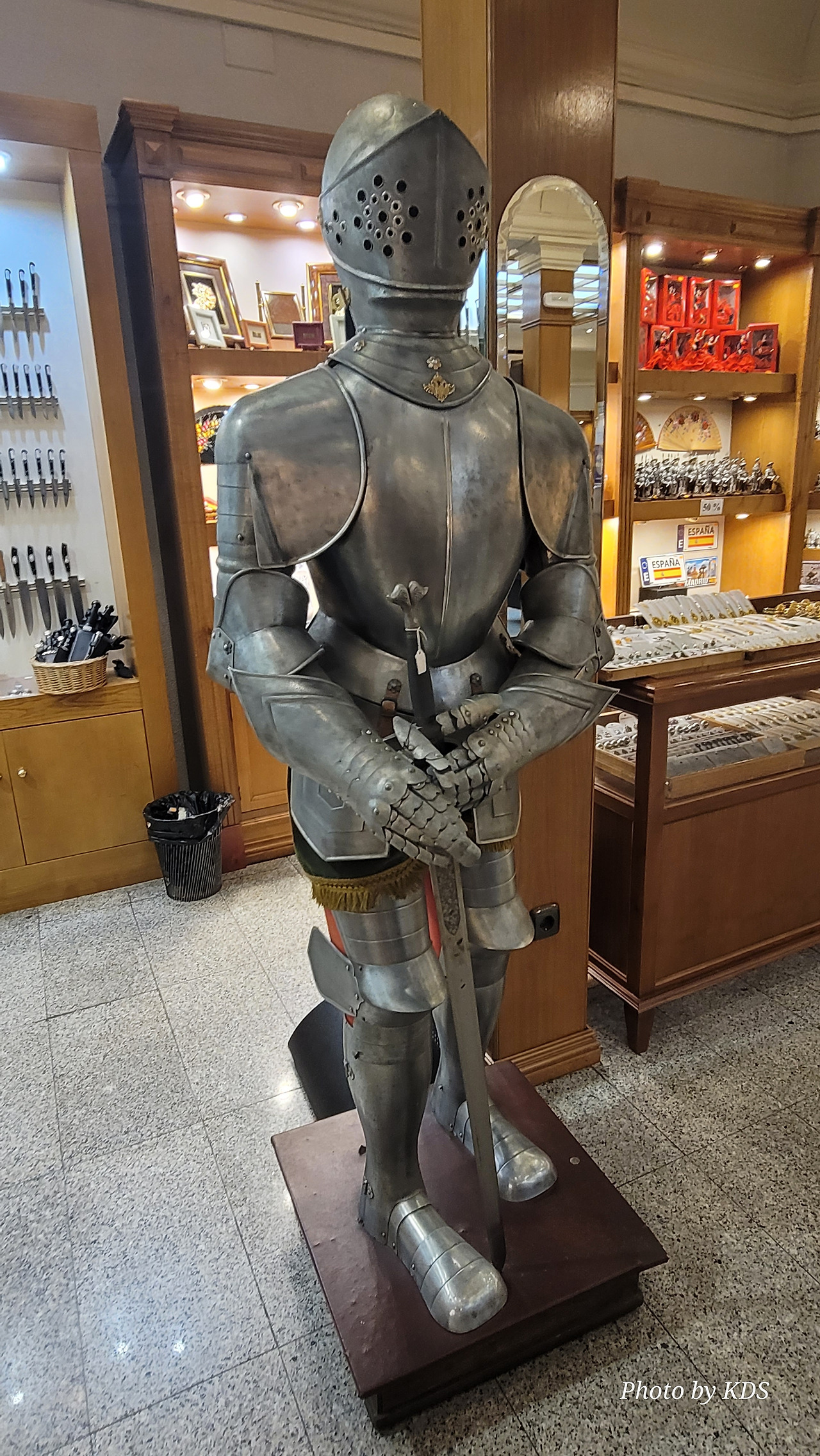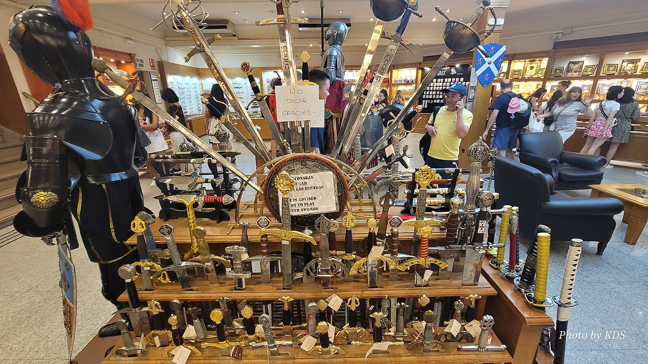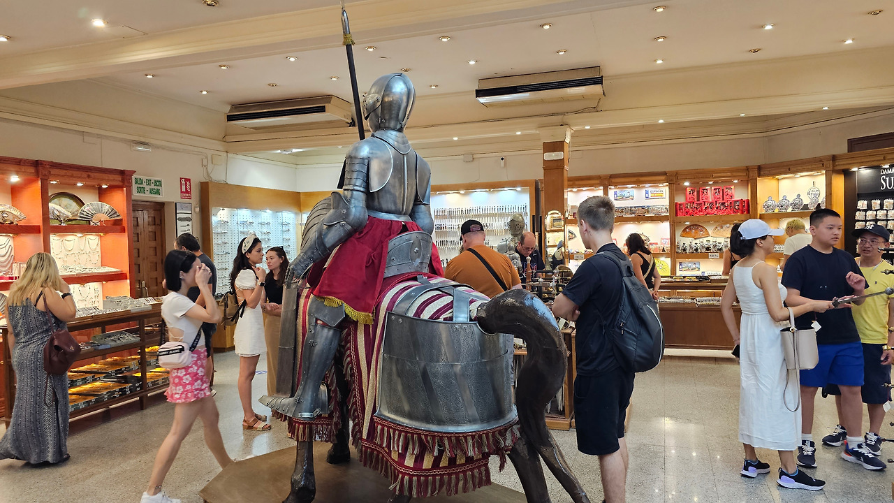 어느 나라를 가나 여행사의 스타일은 비슷하다. 관광객을 가득 태워온 관광버스가 제일 먼저 기념품 가게의 주차장에 들린다. 이곳에서도 마찬가지다. 마드리드를 출발하여 톨레도에 도착하자마자 제일 먼저 기념품 가게 앞에 주차를 시키더니 1시간의 자유 시간을 주면서 쇼핑을 한 후 다시 버스에 탑승하란다. 끌려왔으니 도리가 없다. 기념품 가게는 그야말로 종합 선물세트였다. 금은의 세공품에서부터 그림 등의 예술품을 비롯하여 중세의 각종 장신구와 기사들의 갑옷과 도검(刀劍) 등을 팔고 있었다. 지하실에서는 대장간을 만들어 놓고 직접 중세 기사의 도검을 만들고 있었다. 또 다른 방에는 금은 세공사들이 각종 문양의 금은 세공품을 돋보기를 들여다보면서 열심히 제작하고 있었다. 딱히 필요한 물품도 없고 선물할 사람도 없엇 그냥 눈요기를 이곳 저곳을 구경하면서 사진을 찍었다. 중세의 전설상의 기사의 칼인 엑스칼리버 같은 모양의 칼도 보인다. 마창 경기의 갑옷과 창들도 눈길을 끈다.