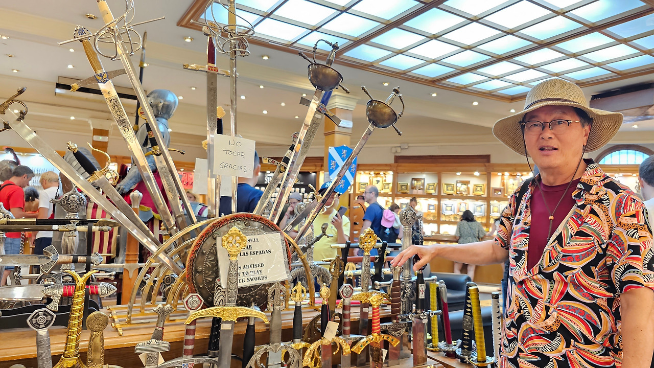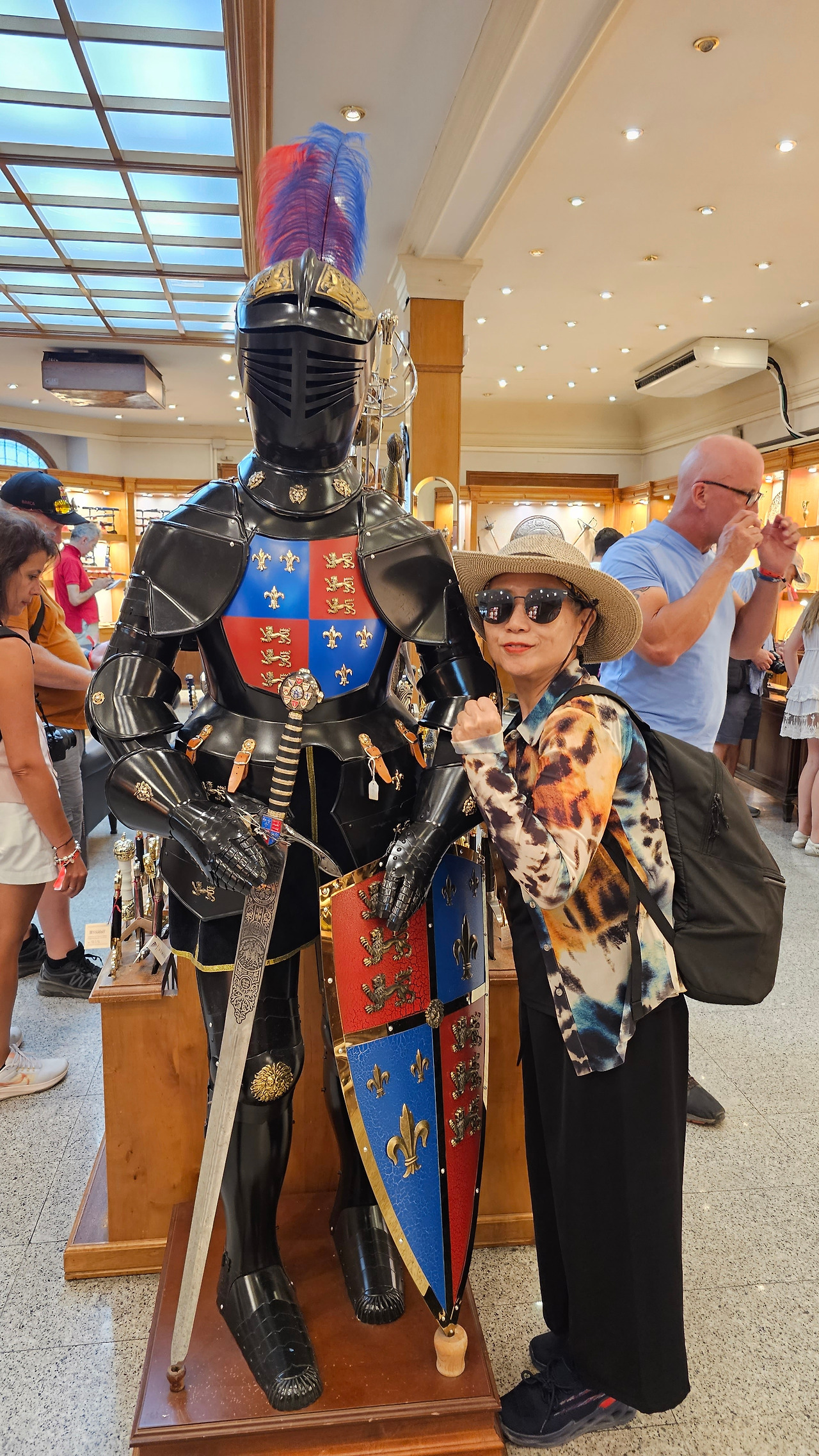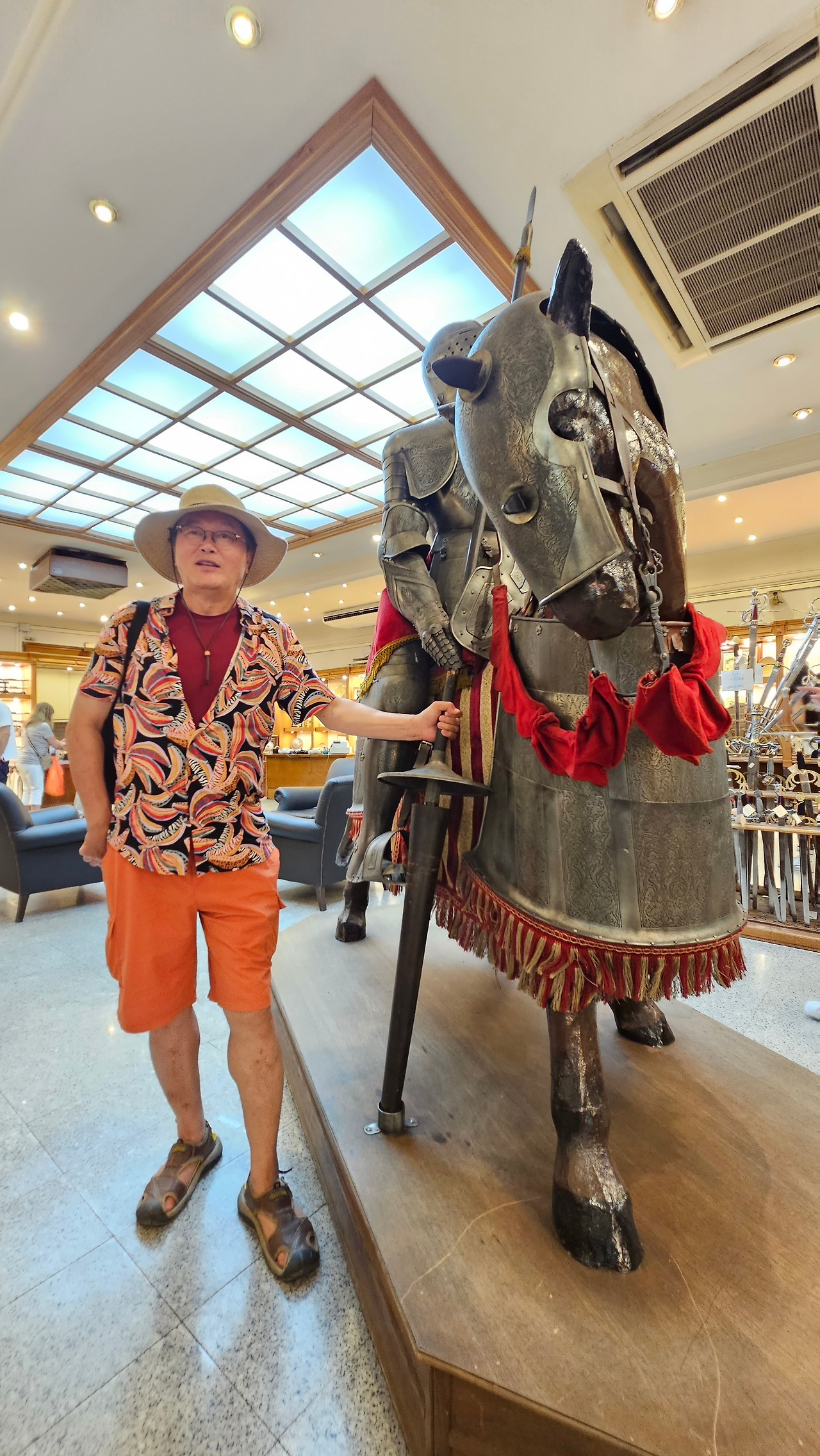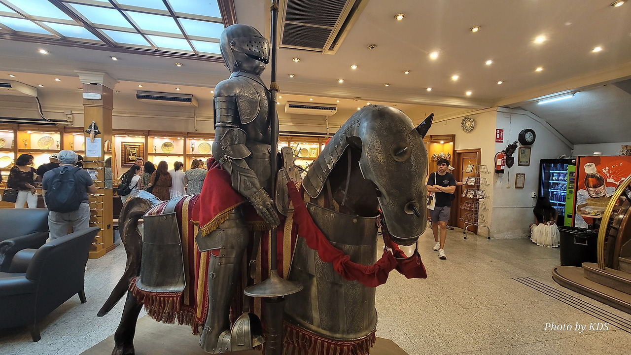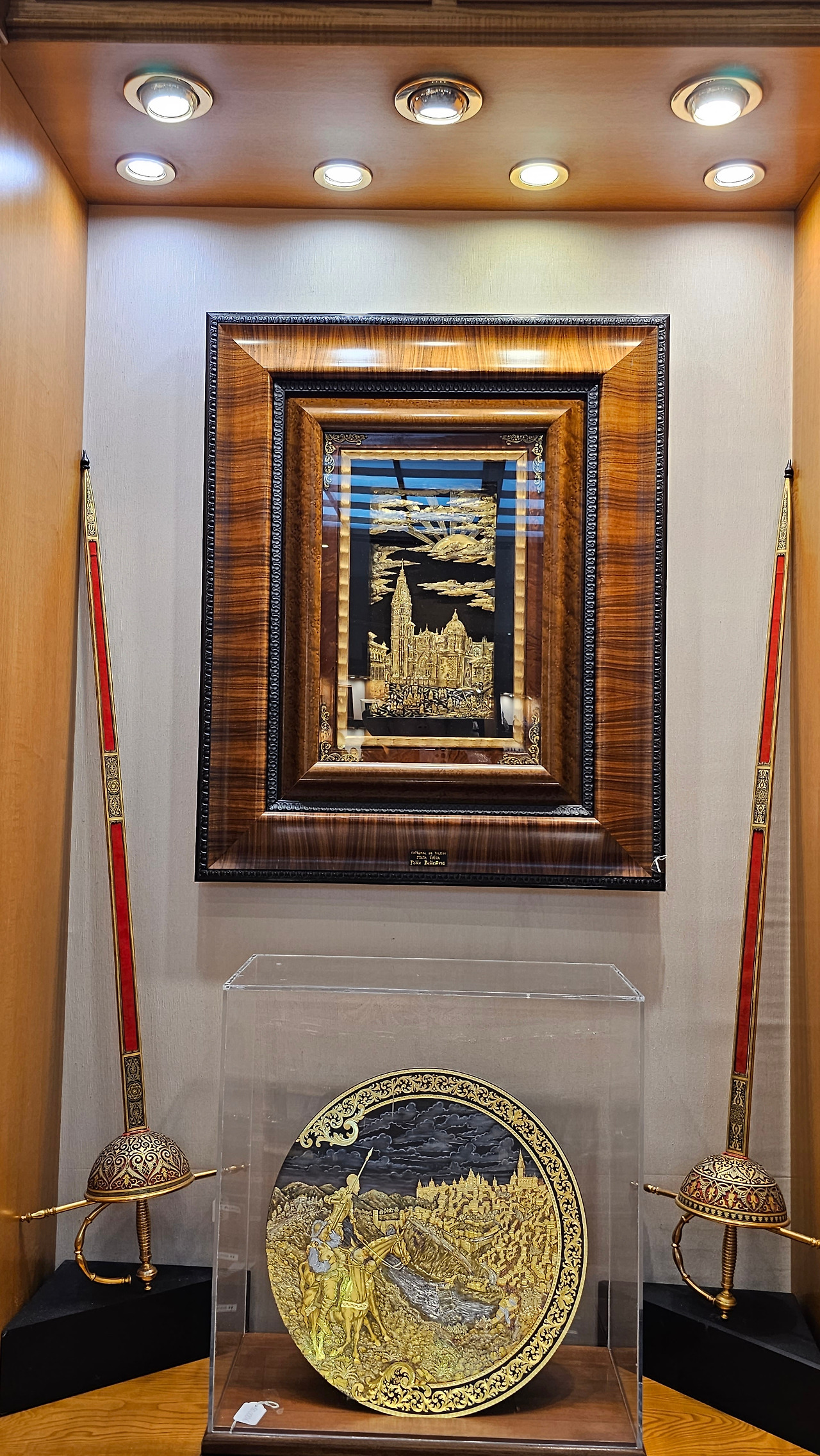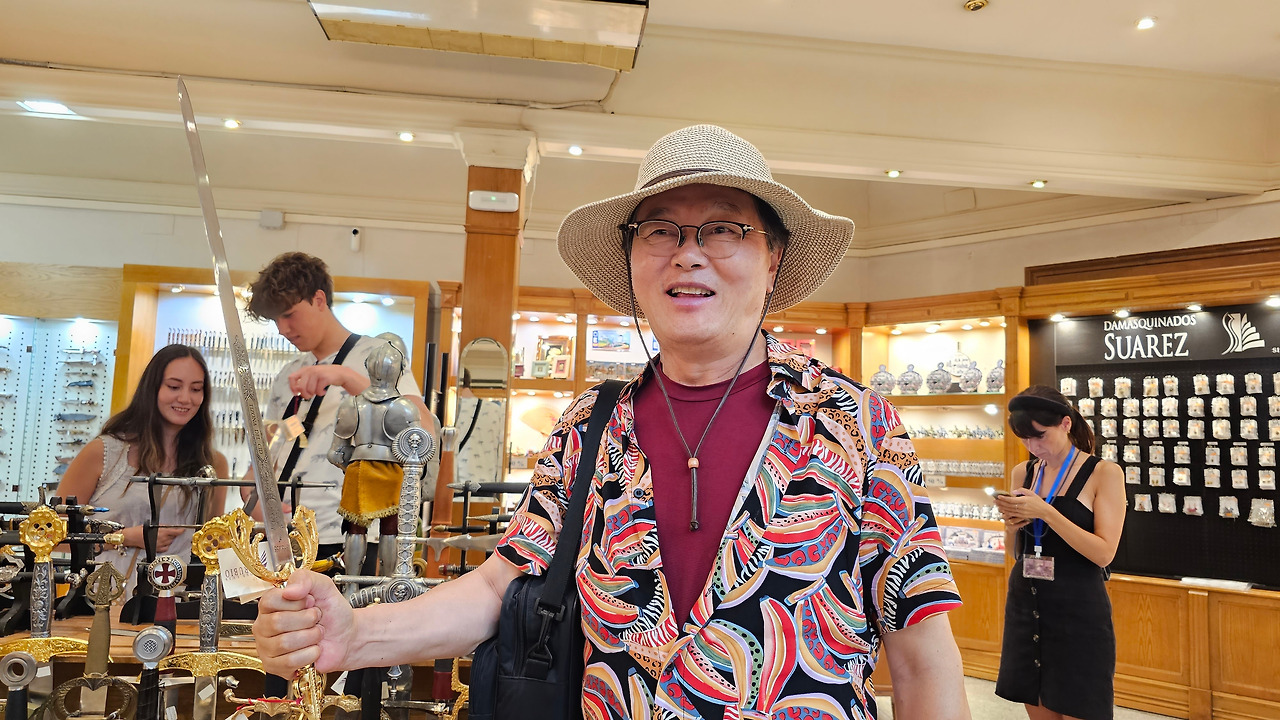 어느 나라를 가나 여행사의 스타일은 비슷하다. 관광객을 가득 태워온 관광버스가 제일 먼저 기념품 가게의 주차장에 들린다. 이곳에서도 마찬가지다. 마드리드를 출발하여 톨레도에 도착하자마자 제일 먼저 기념품 가게 앞에 주차를 시키더니 1시간의 자유 시간을 주면서 쇼핑을 한 후 다시 버스에 탑승하란다. 끌려왔으니 도리가 없다. 기념품 가게는 그야말로 종합 선물세트였다. 금은의 세공품에서부터 그림 등의 예술품을 비롯하여 중세의 각종 장신구와 기사들의 갑옷과 도검(刀劍) 등을 팔고 있었다. 지하실에서는 대장간을 만들어 놓고 직접 중세 기사의 도검을 만들고 있었다. 또 다른 방에는 금은 세공사들이 각종 문양의 금은 세공품을 돋보기를 들여다보면서 열심히 제작하고 있었다. 딱히 필요한 물품도 없고 선물할 사람도 없엇 그냥 눈요기를 이곳 저곳을 구경하면서 사진을 찍었다. 중세의 전설상의 기사의 칼인 엑스칼리버 같은 모양의 칼도 보인다. 마창 경기의 갑옷과 창들도 눈길을 끈다.