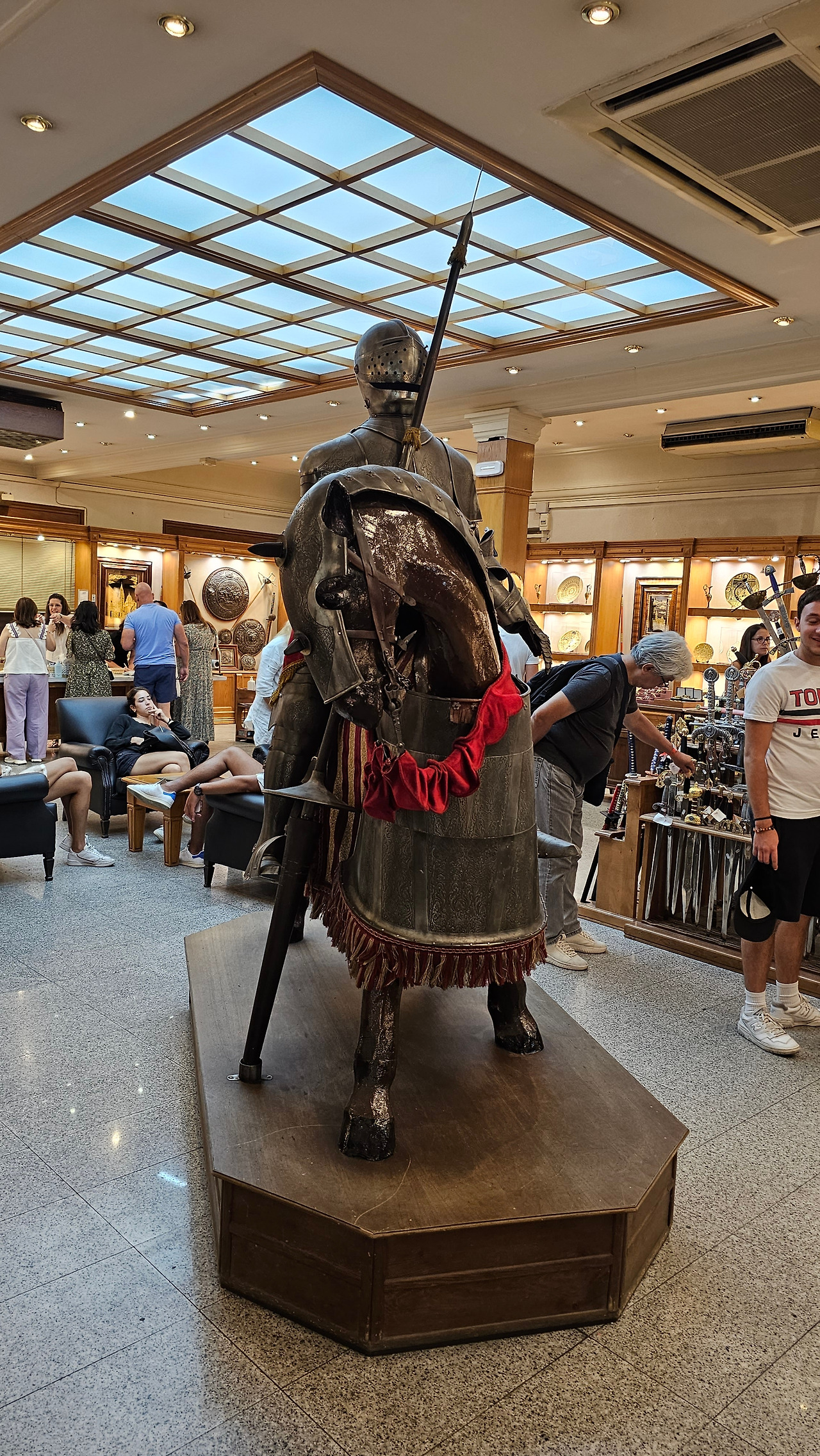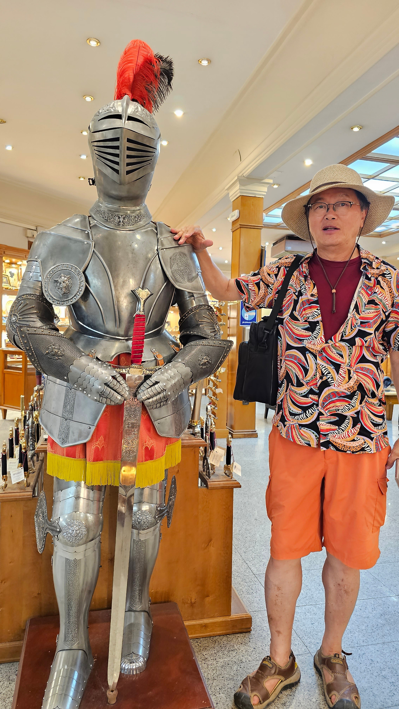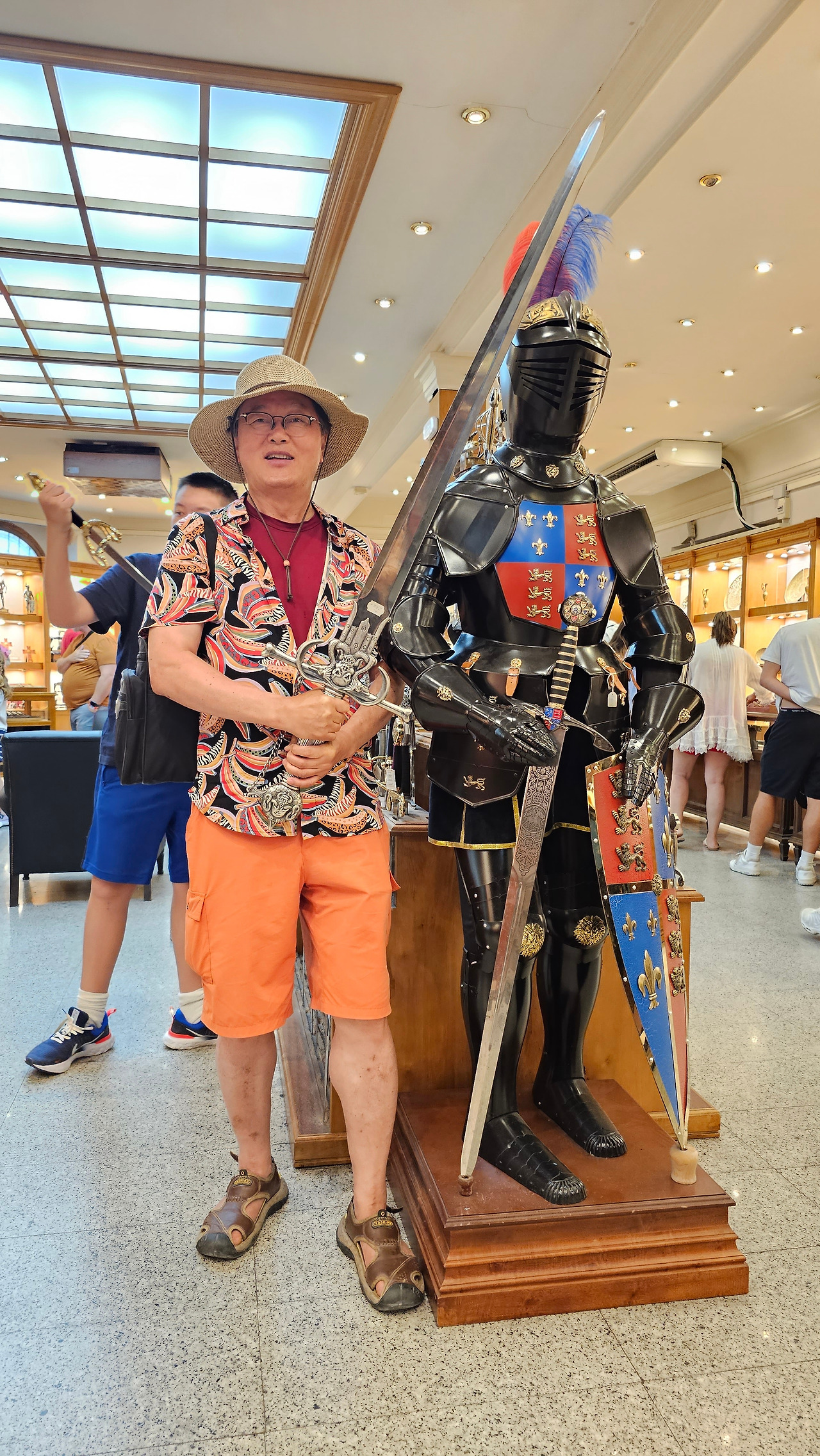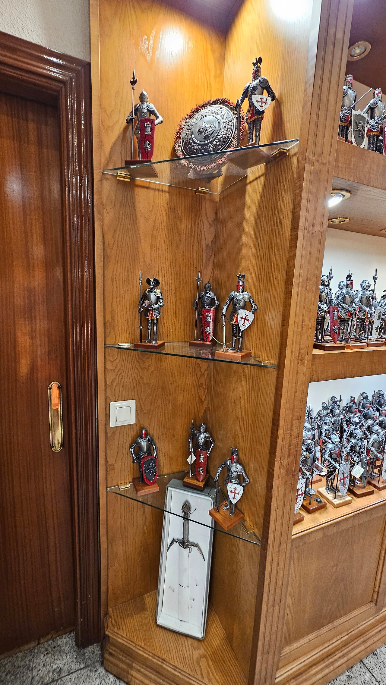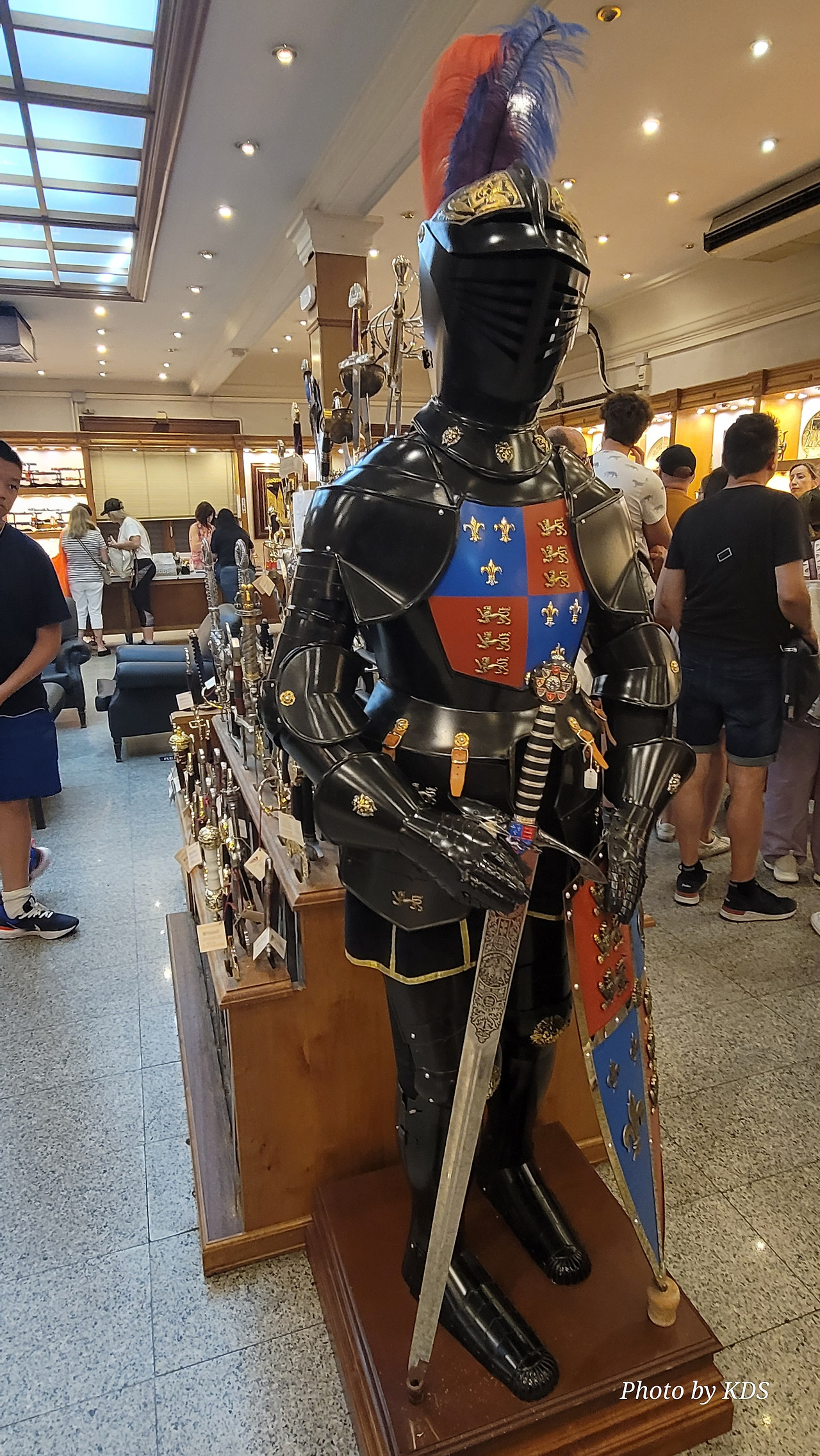 어느 나라를 가나 여행사의 스타일은 비슷하다. 관광객을 가득 태워온 관광버스가 제일 먼저 기념품 가게의 주차장에 들린다. 이곳에서도 마찬가지다. 마드리드를 출발하여 톨레도에 도착하자마자 제일 먼저 기념품 가게 앞에 주차를 시키더니 1시간의 자유 시간을 주면서 쇼핑을 한 후 다시 버스에 탑승하란다. 끌려왔으니 도리가 없다. 기념품 가게는 그야말로 종합 선물세트였다. 금은의 세공품에서부터 그림 등의 예술품을 비롯하여 중세의 각종 장신구와 기사들의 갑옷과 도검(刀劍) 등을 팔고 있었다. 지하실에서는 대장간을 만들어 놓고 직접 중세 기사의 도검을 만들고 있었다. 또 다른 방에는 금은 세공사들이 각종 문양의 금은 세공품을 돋보기를 들여다보면서 열심히 제작하고 있었다. 딱히 필요한 물품도 없고 선물할 사람도 없엇 그냥 눈요기를 이곳 저곳을 구경하면서 사진을 찍었다. 중세의 전설상의 기사의 칼인 엑스칼리버 같은 모양의 칼도 보인다. 마창 경기의 갑옷과 창들도 눈길을 끈다.