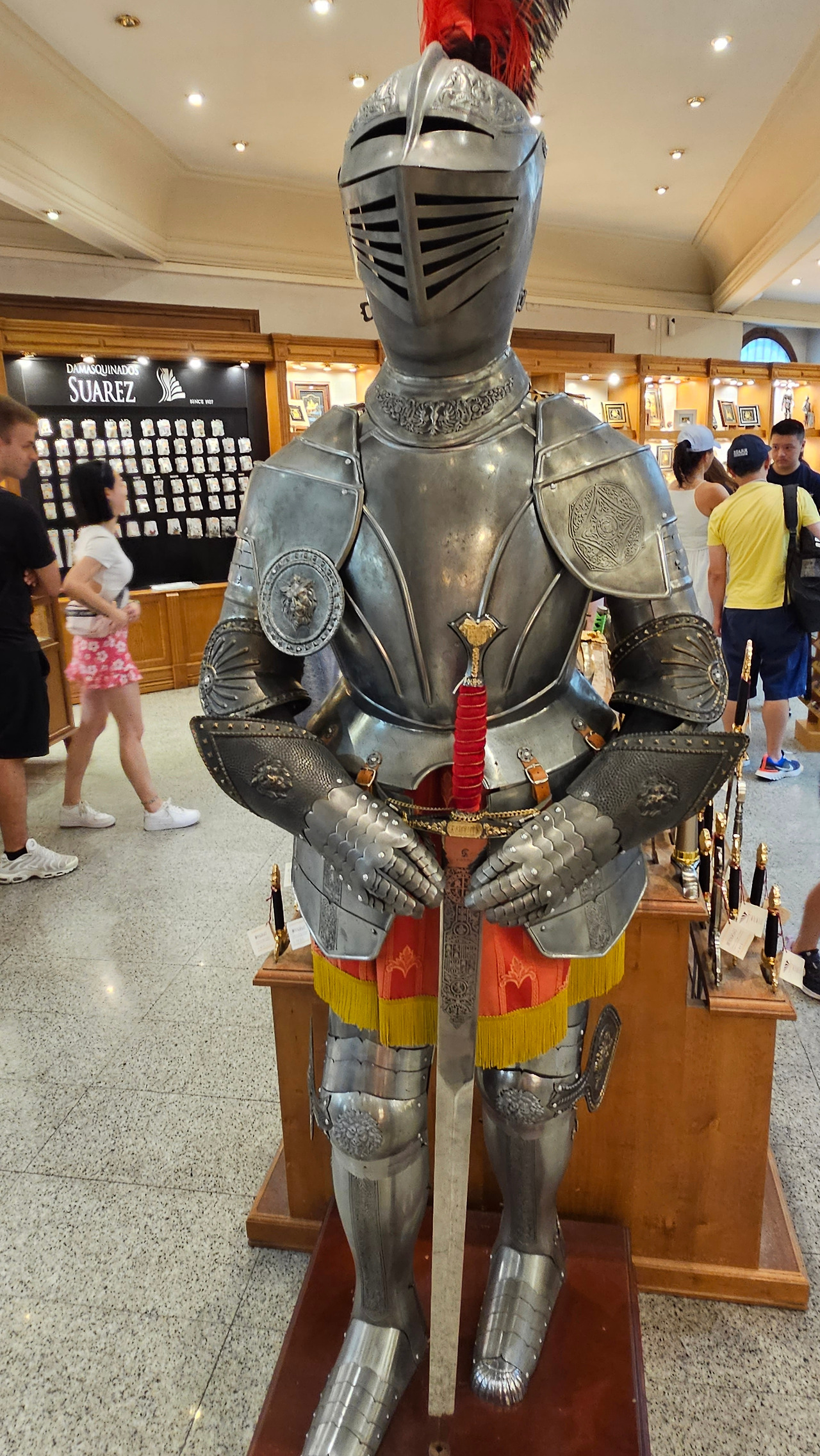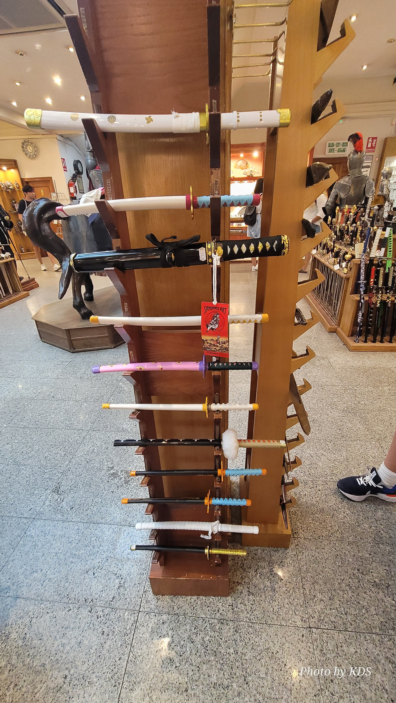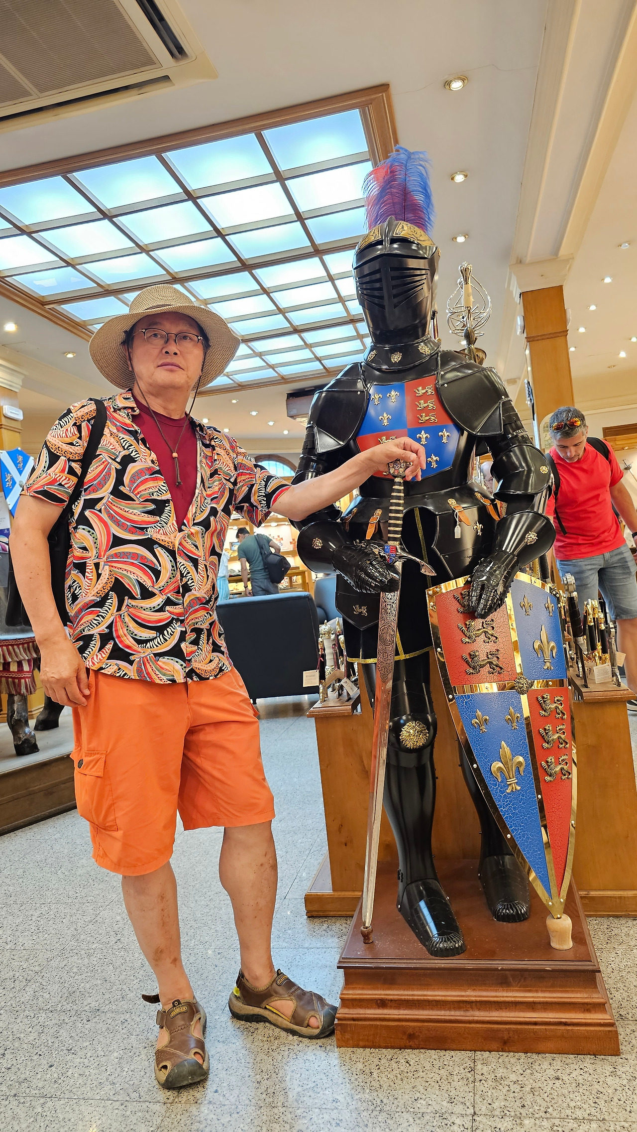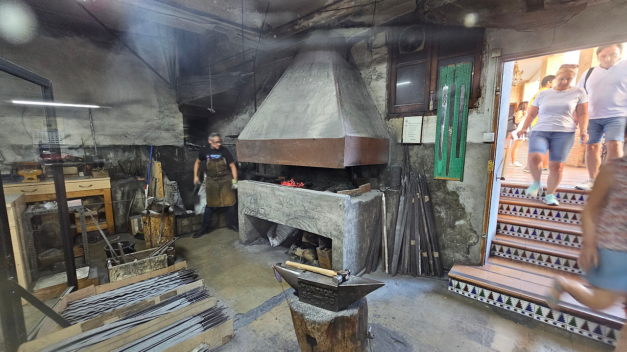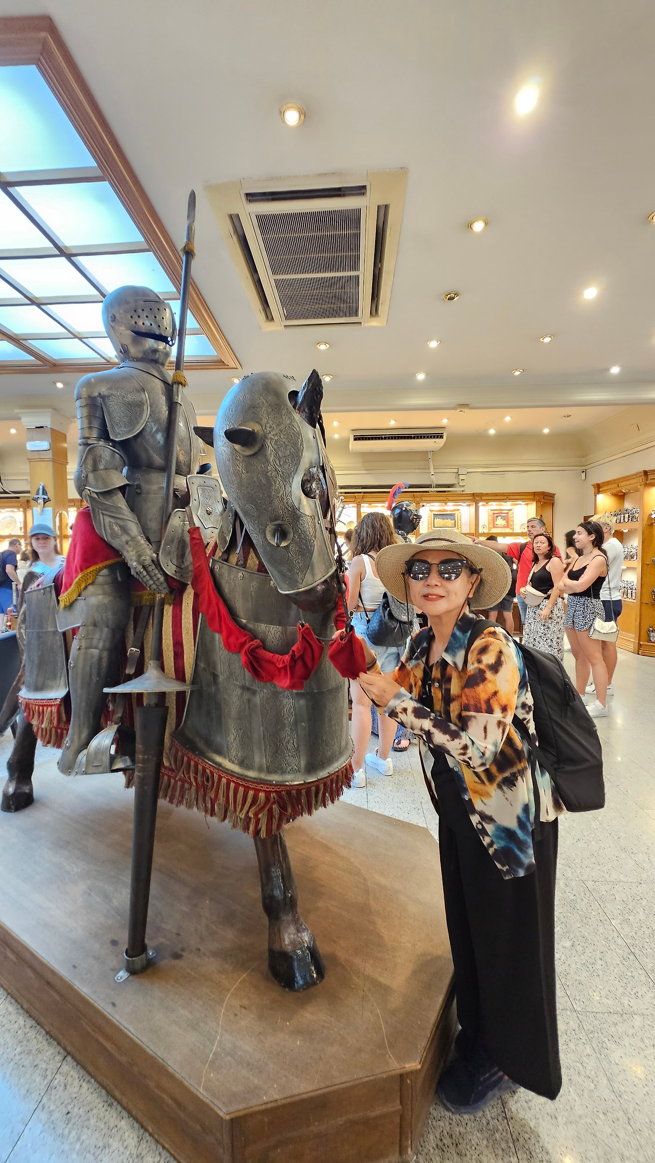 어느 나라를 가나 여행사의 스타일은 비슷하다. 관광객을 가득 태워온 관광버스가 제일 먼저 기념품 가게의 주차장에 들린다. 이곳에서도 마찬가지다. 마드리드를 출발하여 톨레도에 도착하자마자 제일 먼저 기념품 가게 앞에 주차를 시키더니 1시간의 자유 시간을 주면서 쇼핑을 한 후 다시 버스에 탑승하란다. 끌려왔으니 도리가 없다. 기념품 가게는 그야말로 종합 선물세트였다. 금은의 세공품에서부터 그림 등의 예술품을 비롯하여 중세의 각종 장신구와 기사들의 갑옷과 도검(刀劍) 등을 팔고 있었다. 지하실에서는 대장간을 만들어 놓고 직접 중세 기사의 도검을 만들고 있었다. 또 다른 방에는 금은 세공사들이 각종 문양의 금은 세공품을 돋보기를 들여다보면서 열심히 제작하고 있었다. 딱히 필요한 물품도 없고 선물할 사람도 없엇 그냥 눈요기를 이곳 저곳을 구경하면서 사진을 찍었다. 중세의 전설상의 기사의 칼인 엑스칼리버 같은 모양의 칼도 보인다. 마창 경기의 갑옷과 창들도 눈길을 끈다.