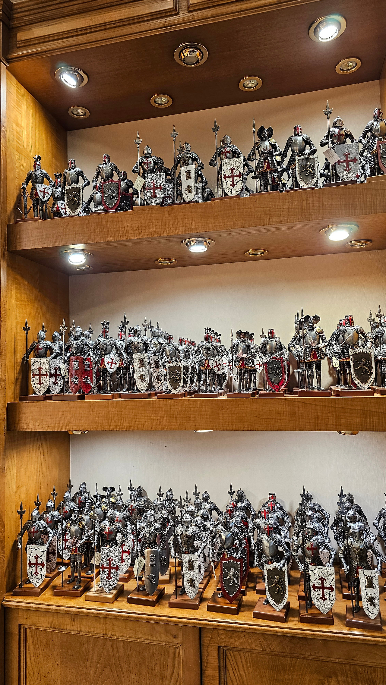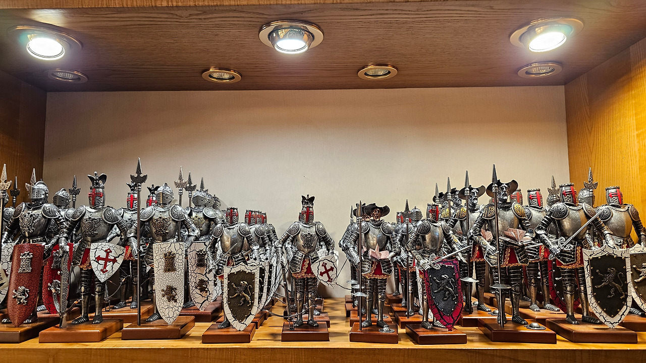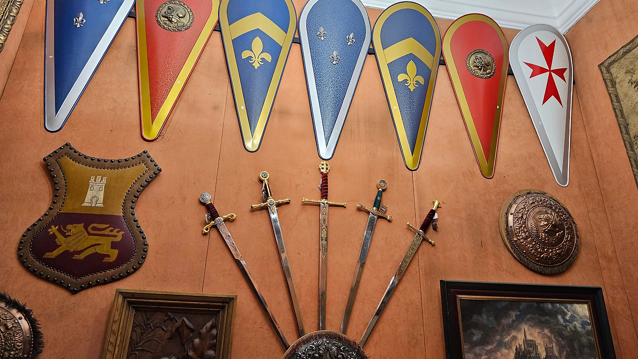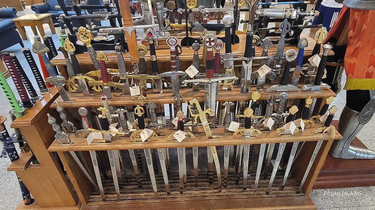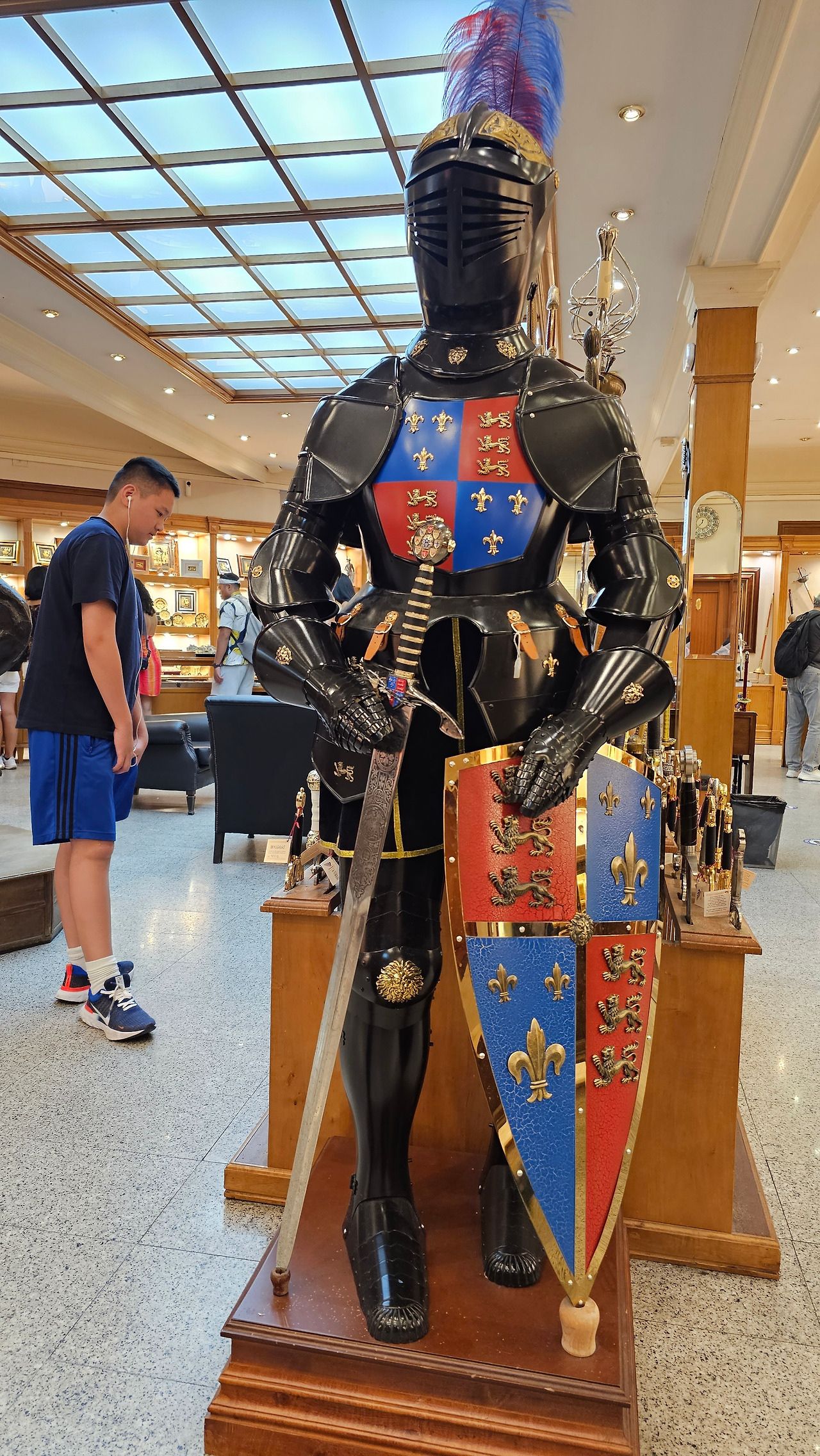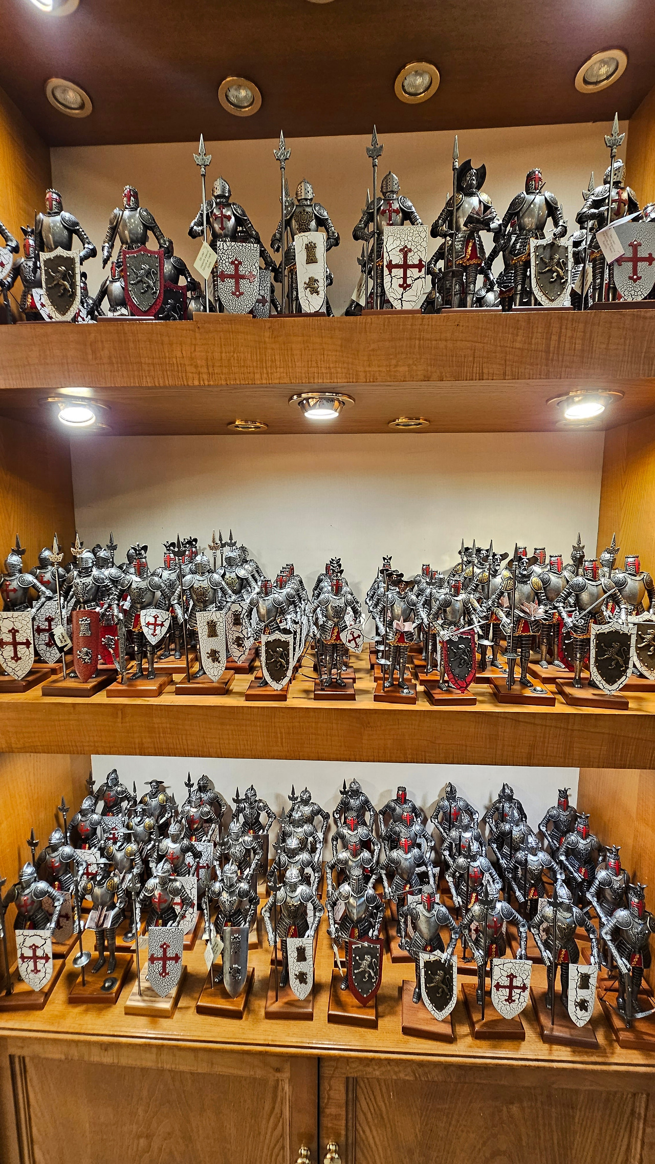 어느 나라를 가나 여행사의 스타일은 비슷하다. 관광객을 가득 태워온 관광버스가 제일 먼저 기념품 가게의 주차장에 들린다. 이곳에서도 마찬가지다. 마드리드를 출발하여 톨레도에 도착하자마자 제일 먼저 기념품 가게 앞에 주차를 시키더니 1시간의 자유 시간을 주면서 쇼핑을 한 후 다시 버스에 탑승하란다. 끌려왔으니 도리가 없다. 기념품 가게는 그야말로 종합 선물세트였다. 금은의 세공품에서부터 그림 등의 예술품을 비롯하여 중세의 각종 장신구와 기사들의 갑옷과 도검(刀劍) 등을 팔고 있었다. 지하실에서는 대장간을 만들어 놓고 직접 중세 기사의 도검을 만들고 있었다. 또 다른 방에는 금은 세공사들이 각종 문양의 금은 세공품을 돋보기를 들여다보면서 열심히 제작하고 있었다. 딱히 필요한 물품도 없고 선물할 사람도 없엇 그냥 눈요기를 이곳 저곳을 구경하면서 사진을 찍었다. 중세의 전설상의 기사의 칼인 엑스칼리버 같은 모양의 칼도 보인다. 마창 경기의 갑옷과 창들도 눈길을 끈다.