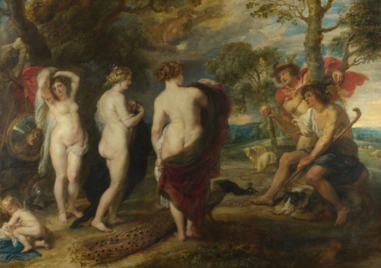 파리스의 심판 때 바람둥이 파리스가 옷을 입은 여신들의 미를 제대로 심사하지 못하므로 모두 옷을 벗고 심사에 응하라고 고집을 부렸다는 일설(一說)도 있다. 그래서 현대의 미스 코리아 심사에서도 다 벗으라고는 못하니까 수영복 심사를 하는 것일까? 성의 상품화란 비판 때문에 금삿갓이 심사할 때 수영복 심사는 하되 방송에는 나오지 않도록, 1박 2일 합숙 심사과정에서 하루는 수영복, 하루는 가운을 입고 진행했다. 이 주제는 수많은 화가들이 천착(穿鑿)하여 다양한 작품이 존재한다. 여기서는 우선 페데르 파울 루벤스의 작품을 감상해 보자. 루벤스는 펼쳐지는 내러티브를 관능적인 스타일로 그려내며, 포즈를 취하는 인물들의 선이 캔버스 너머로 시선을 이는 효과가 있다.