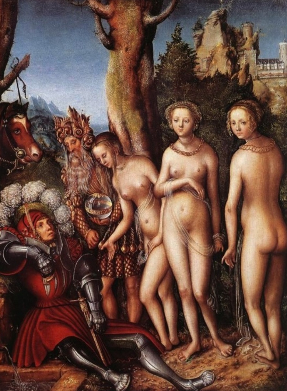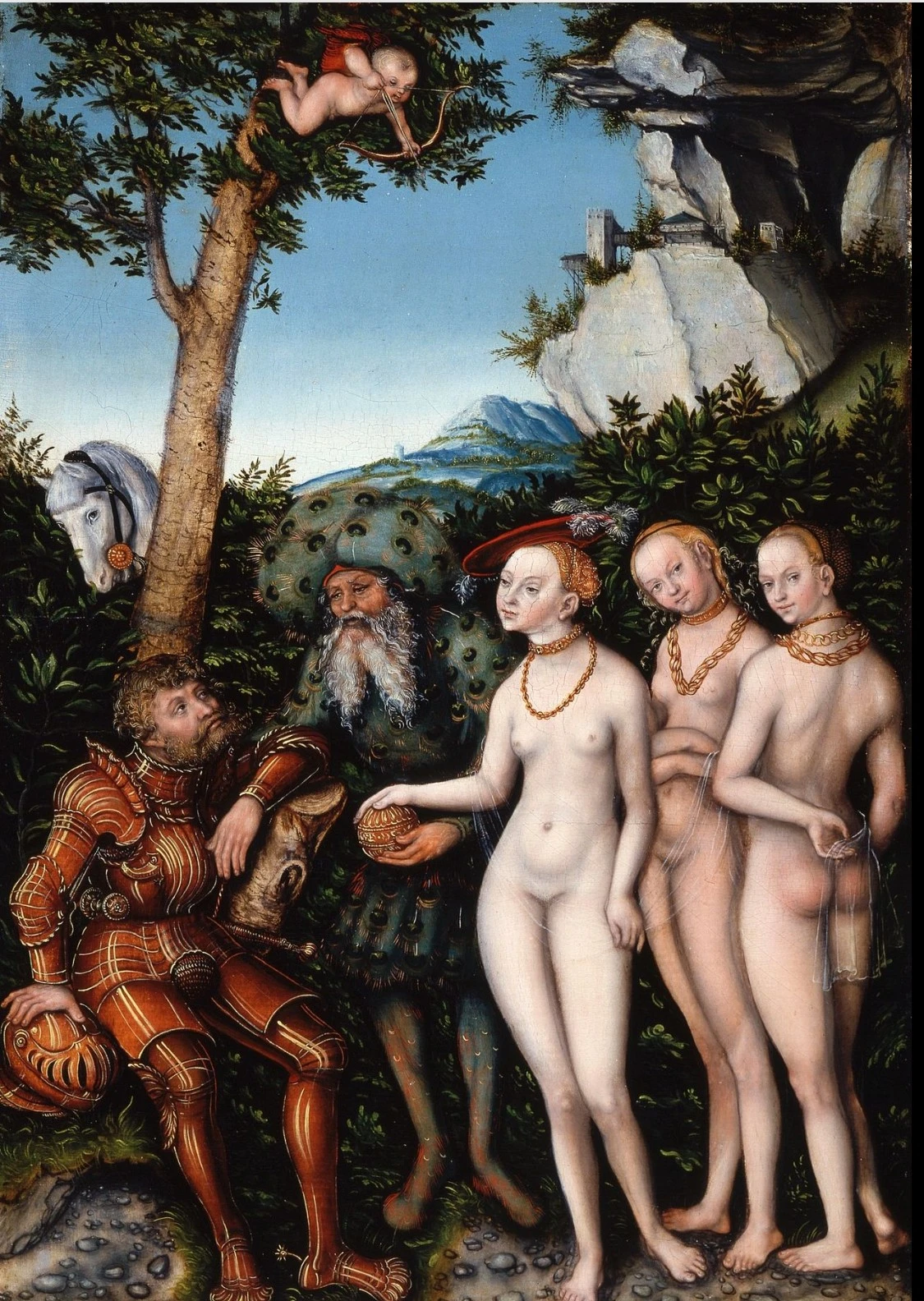 이 세 작품은 모두 루카스 크라나흐(Lucas Cranach the Elder)의 1500년대의 작품이다. 세 여신 모두 발가벗고 심판관을 향하여 다소곳이 선택을 기다리고 있다. 심판인 파리스는 갑옷을 입은 채 주저앉아서 가운데 아프로디테를 뚫어져라 응시하고 있는 것으로 보아 이미 심중을 굳혔으리라. 그림 속의 세 여신이 모두 현대 여성들처럼 날씬한 몸매를 하고 있다는 것이 특이하다. 현대의 여성들도 저토록 날씬하게 다이어트를 하기는 쉽지 않아 보인다.