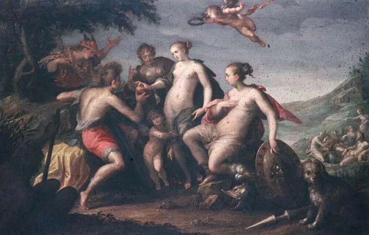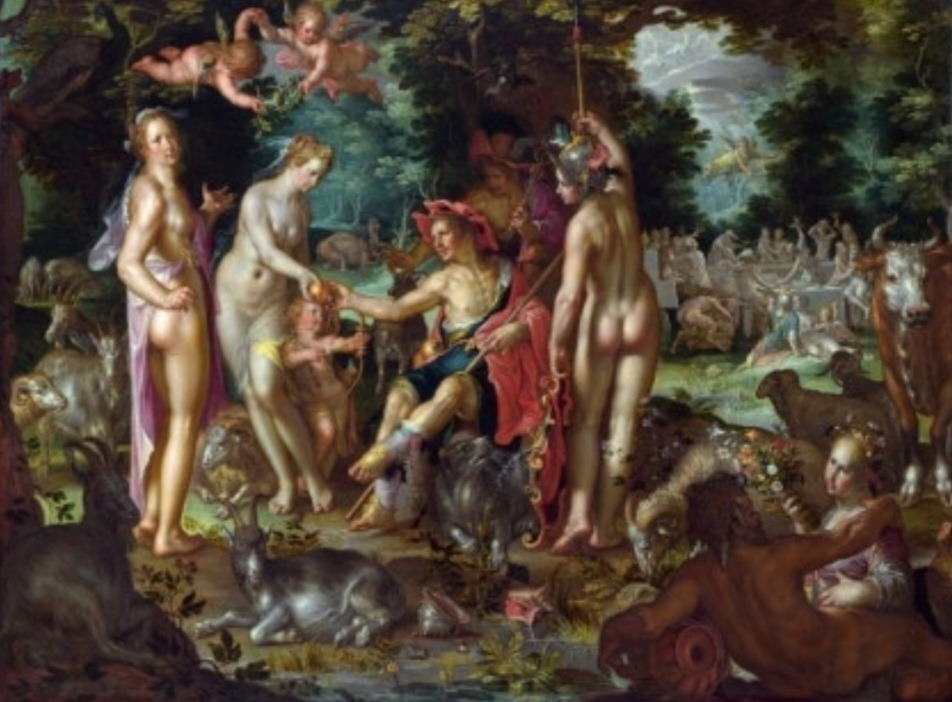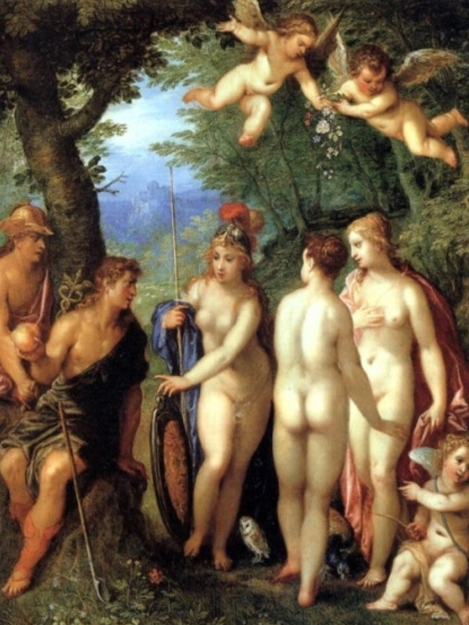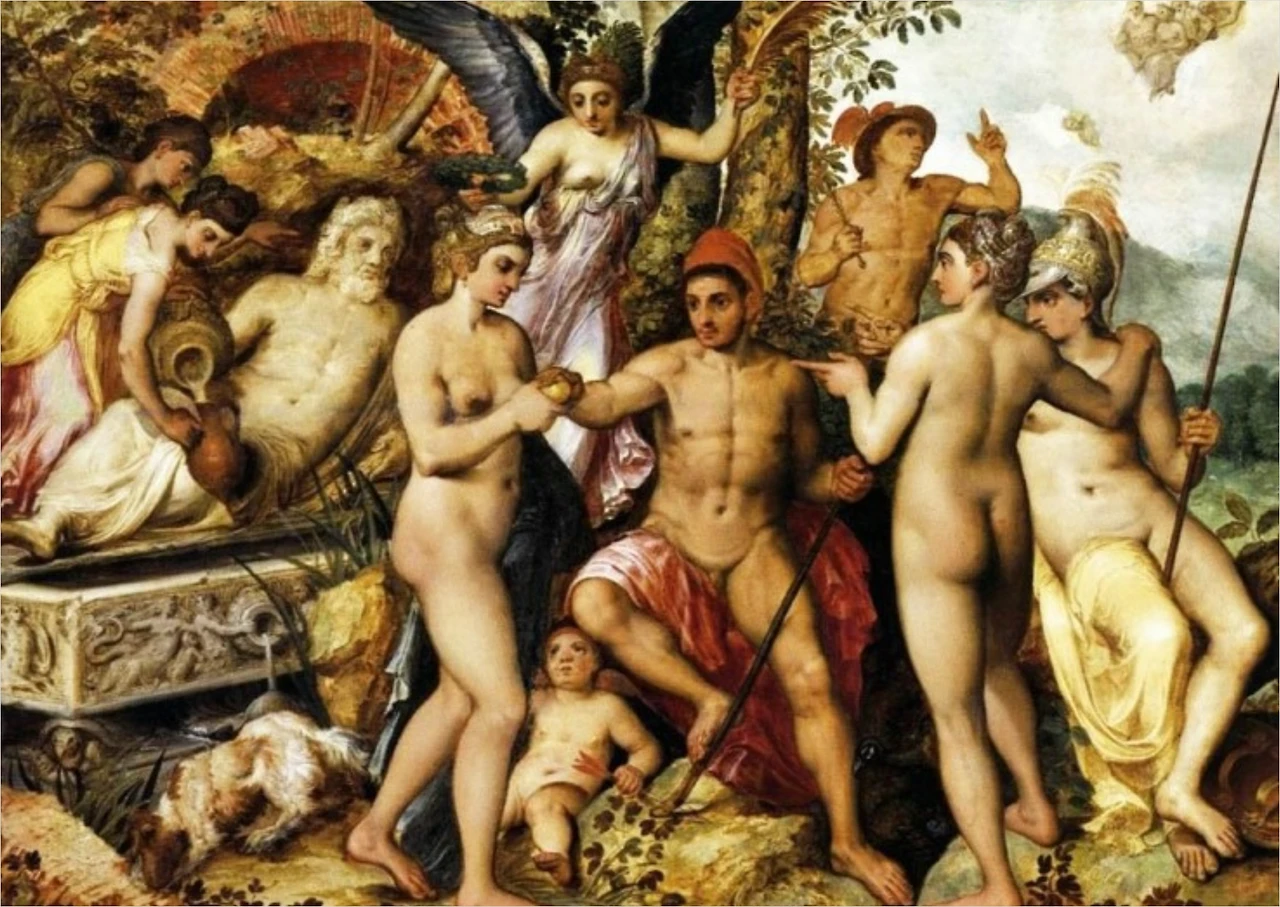 이것은 코르넬리스 판 하를럼(Cornelis van Haarlem)의 1628년경 작품이다. 아프로디테가 승리하자 아테나는 빡쳐서 돌아서서 있고, 헤라는 분노의 표시로 손가락질을 하고 있다.