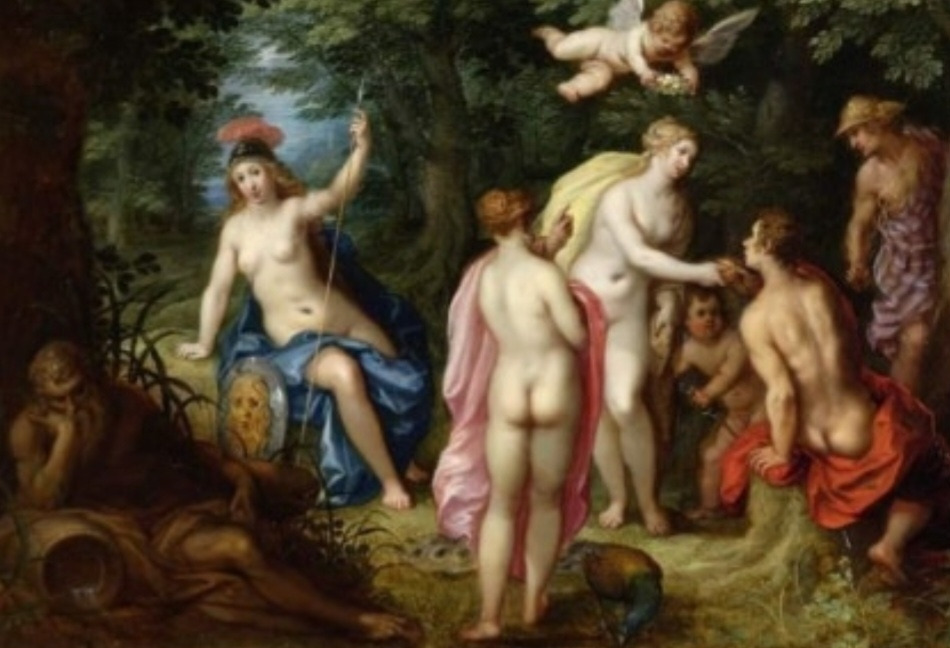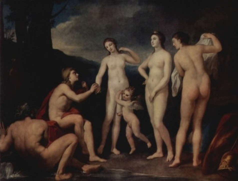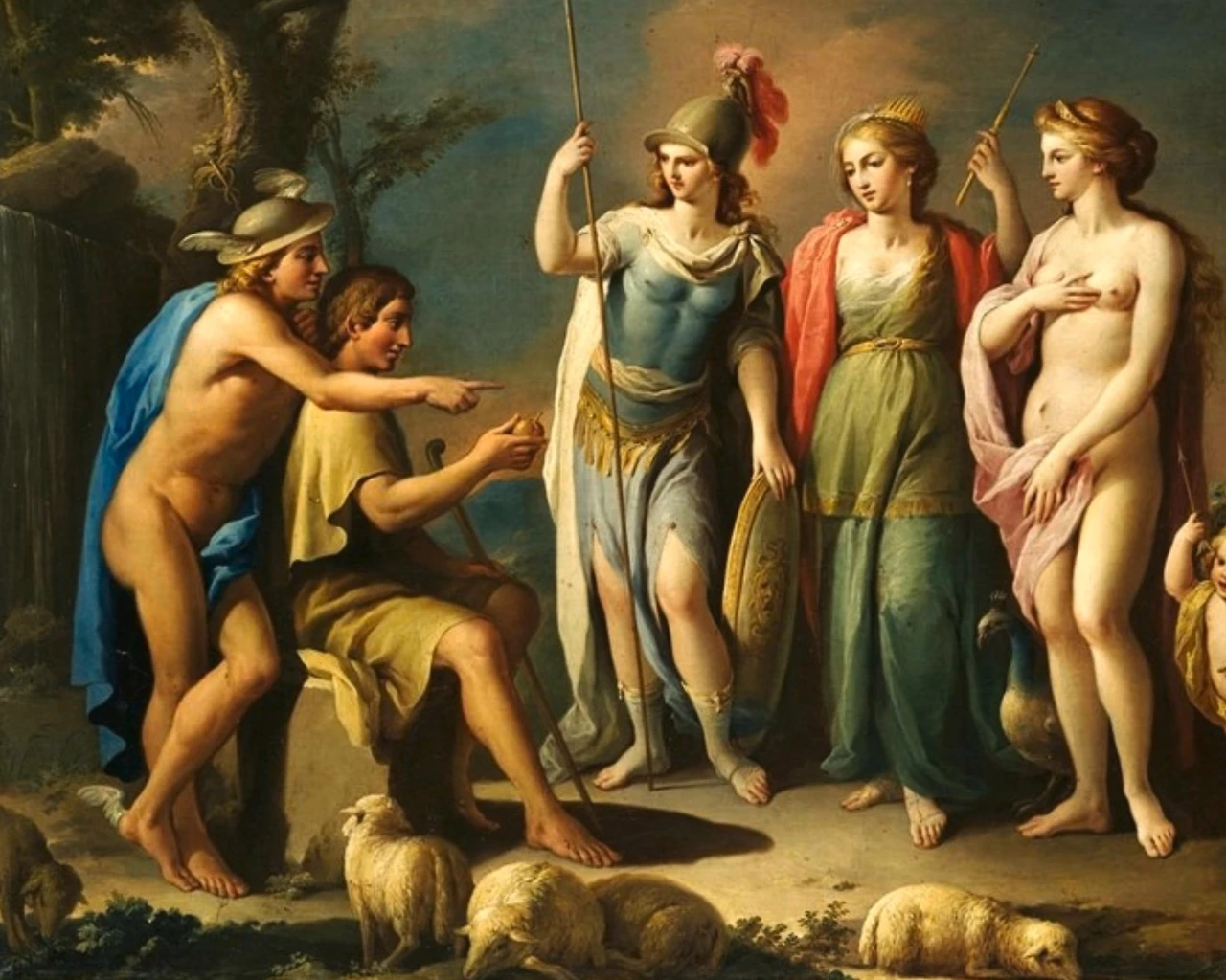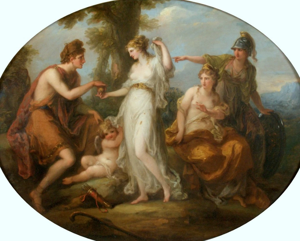 위는 스페인 화가 호세 카마론 보나나트(Jose Camaron Bonanat)의 1780년대 작품이다. 여기서도 발가벗은 여신은 에로스를 대동한 아프로디테이고, 공작새를 대동한 헤라와 투구와 방패를 가진 아테나는 성장(盛裝) 차림이다. 심사 과정도 필요 없이 파리스의 눈길과 손가락은 벌써 아프로디테를 가리키고 있다. 부귀영화도 명예도 필요 없다. 아름다운 여인을 취할 수만 있다면 모든 게 끝인 것이다.