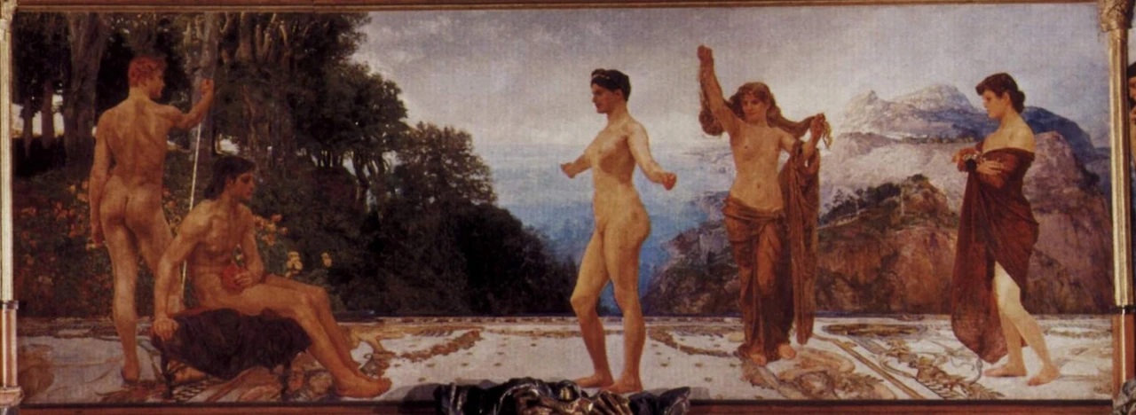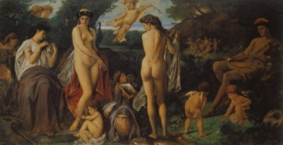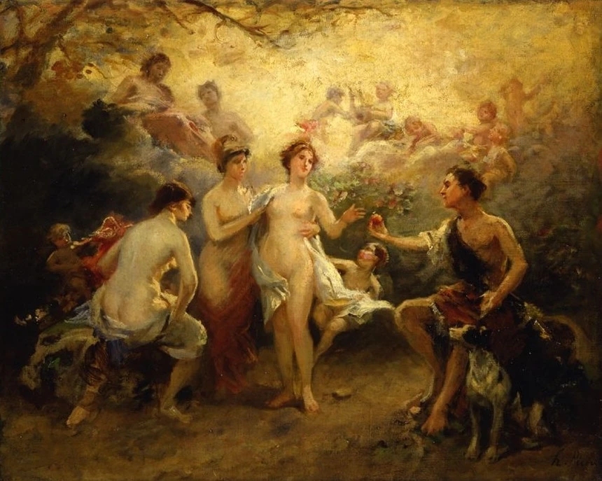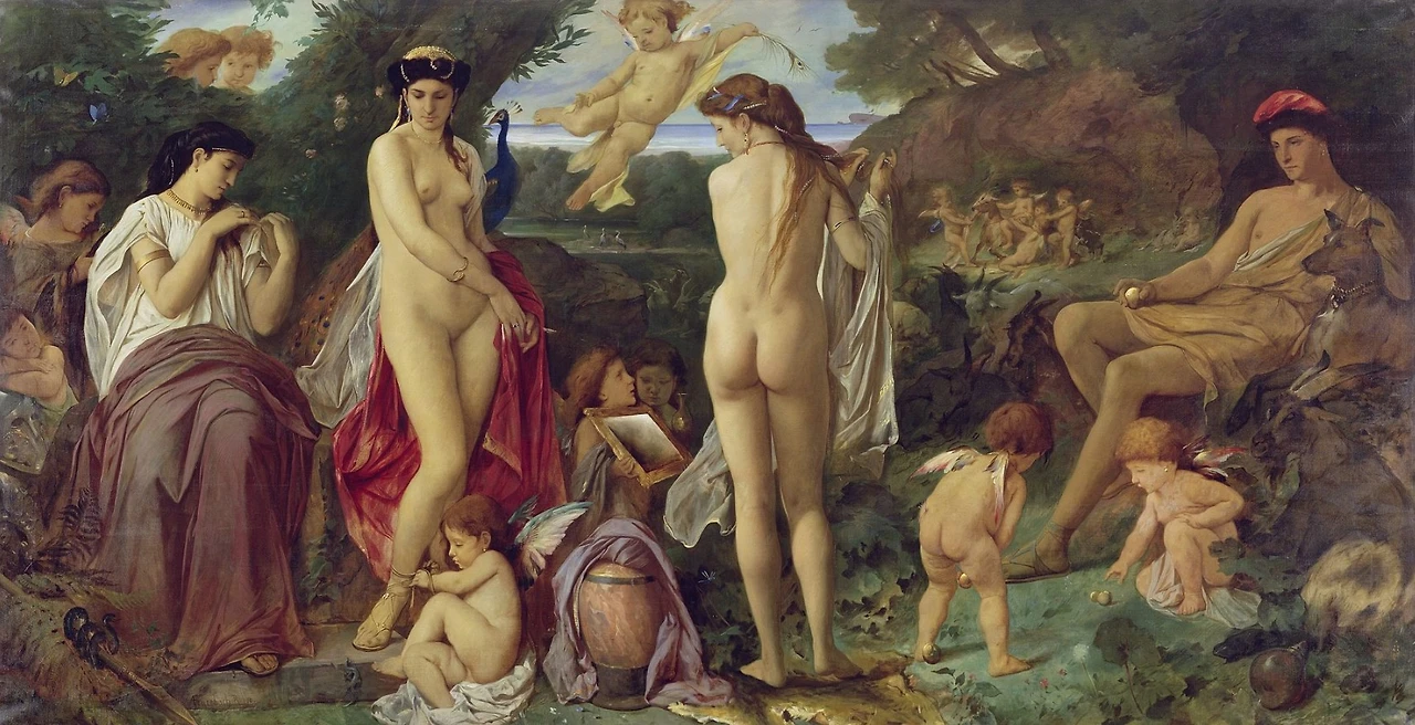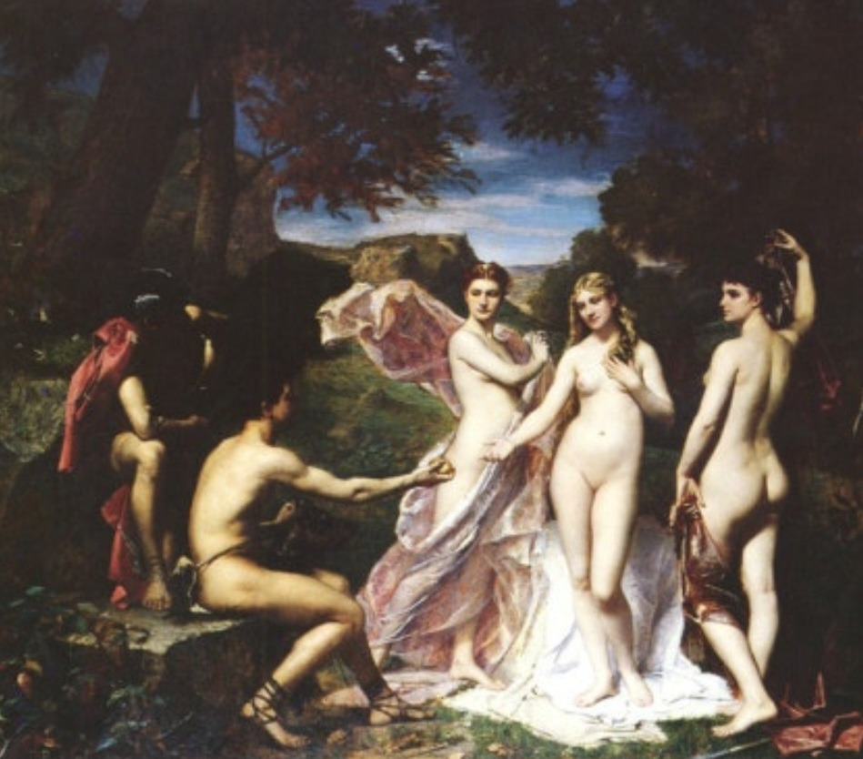 이것은 독일의 인상파 화가 안젤름 포이어바흐(Anselm Feuerbach)의 작품이다. 헤라만 입고 있고 두 여신은 벗은 채 심사를 받고 있다. 아프로디테의 늘씬한 몸매가 정말 눈부시다.