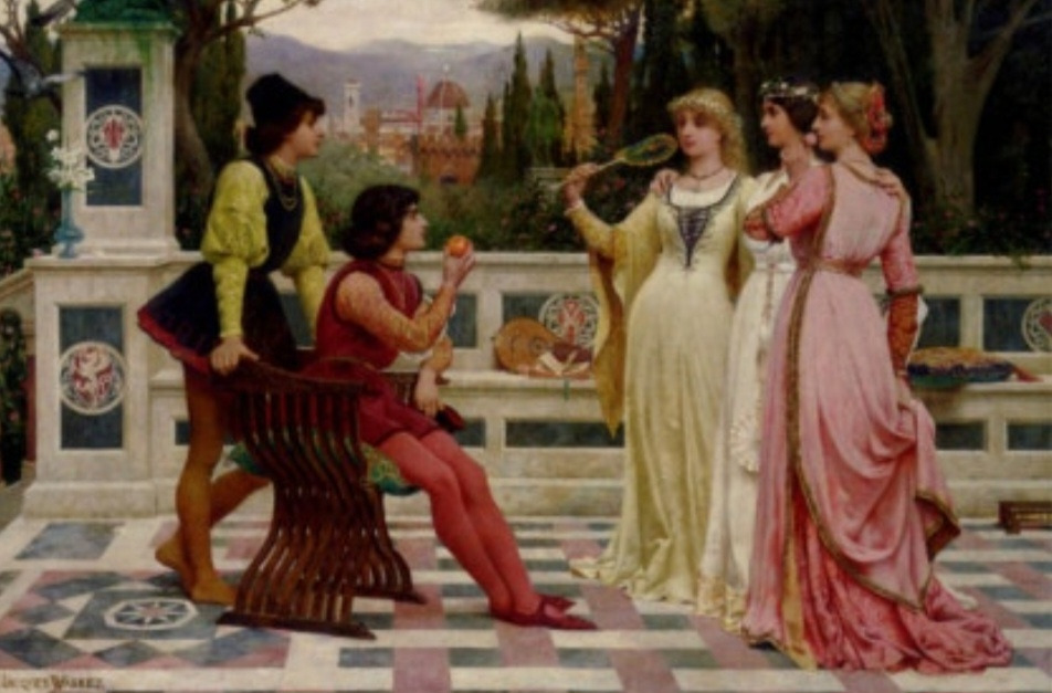 이 작품은 자크 클레망 바그레(Jaques Clement Wagrez)가 그린 것으로 세 여신 모두 옷을 성장(盛裝)하고 있다. 철저히 가려서 궁금증을 증폭시키는 애(曖)의 전략이다. 얼굴과 옷자랑이다. 여기서 노출은 옷 속에 가려진 신비함을 증폭시키는 효과를 노렸다.
