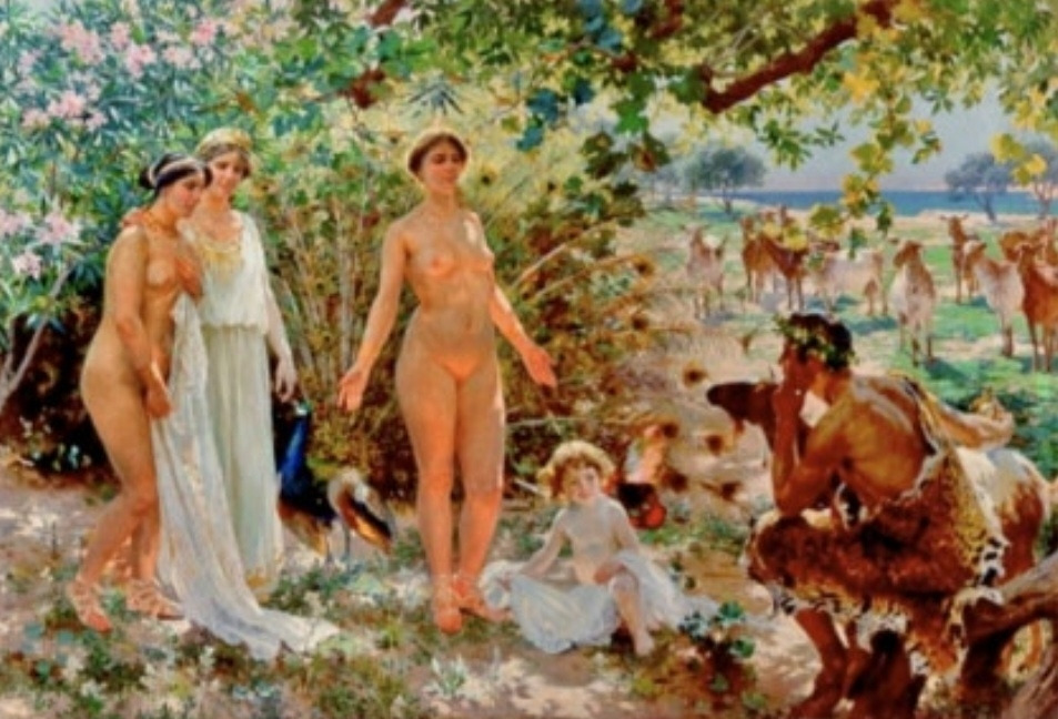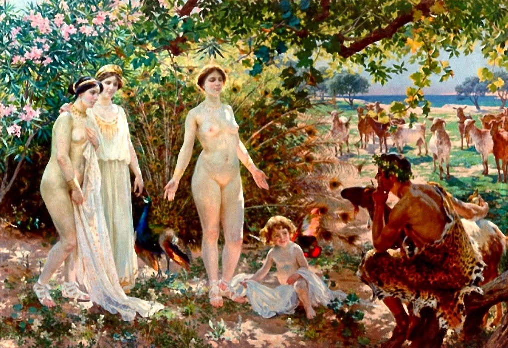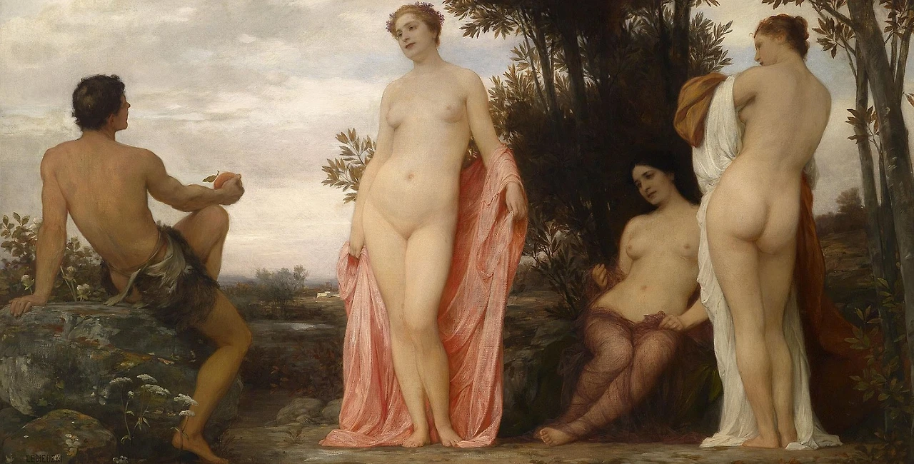 이것은 스페인 화가 엔리께 시몬네(Enrique Simonet)의 1900년대 작품이다. 실오라기 하나 걸치지 않은 아프로디테가 온몸을 활짝 열고 파리스를 향하여 미소를 짓고 있다. 헤라는 옷을 모두 입고 공작새의 화려한 날갯짓으로 관심을 끌려고 하지만 역부족이다. 아테나 또한 벗은 몸을 천으로 살짝 가린 채, 가리는 애(曖)와 드러내는 로(露)의 신비함을 노려보지만 여기서는 노출이 가림을 이기는 내러티브이다.