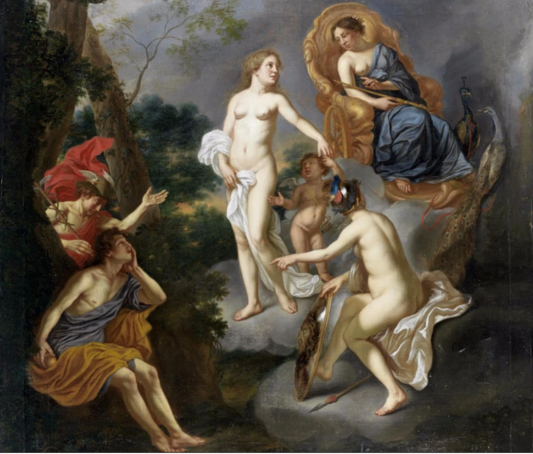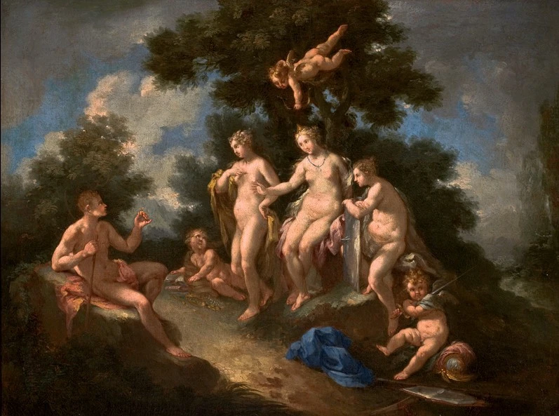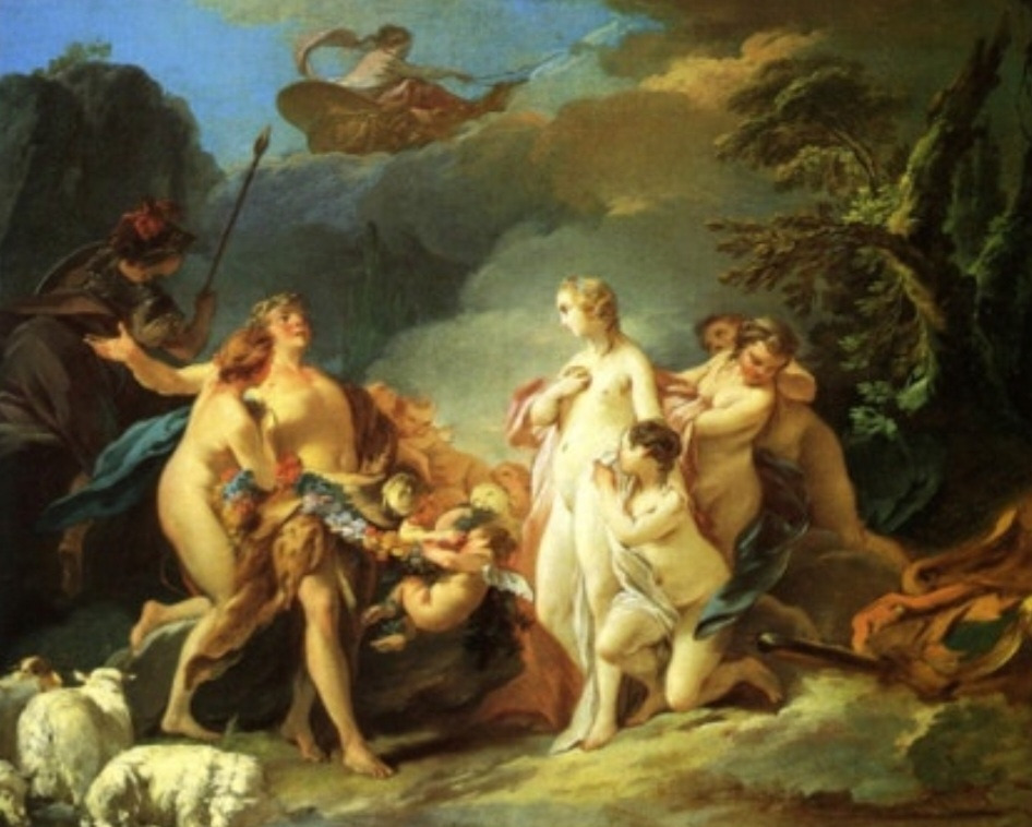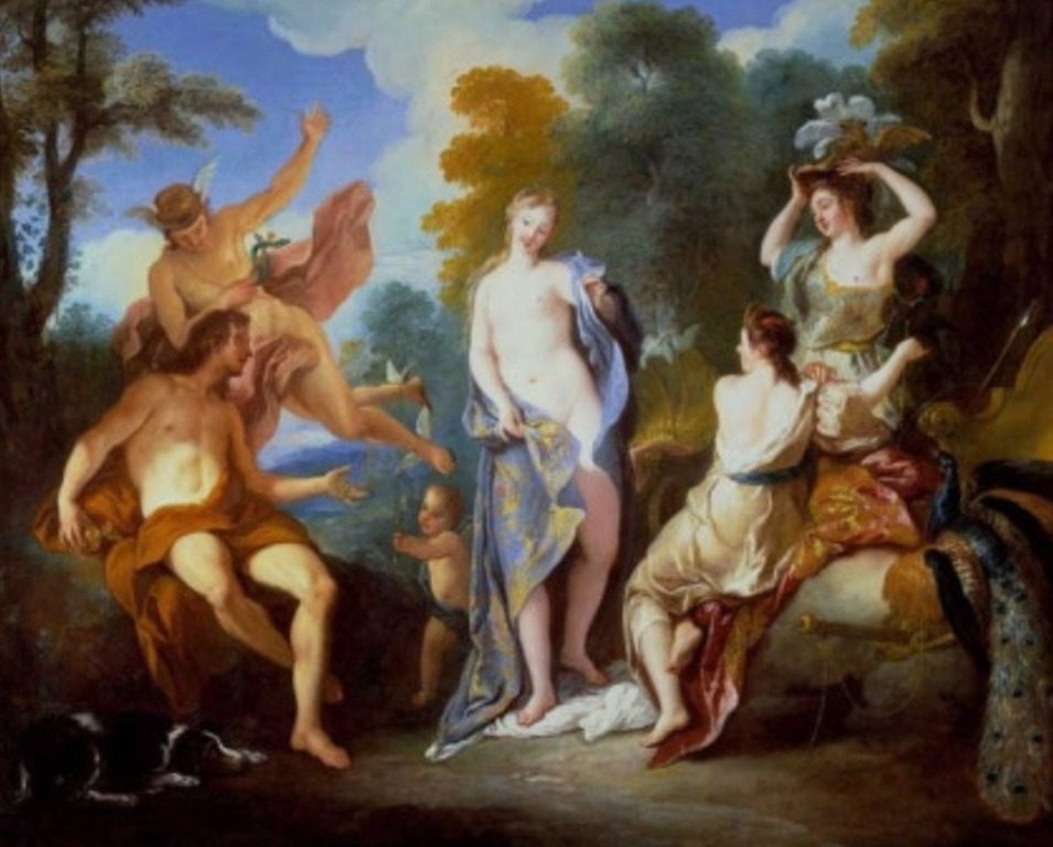 장 앙투안 와토(Jean-Antoine Watteau)의 1720년 경 작품이다. 이 건 미인대회의 요건을 못 갖춘 것 같다. 후보자 한 명에 대하여 심판을 한다는 것은 독점이나 마찬가지다. 어쨌든 황금사과는 주어지고 있다.