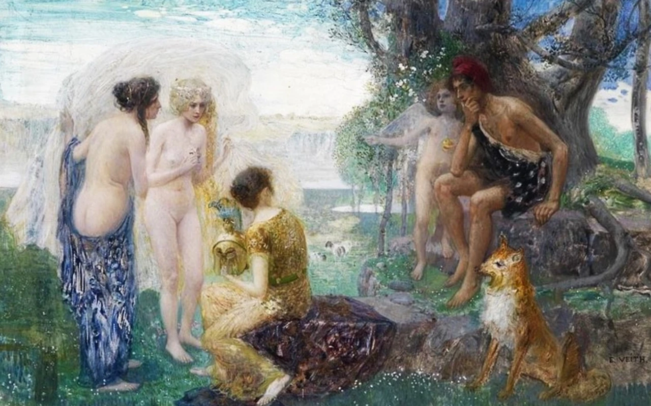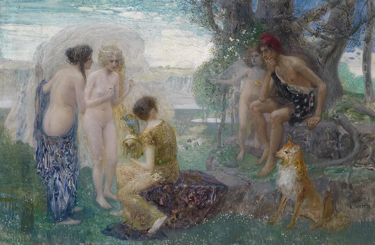 에드아르드 바이트(Eduard Vieth)의 1925년경 작품이다. 에로스가 심판관 파리스에게 하얀 면사포를 쓴 아프로디테에 대하여 열심히 설명하고 있다. 아테나는 옷을 입을 채이고, 헤라는 반쯤 벗은 몸으로 아프로디테 곁에 서있다. 사냥개가 매우 궁금한 눈초리로 세 여신을 바라보고 있다.