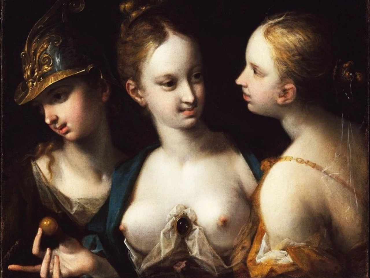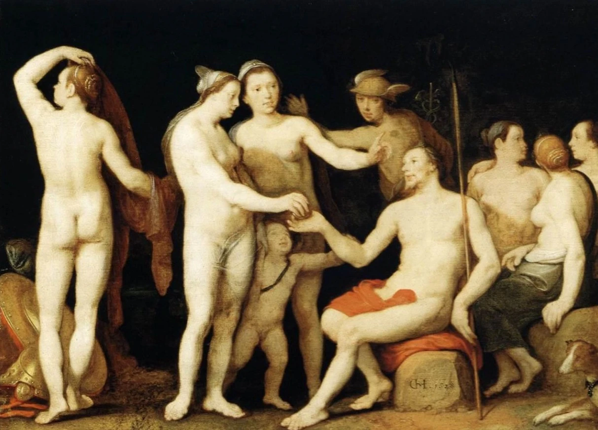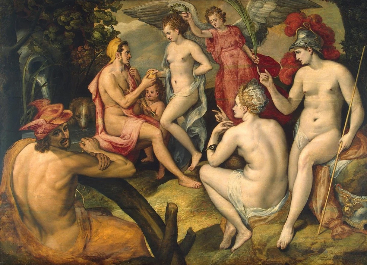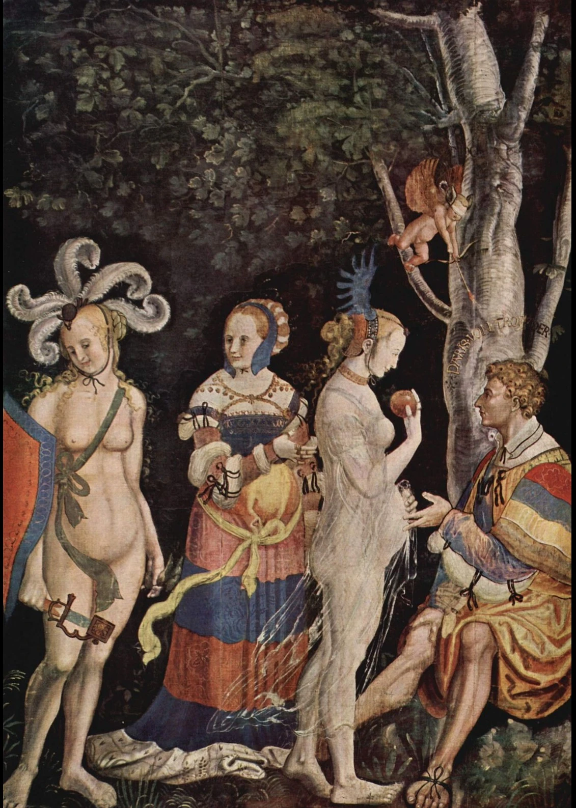 니클라우스 마뉴엘(Niklaus Manuel)의 1520년 경의 작품이다. 아테나도 벗고 도전해 보았지만 탈락하고, 헤라는 아예 벗지도 못하고 패배하고 만다. 파리스는 황금사과를 준 대신 아프로디테의 임신한 여인처럼 약간 불룩한 배를 쓰다듬으려는 포즈로 오인될 수 도 있겠다.