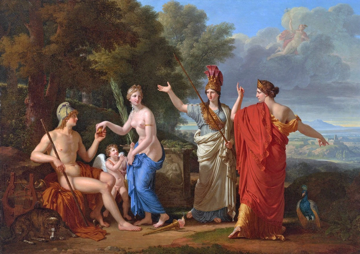 프랑스와 자비에르 파브르(François-Xavier Fabre)의 1808년 경 작품이다. 심판은 이미 끝났다. 아프로디테는 벗은 몸으로 승리에 취하여 득의 한 모습이다. 마치 파리스를 향해 안길 태세이지만 얼굴은 패배한 두 여신에게 승자의 미소를 보내고 있다. 패배한 헤라와 아테나는 작별의 손을 흔들며 떠나가고 있다. 공작새도 날개를 접고 시무룩하다.