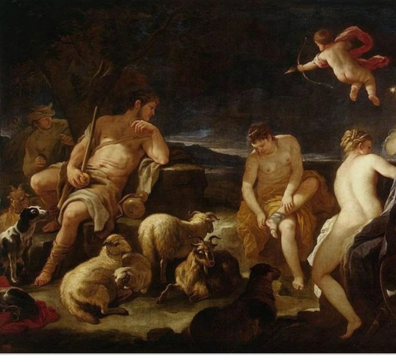 이것은 이탈리아 화가 루카 지오다노(Luca Giordano)의 작품이다. 경기는 이미 싱겁게 판정이 난 것 같은 분위기이다. 파리스의 눈은 한 곳에 고정된 채 집중되어 있다. 양 떼들도 심드렁한 표정이다. 빨리 끝내고 풀 좀 먹여주라는 태도이다.