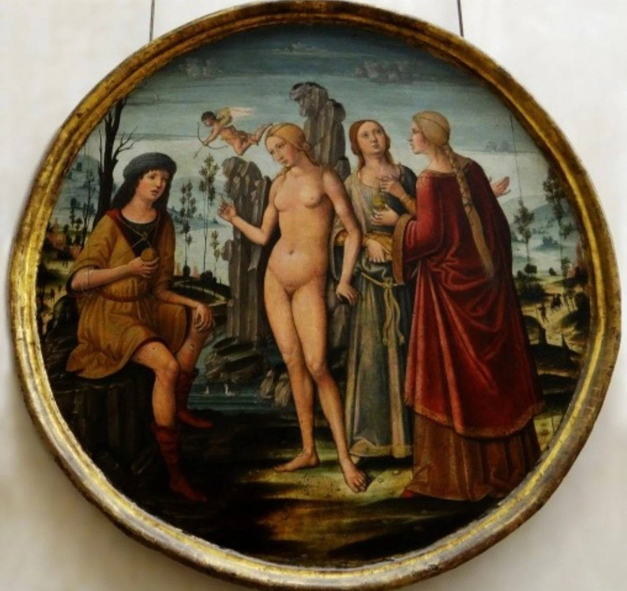 지롤라모 디 벤베누티(Girolamo di Benvenuto)는 1470에 태어나서 1520에 사망한 이탈리아 화가이다. 그도 이 작품에서 아프로디테만 벗은 몸이고 나머지 두 여신은 옷을 입은 모습이다.