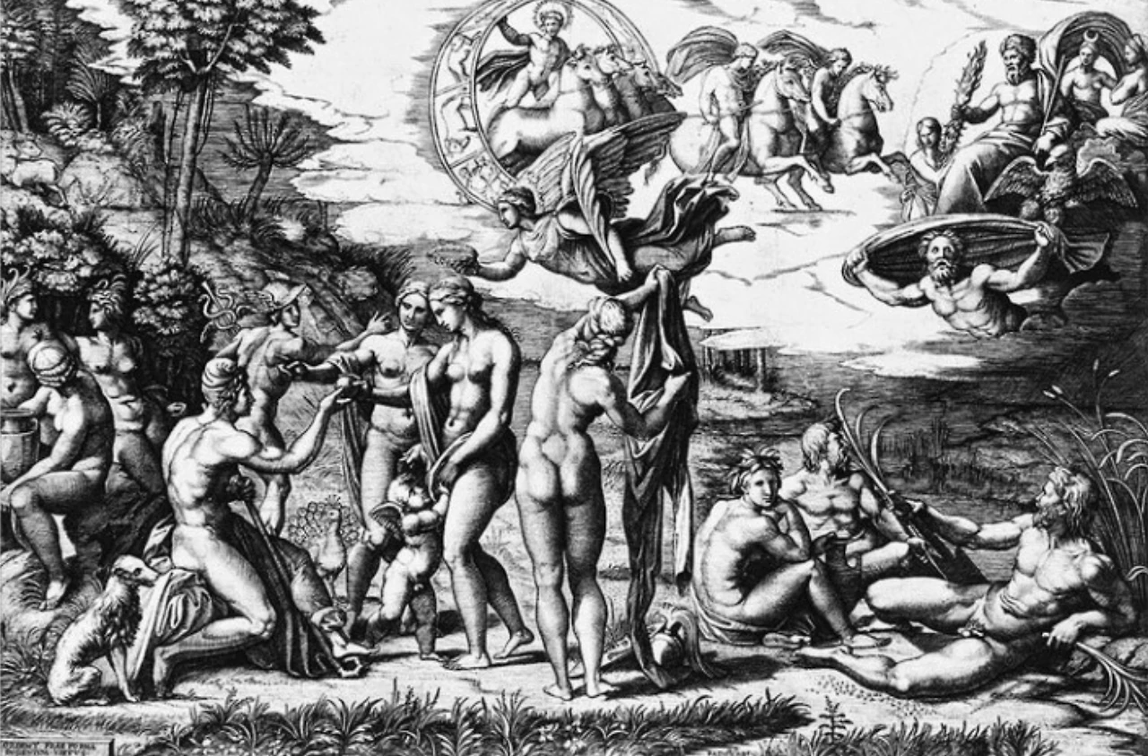 이것은 동판화이다. 라파엘로 산치오(Raffaello Sanzio)의 작품을 마르칸토니오 라이몬디(Marcantonio Raimondi)가 동판화로 제작한 것이다. 에로스를 대동한 아프로디테가 벌써 승리를 한 것이다. 파리스의 손에 든 사과는 그녀에게 넘어가고 있다.
