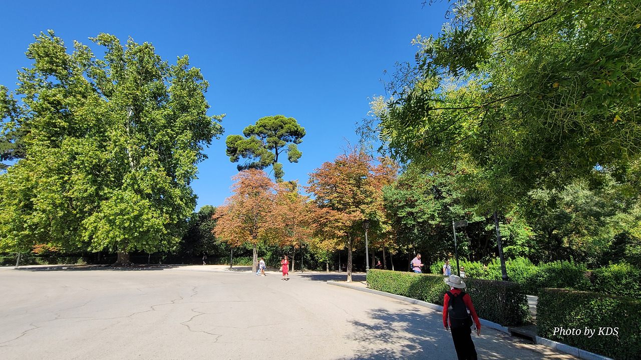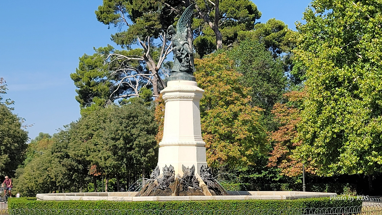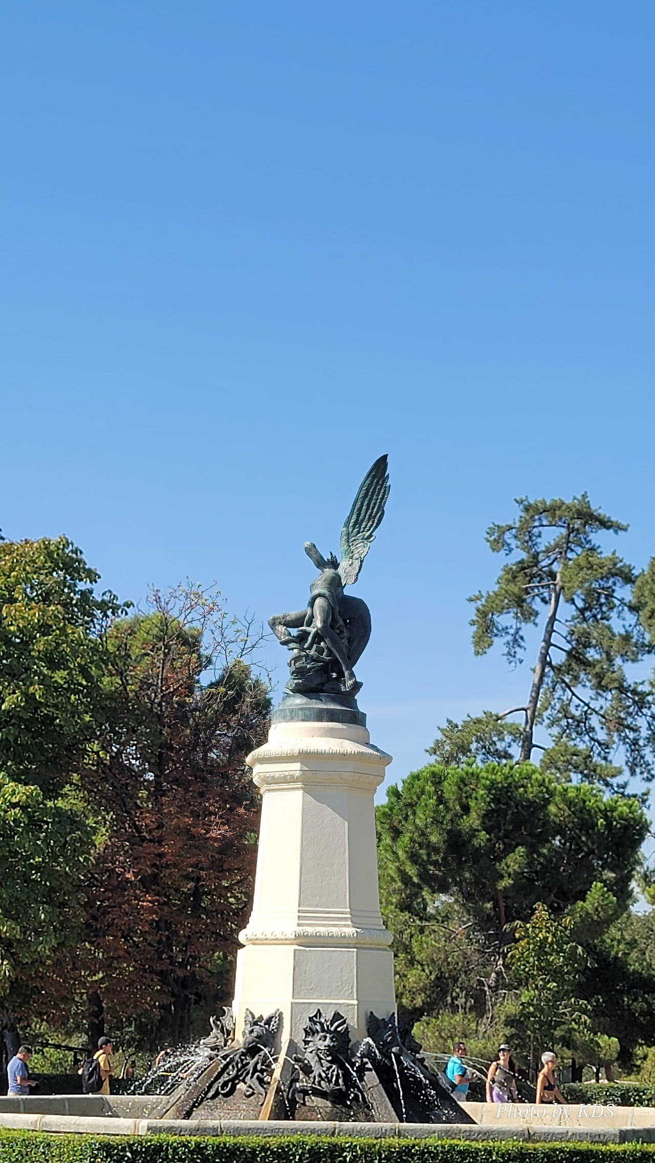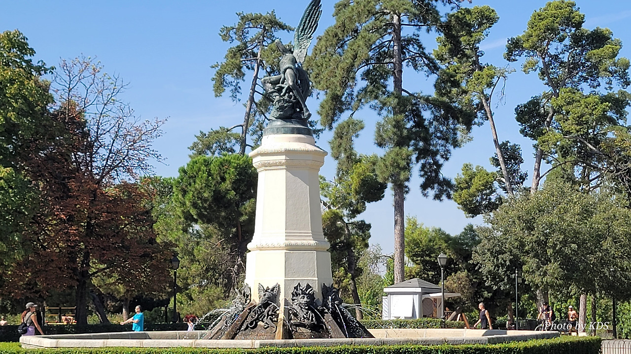 1880년 5월, 공공 사업부를 담당하는 건축가인 프란시스코 야레뇨(Francisco Jareño)가 벨버의 조각 작품이 놓일 받침대를 설계하라는 의뢰를 받았다. 타락한 천사(Fallen Angel)의 기념 분수는 화강암, 청동, 석재로 만들어졌으며, 큰 철탑을 갖춘 분수의 구조를 취하고 있다. 이 구조물은 1885년에 공식적으로 개장되었다. 대략적인 크기는 길이 10미터, 너비 10미터, 높이 7미터이고, Bellver의 조각품 높이는 2.65m이다. 분수는 원형 회양목 파테르로 둘러싸여 있다. 물이 떨어지는 넓은 웅덩이는 화강암으로 만들어졌으며, 팔각형 모양을 하고 있다. 중앙에는 받침대가 세워져 있다. 경사면과 같은 화강암 바닥은 잘린 피라미드 모양이며, 팔각형의 각 측면에는 청동 얼굴이 있다. 덮개는 도마뱀, 뱀, 돌고래를 손에 들고 있는 악마를 나타내며, 각각에는 물이 흐르는 세 개의 분수가 있다. 두 개의 다른 잘린 피라미드 몸체가 이 베이스에 위치하지만 경사가 덜하다. 그리고 세 번째 몸체는 높이가 훨씬 낮고 세 개의 원형 계단으로 구성되어 있으며, 그 위에 기념물 꼭대기의 주요 조각품이 놓여 있다. 날개를 펼치고 뒤틀린 타락한 천사는 바위(기초 역할을 함)에 기대어 있고, 큰 뱀이 그의 몸을 감고 있다. 이 모든 조각의 영감은 밀턴의 실낙원을 모티브로 제작된 것이다.