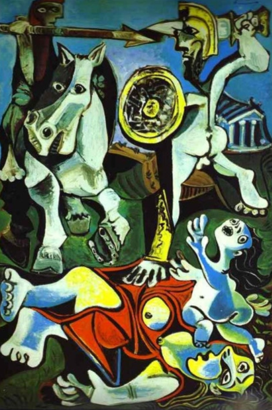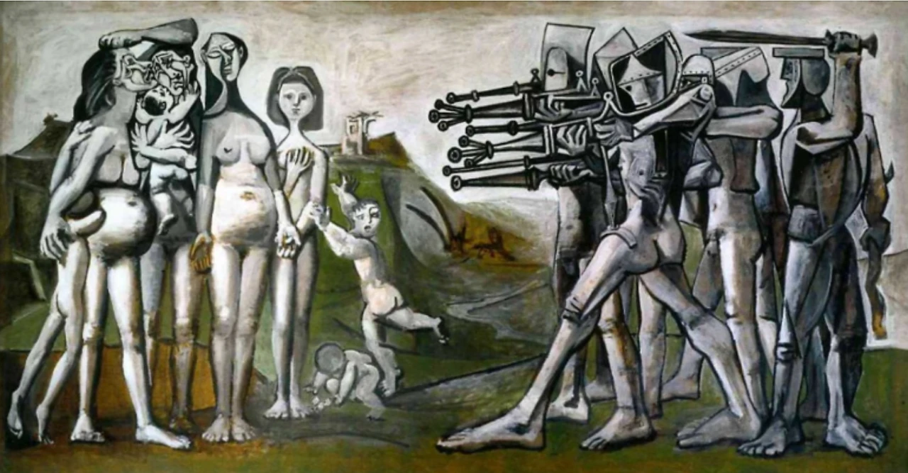 현대 한국사의 비극도 한몫한다. 바로 전쟁의 잔인함과 비극을 나타낸 <게르니카(Guernica)>와 비슷한 주제의 그림이지만 표현 방식이 너무나 대조적인 <한국에서의 학살(Massacre in Korea)>이다. 한국전쟁이 한창이던 1951년에 북한 공산당의 민원이 있었는지, 프랑스 공산당으로부터 미군들의 만행과 전쟁의 피해를 그려달라는 부탁을 받고 그린 작품이다. 벌거벗은 여인들과 어린아이들이 바로 총탄 앞에서 학살당하기 바로 전 모습이다. 어린아이는 천진난만하게 아무것도 모르고 땅바닥에서 흙장난을 하고 있고, 임신하여 배가 부른 여인들도 있다. 이 그림은 당연히 한국으로 반입하는 게 금지당했다. 프랑스 자유진영에서도 반발을 했고, 결국은 주문한 공산당도 외면하고 말았다. 게르니카 보다는 훨씬 더 사실적이고 에로틱한 작품이다.