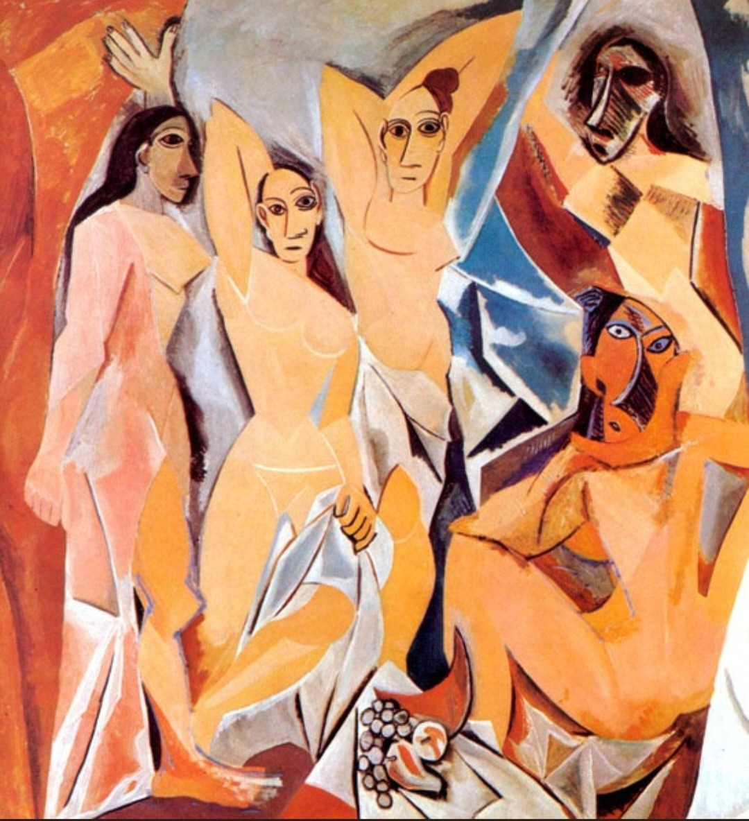 그의 걸작인 <아비뇽의 처녀들(Les Demoiselles d'Avignon)>은 총 다섯 명의 매춘부들이 나온다. 왼쪽의 세 여인은 문외한이 보기에도 약간 쭉쭉빵빵한 매춘부를 그런대로 묘사하고 있다. 그런데 오른쪽의 두 여인이 좀 다르다. 왜냐하면 얼굴에 위험하고 불운한 것으로부터 보호한다는 주술적인 아프리카 가면을 쓰고 있는 것이다. 그는 당시 쾌락의 도시인 파리에 만연해 있던 성병으로부터의 보호를 기원하고자 했다는데 믿거나 말거나 이다. 매춘굴에 들어오면 성병이 전염될 위험이 매우 높은데 이런 주술적인 방법이 통할까? 과거에 아비뇽에 출장 갔을 때 피카소의 그림 제목이 생각나서 아비뇽 처녀들이 어디 있었느냐고 알아보니 스페인 바르셀로나에 있는 매춘거리란다. 사실 이 그림 가장 왼쪽의 여인은 원래 홍등가로 들어오는 남자 선원이었다. 하지만 수십 차례의 데생과 무수한 수정 작업의 덧칠을 거치면서 변하고 변했단다. 최초에는 걸어 들어오는 선원과 해골을 들고 있는 대학생으로 구상했는데, 이 선원만 남는 안으로 변했다가 다시 최종적으로 다섯 명의 여자로 탄생했다.