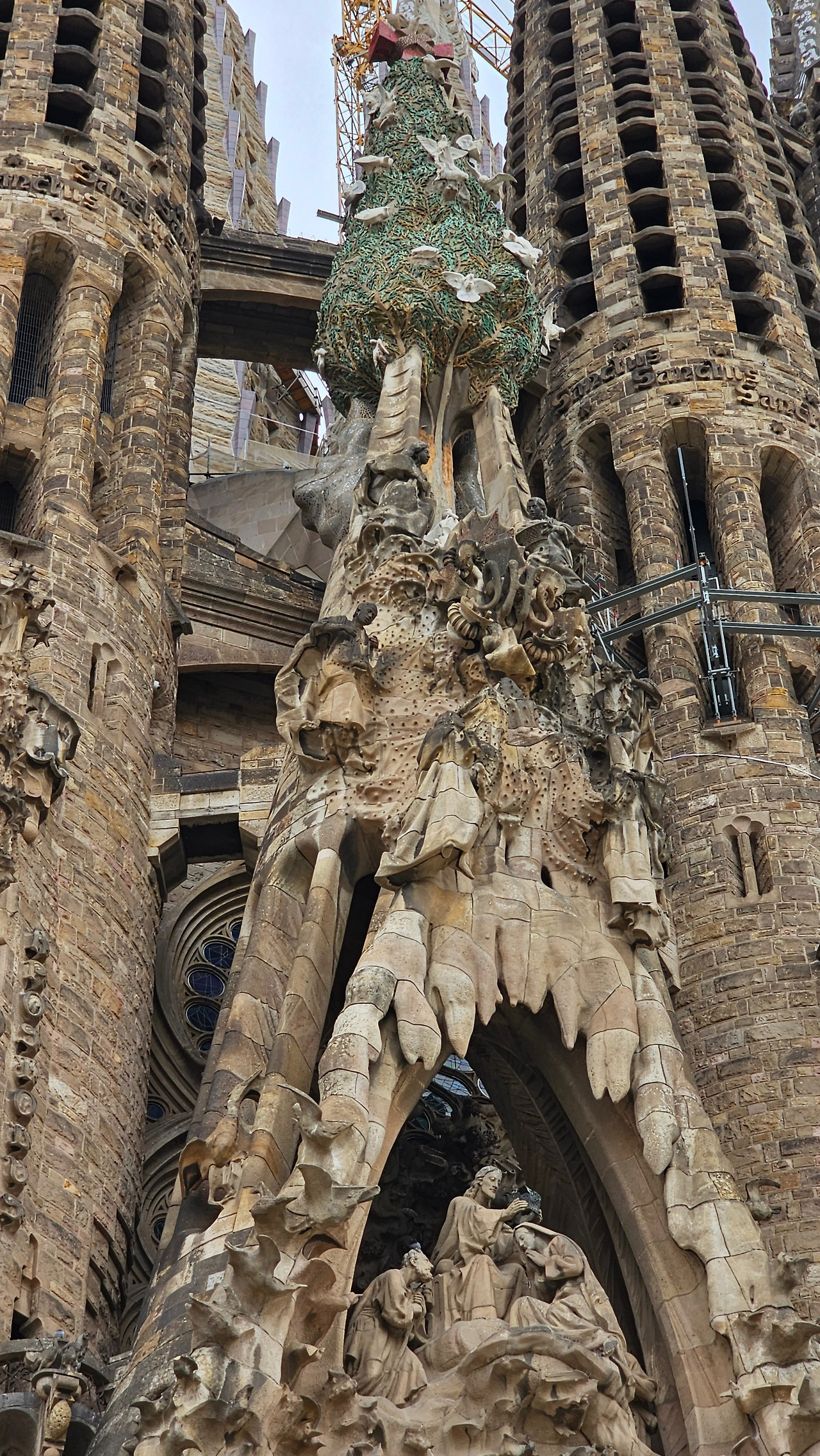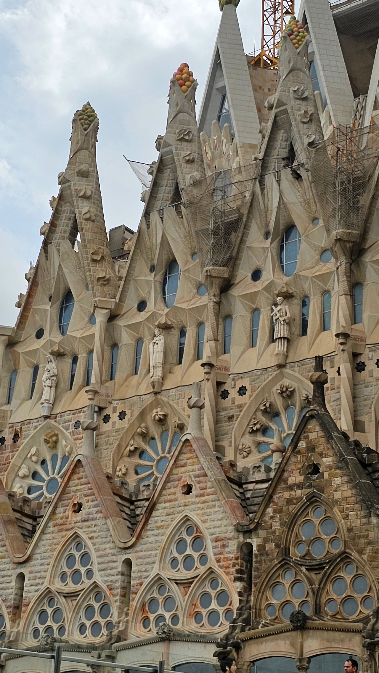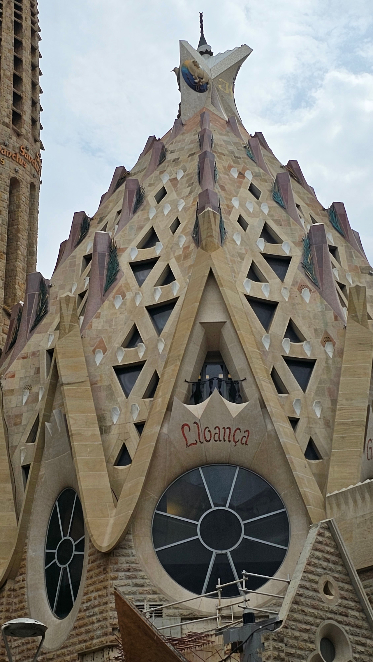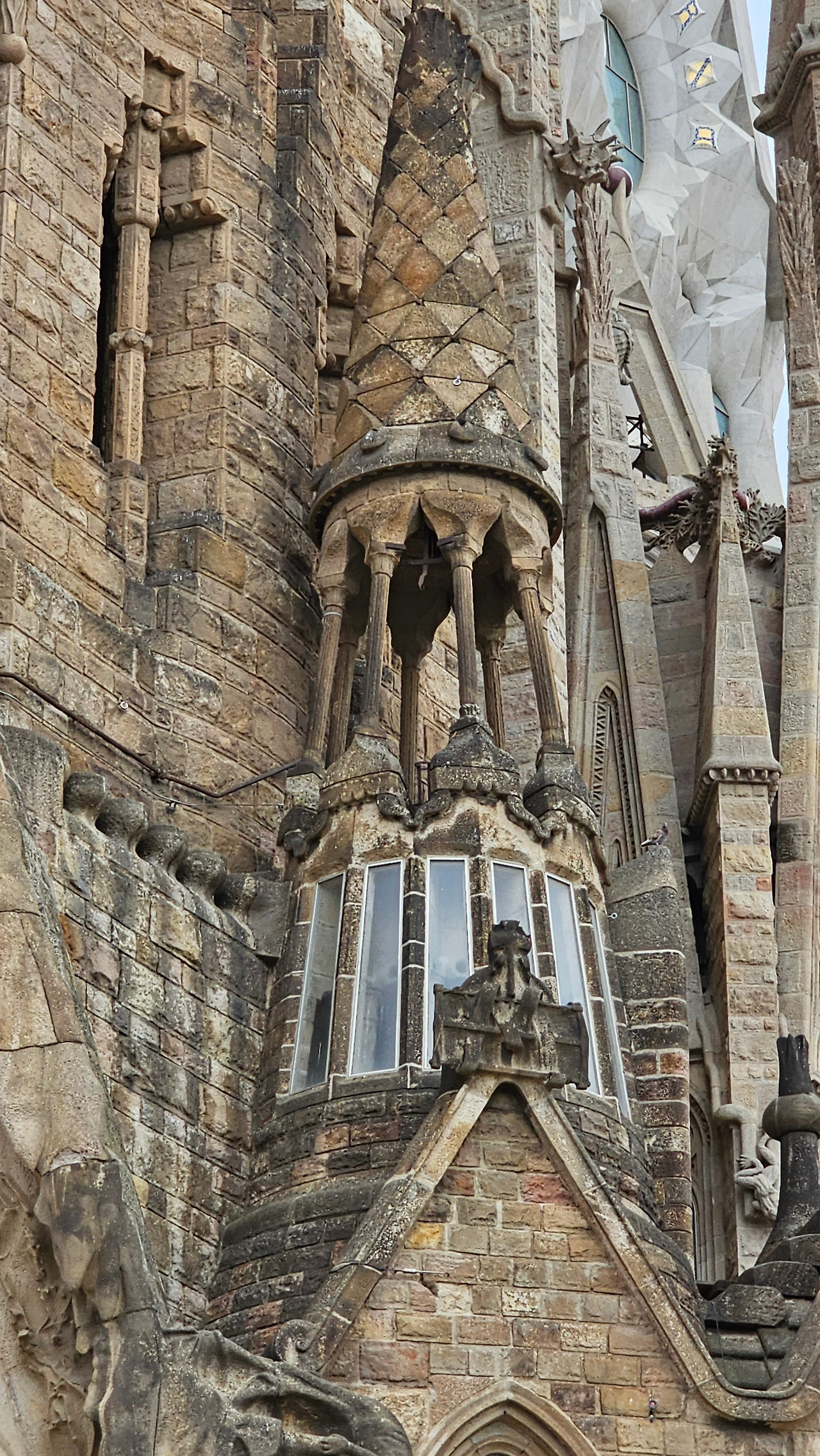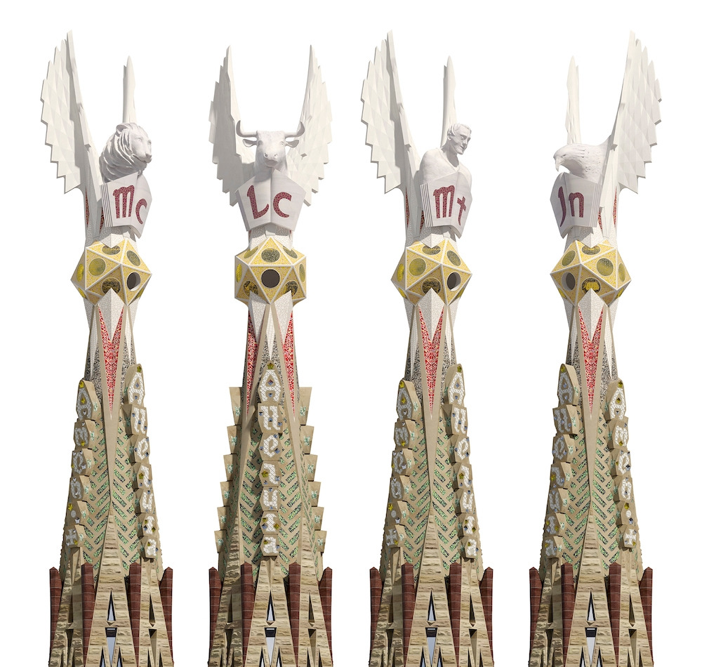 이 성당의 압권은 뭐니 뭐니 해도 100m 이상 높이의 첨탑이다. 가장 낮은 첨탑이 그리스도의 12 사도를 상징하는 12개의 종탑이다. 정면 4개, 좌우 측면에 각각 4개씩 설치되었다. 후면에는 성모 마리아 탑(138m) 하나만 있고, 꼭대기에는 별이 얹혀있다. 별은 지름 7.5미터, 무게 5.5톤짜리 12각 별인데, 낮에는 햇빛이 반사되고 밤에는 조명이 켜져서 빛이 난다. 이 큰 별을 보좌하듯이 왕관모양의 작은 별 12개가 둘러싸고 있다. 루가(Lc : 황소), 요한(Jn : 독수리), 마르코(Mc : 사자), 마태오(Mt : 천사) 등 4명의 복음사가 탑은 135m로 중앙의 예수 그리스도 탑을 둘러싸고 있다. 루가/마르코 탑에는 엘리베이터가, 마태오/요한 탑에는 계단이 설치되었다. 가장 높은 예수 그리스도 탑의 설계상 높이는 172.5m이다. 이는 바르셀로나 몬주익 언덕의 꼭대기가 173m라서 하느님이 창조한 언덕의 높이보다 탑을 더 높게 만들 수 없다고 생각한 가우디 신앙심의 표출이다. 우리에게 특이한 것은 영광의 파사드 주 출입문에 50개 언어로 주님의 기도를 새겨 놓았다. 양쪽 아래에 "오늘 우리에게 필요한 양식을 주옵소서"라고 한국어 글귀도 있다. 잘 찾아보기 바란다.