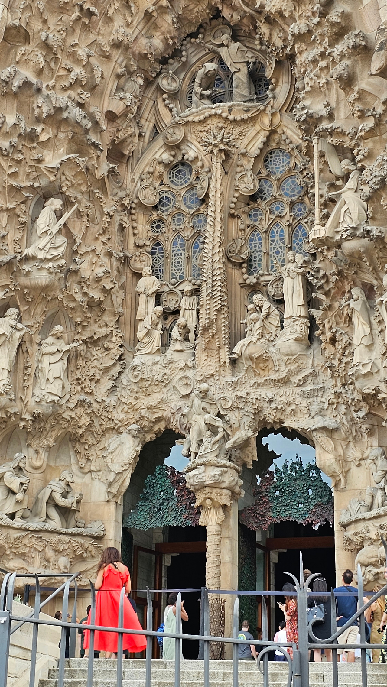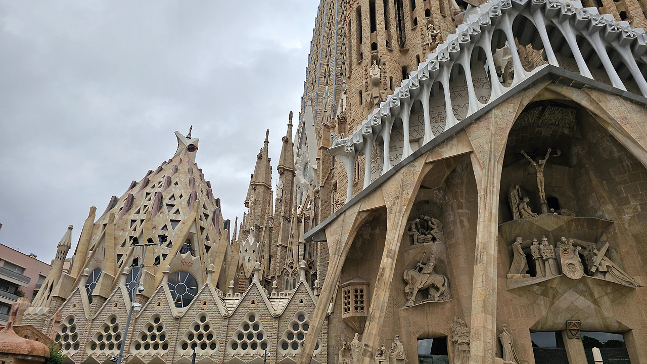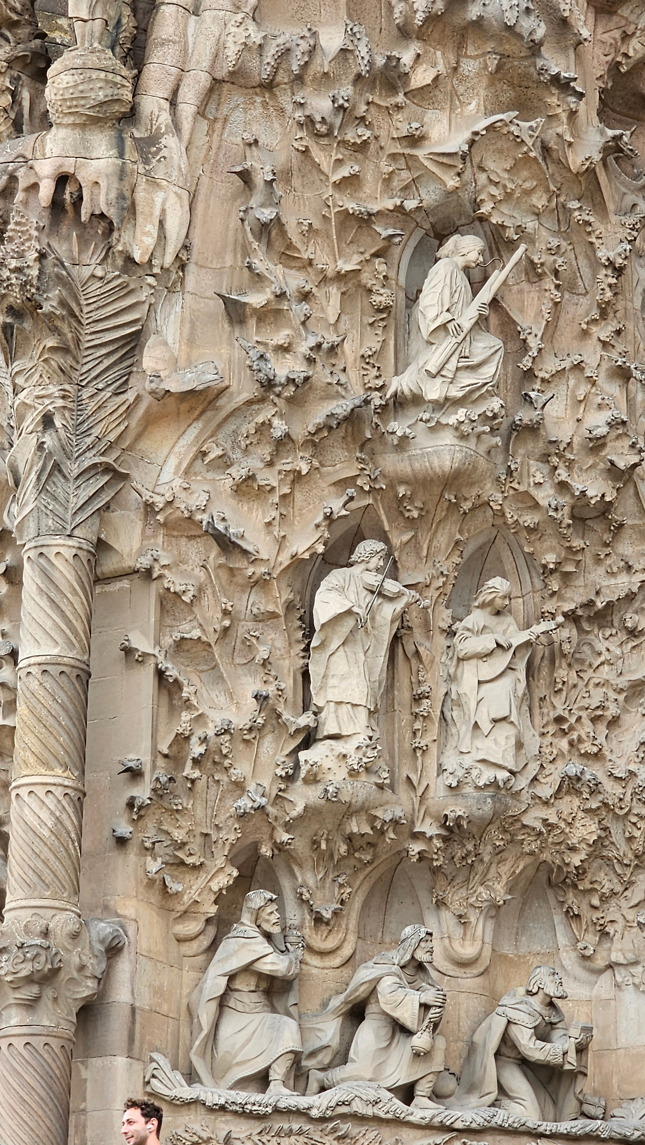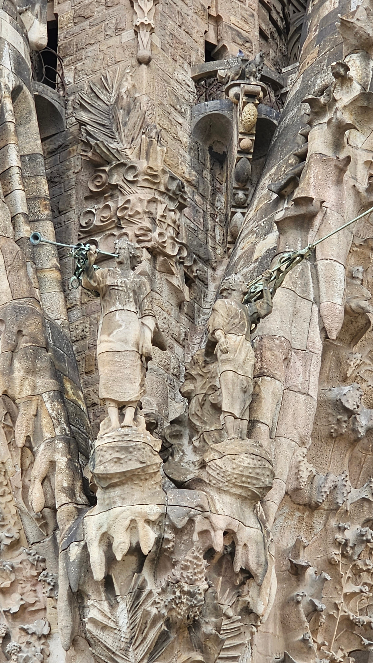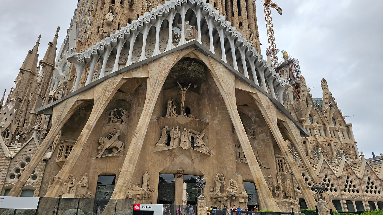 이 성당의 압권은 뭐니 뭐니 해도 100m 이상 높이의 첨탑이다. 가장 낮은 첨탑이 그리스도의 12 사도를 상징하는 12개의 종탑이다. 정면 4개, 좌우 측면에 각각 4개씩 설치되었다. 후면에는 성모 마리아 탑(138m) 하나만 있고, 꼭대기에는 별이 얹혀있다. 별은 지름 7.5미터, 무게 5.5톤짜리 12각 별인데, 낮에는 햇빛이 반사되고 밤에는 조명이 켜져서 빛이 난다. 이 큰 별을 보좌하듯이 왕관모양의 작은 별 12개가 둘러싸고 있다. 루가(Lc : 황소), 요한(Jn : 독수리), 마르코(Mc : 사자), 마태오(Mt : 천사) 등 4명의 복음사가 탑은 135m로 중앙의 예수 그리스도 탑을 둘러싸고 있다. 루가/마르코 탑에는 엘리베이터가, 마태오/요한 탑에는 계단이 설치되었다. 가장 높은 예수 그리스도 탑의 설계상 높이는 172.5m이다. 이는 바르셀로나 몬주익 언덕의 꼭대기가 173m라서 하느님이 창조한 언덕의 높이보다 탑을 더 높게 만들 수 없다고 생각한 가우디 신앙심의 표출이다. 우리에게 특이한 것은 영광의 파사드 주 출입문에 50개 언어로 주님의 기도를 새겨 놓았다. 양쪽 아래에 "오늘 우리에게 필요한 양식을 주옵소서"라고 한국어 글귀도 있다. 잘 찾아보기 바란다.