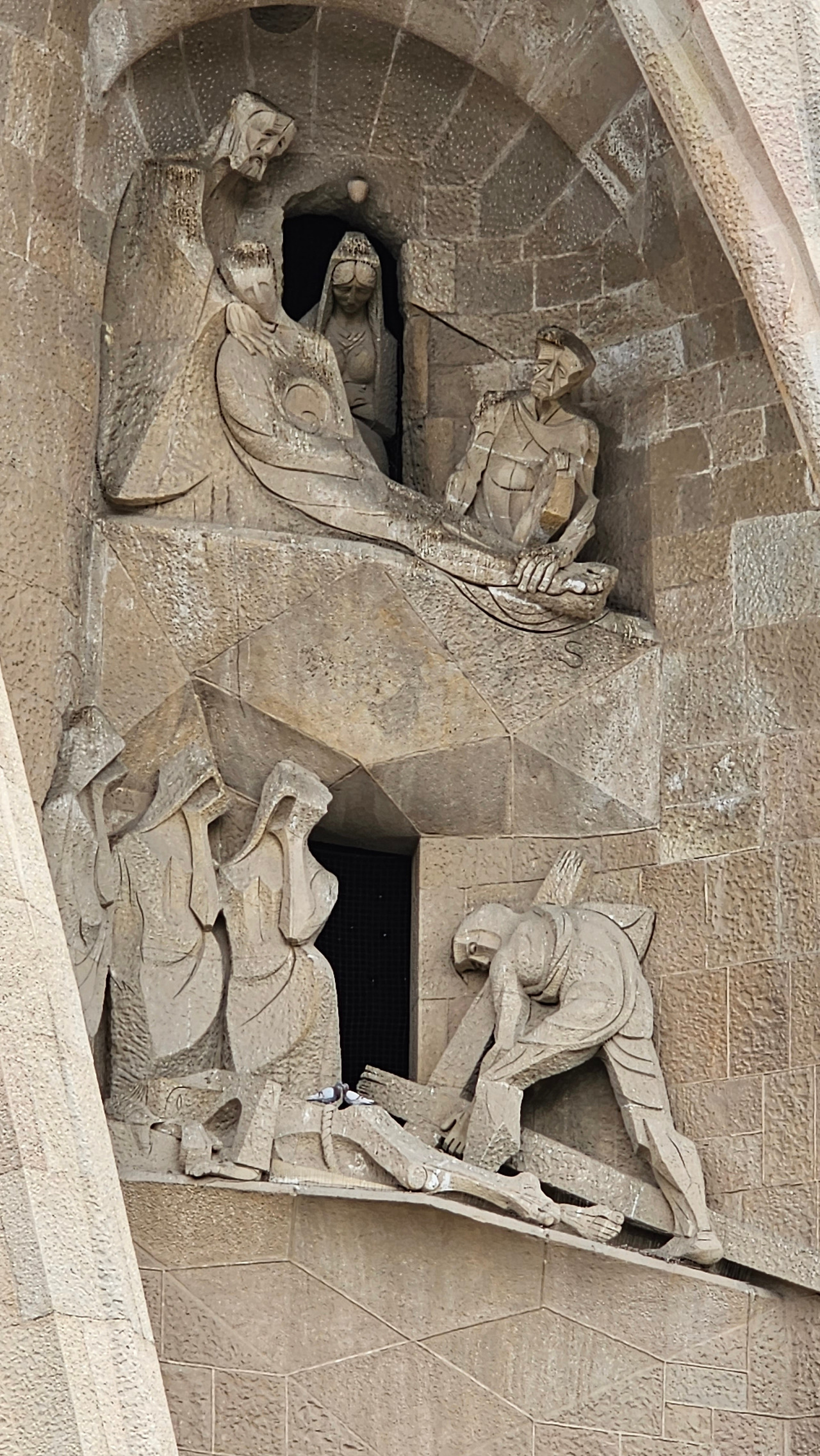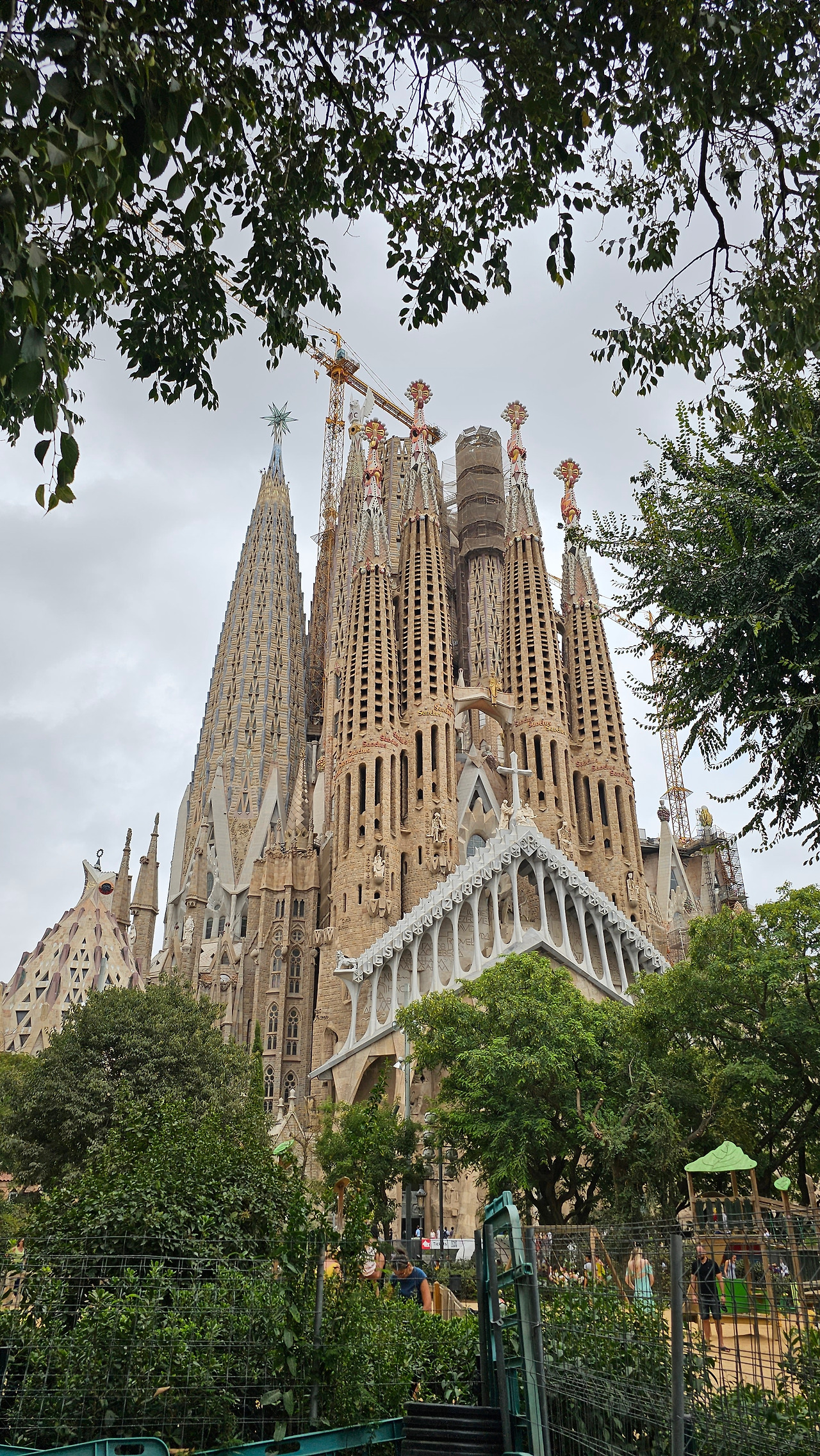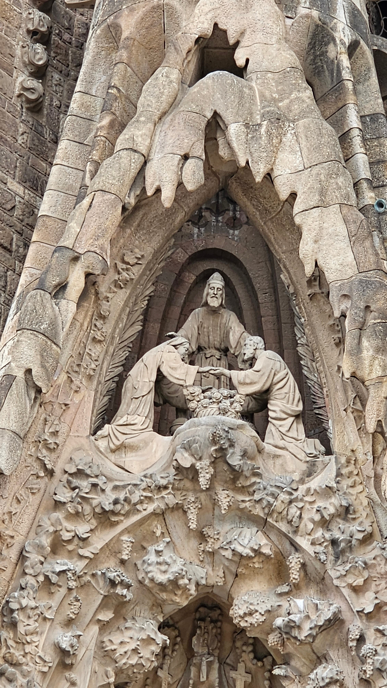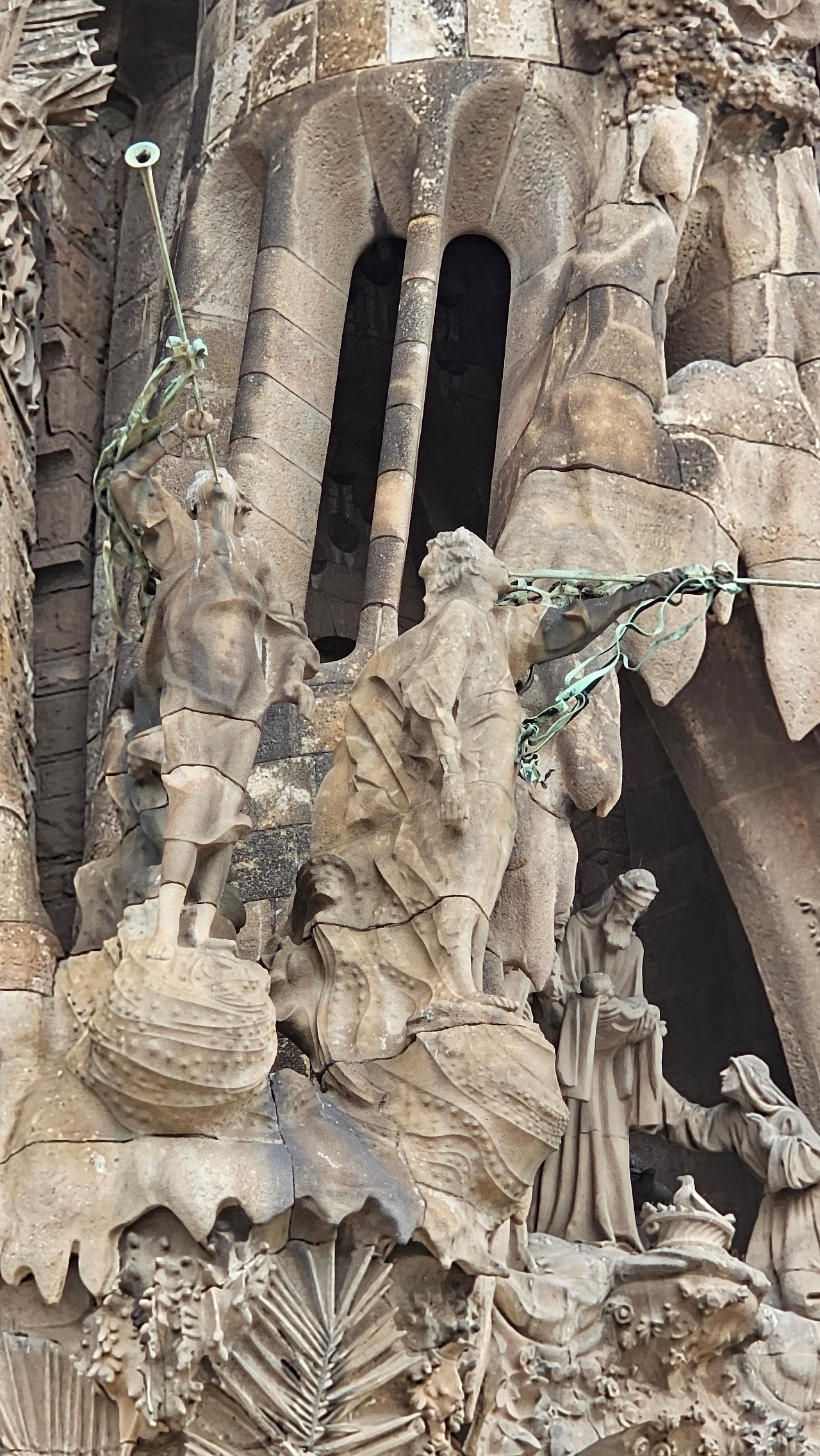 이 성당의 압권은 뭐니 뭐니 해도 100m 이상 높이의 첨탑이다. 가장 낮은 첨탑이 그리스도의 12 사도를 상징하는 12개의 종탑이다. 정면 4개, 좌우 측면에 각각 4개씩 설치되었다. 후면에는 성모 마리아 탑(138m) 하나만 있고, 꼭대기에는 별이 얹혀있다. 별은 지름 7.5미터, 무게 5.5톤짜리 12각 별인데, 낮에는 햇빛이 반사되고 밤에는 조명이 켜져서 빛이 난다. 이 큰 별을 보좌하듯이 왕관모양의 작은 별 12개가 둘러싸고 있다. 루가(Lc : 황소), 요한(Jn : 독수리), 마르코(Mc : 사자), 마태오(Mt : 천사) 등 4명의 복음사가 탑은 135m로 중앙의 예수 그리스도 탑을 둘러싸고 있다. 루가/마르코 탑에는 엘리베이터가, 마태오/요한 탑에는 계단이 설치되었다. 가장 높은 예수 그리스도 탑의 설계상 높이는 172.5m이다. 이는 바르셀로나 몬주익 언덕의 꼭대기가 173m라서 하느님이 창조한 언덕의 높이보다 탑을 더 높게 만들 수 없다고 생각한 가우디 신앙심의 표출이다. 우리에게 특이한 것은 영광의 파사드 주 출입문에 50개 언어로 주님의 기도를 새겨 놓았다. 양쪽 아래에 "오늘 우리에게 필요한 양식을 주옵소서"라고 한국어 글귀도 있다. 잘 찾아보기 바란다.