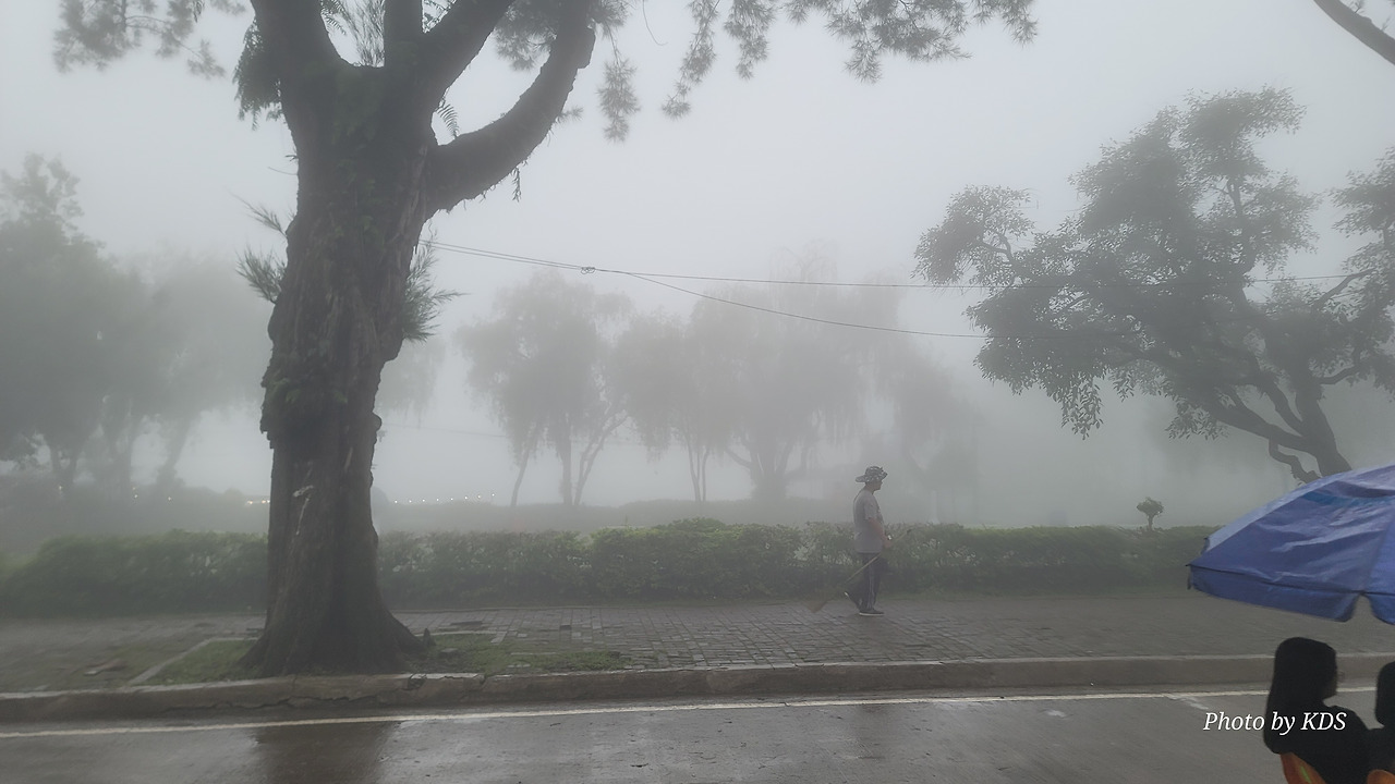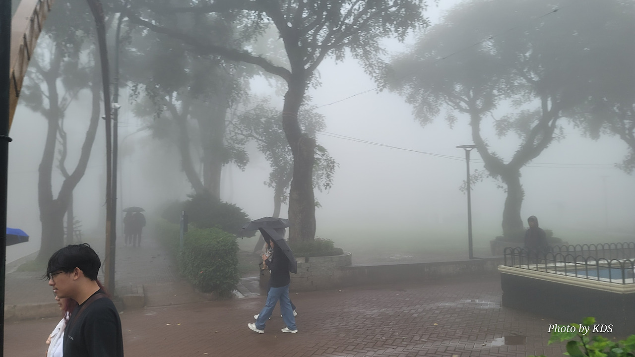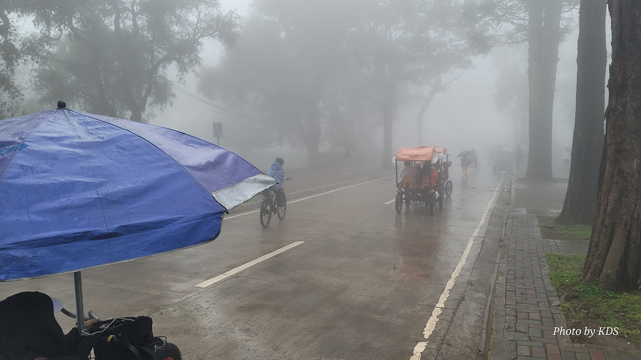 우리 팀은 모두들 묵직한 배낭을 둘러매고 숙소로 돌아가기 위해 거리로 나섰다. 그런데 쇼핑하는 잠깐 사이에 바기오의 날씨가 확 바뀌어 있었다. 한국 식품 마트로 오기 전에 산꼭대기에 있는 SM City Mall 옥상 정원에서 시내와 저 멀리 산들을 둘러보고 있을 때, 먼 산 쪽에서 검은 구름들이 점차 바기오 시내로 몰려오는 것이 보였다. 그 당시는 아마 소나기 즉 열대지방의 우기에 하루 행사인 스콜이 쏟아지려나 보다 생각했다. 그런데 쇼핑을 끝내고 나오니 그동안 이 먹구름 집단이 바기오 시내를 덮친 것이다. 시야가 50m 정도도 안 보이게 짙은 안개가 온 시내를 뒤덮고 있었다. 구름인지 안개인지 분간이 안 간다. 그런데 비는 내리지 않는 걸 보면 구름이 아닌 것 같기도 하다. 높은 산에 올라가 보면 낮은 지역의 계곡이나 들판에 구름이 끼어서 운해(雲海)처럼 보이는 경치를 간혹 만난다.