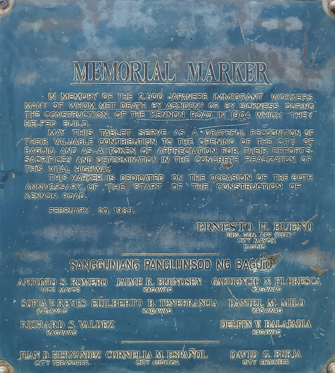 전망대에서 내려다보면 아득하게 골짜기가 보이고 구름이 산 중턱에 걸려서 마치 한 폭의 그림처럼 보인다. 바로 밑을 내려다보면 아슬아슬한 절벽의 높이이다. 사진으로는 잘 구분이 안 되지만 아무튼 120년 전에 이런 산악지형을 개발하여 도시를 건설하였으니 대단한 일이다. 필리핀 사람들은 자기들을 무력으로 지배한 스페인, 미국, 일본에 대하여 우리처럼 그런 증오의 감정을 가지고 있지 않는 것 같다. 무력의 지배는 지배이고 개발의 이익은 자기들의 것이라고 생각한다. 외세가 침략해서 이룩해 놓은 것도 모두 자기들의 유산으로 생각하는 것이다. 우리 민족의 인식 구조와는 사뭇 다르다. 그래서 이 케논 로드 전망대에도 아주 아이러니 한 기념물이 조성되어 있다. 바로 메모리얼 마커(Memorial Marker)이다. 당시에 건설 중에 사고나 질병으로 죽은 일본 이민 노동자들 2,300명을 추모하는 기념물을 새워 놓은 것이다. 기록에 따르면 일본만이 아니라, 필리핀인, 중국인, 미국인들이 희생을 했는데, 유독 일본인에 대한 기념물만 세워 놓은 것이다.