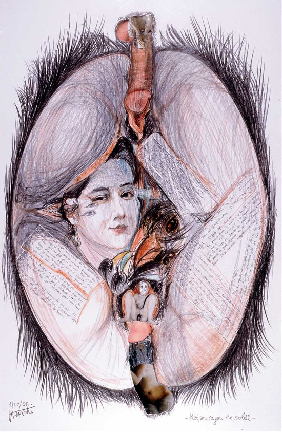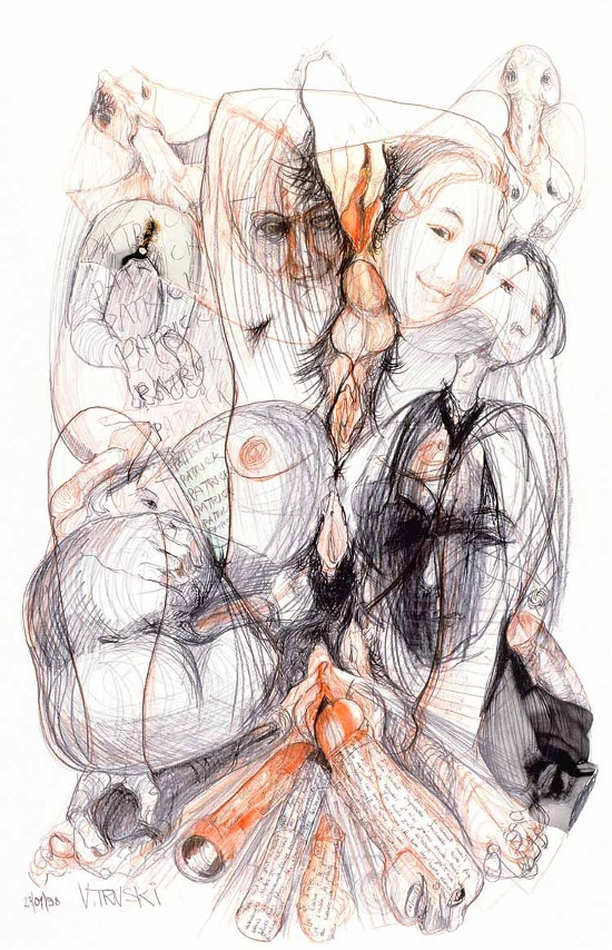 그는 크로아티아의 포드라비나(Podravina)에서 태어났는데, 이 지역이 헝가리의 평야와 크로아티아의 빌로고라(Bilogora) 산맥 사이에서 목가적으로 성장했다. 그래서 흔들리는 밀과 옥수수밭의 황금빛 바다, 아름다운 야생화로 뒤덮인 끝없는 평원을 춤추며 부드럽게 쓰다듬는 구름과 헝가리의 피가 흐르는 포드라비나 소녀들의 풍만한 가슴을 동경하며 꿈을 키웠다고 한다. 그는 실제이든 허구이든 그의 초상화에서 그는 주로 여성의 얼굴을 다루지 않지만, 두꺼운 색의 물질과 다양한 투명한 페인트 코팅 사이에 대비를 만든다. 아래의 작품 <Rester Avec Lui>와 <Moi Son Rayon de Soleil>을 보라. 이해가 되는가? 난잡한 성애의 적나라한 모습과 이를 즐기는 듯한 여인의 밝은 얼굴이 대비되고, 신문지 또는 찢어진 노트 같은 종이로 말린 남성의 성기 모양이 떼를 지어 여성의 은밀한 그곳으로 경쟁적으로 돌진하는 것이 또한 그로테스크하다. 그는 헝가리 대초원 위로 찬 눈을 가져오는 매서운 북풍조차도 포드라비나 사람이 사랑하는 사람의 품에 안겨 바이올린 소리가 배경에서 울리는 가운데 사랑이 녹아내릴 때 눈의 욕망이나 뺨의 홍조를 식힐 수 없다고 주장한다. 파리에서 활동하는 그는 사랑의 활화산인가, 날마다 축제를 즐기는 것인가?