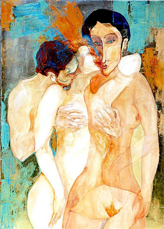 표지의 그림은 벨리미르 트란스키(Velimir Trnski)의 <Amadeo>이다. 얼핏 보면 두 연인이 결렬한 키스를 하면서 사랑을 나누는 장면이다. 그러나 자세히 보면 여러 사람이 겹쳐서 엉켜 있다. 두 사람이 사랑을 나누면서도 가슴이나 머릿속으로는 다른 사람을 그리거나 상상하는 것을 나타내는 것 같다. 이것은 마치 사진에서 연속적 다중노출 기법으로 촬영하여 사물의 활동성이나 시간의 흐름을 표출하는 방법과 유사한 듯하다. 아래 작품 <Beatrice>도 비슷한 기법이다. 2~4 사람이 긴밀하게 서로 얽혀서 진한 사랑을 나누는 모습이다. 그의 작품 세계는 주로 모델들의 얼굴에 꿈과 현실을 접착시키면서 동시에 캔버스의 표면을 세밀한 과학적 시각으로 탐구하는 것 같다. 이성적, 비이성적 또는 과거와 현대의 교차, 손의 필체와 사진의 사실적 감성 표현, 어쩌면 시적인 근원에 접근하고자 하는 것 같다.