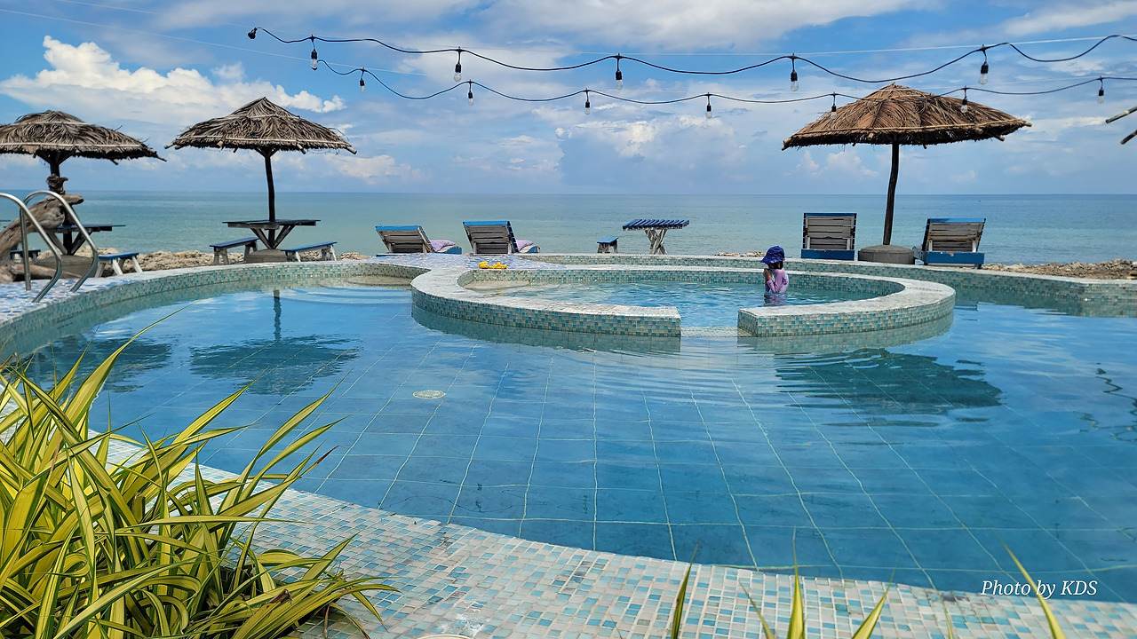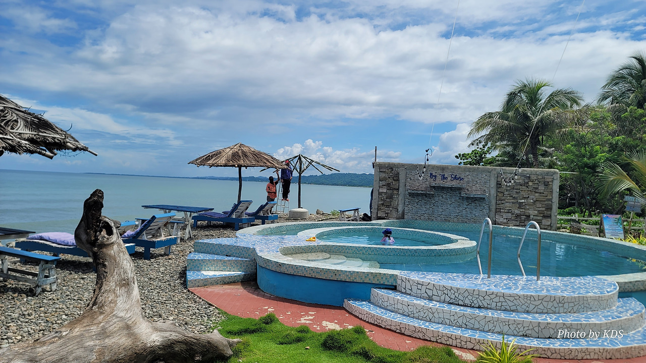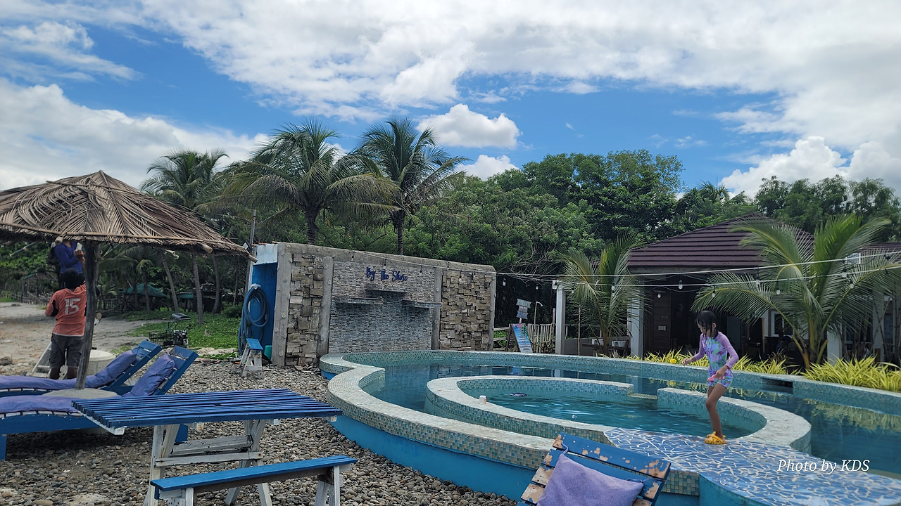 두 시간 정도 걸려서 우리의 목적지 By the Shore Resort에 도착했다. 한국에서 생각하는 그런 리조트가 아니고 펜션 정도의 규모라고 생각하면 맞겠다. 바닷가를 끼고 이런 개인이 운영하는 리조트가 서너 개가 나란히 있었다. 바닷가의 모래사장은 공유를 하지만 모래사장 바로 뒤편의 땅을 개인들이 개발 건축하여 리조트로 쓰는 것이다. 숙소와 음식점, 수영장, 간단한 놀이시설, 샤워장 등을 구비하여 손님을 받는 스타일이다. 입장료가 1인당 350페소이다. 봉이 김선달이 따로 없다는 생각이 들었다. 왔으니 안 들어갈 수도 없고, 기분이 나빴지만 어쩔 수 없다. 리조트에 숙박을 하지 않고 낮 시간을 쉬다가 돌아갈 거라서 구비된 시설과 주변을 둘러보았다. 야외 수영장과 음식점 겸 카페, 숙소, 정원, 야외 샤워시설 등이 갖추어져 있고, 바다의 해변을 보니 태평양 한가운데 있는 섬이 맞나 할 정도로 우리나라 서해안 같은 물 색깔이었다. 갯벌도 없는 것 같은데 기대했던 쪽빛이나 하늘색 물이 아니라서 바닷물 속으로 들어가고 푼 생각이 싹 가셨다. 보라카이, 세부, 수빅, 아포 등등 이제까지 가본 필리핀의 바다가 아닌 보령 앞바다다.