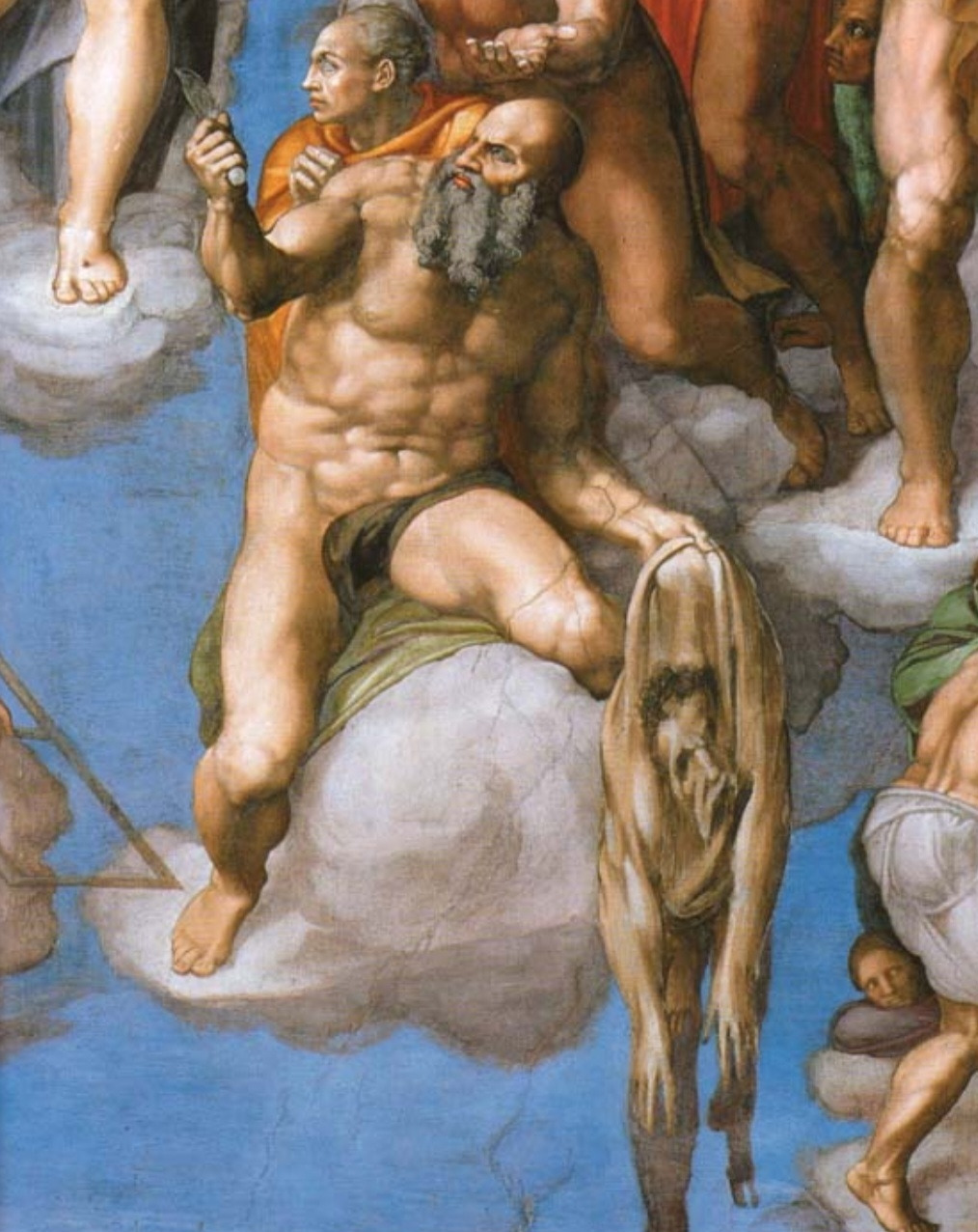 르네상스의 3대 거장 중 가장 오랜 기간 활약한 미켈란젤로 부오나로티(Michelangelo Buonarroti)는 스스로 조작가로 남기를 바랐지만 교황 율리우스 2세의 명에 따라 붓을 들고 서른 중반의 4년간을 처절하게 천장화 <천지창조>를 그렸다. 그리고 환갑 나이에 교황 클레멘스(Clemens) 7세가 죽기 직전에 그에게 시스티나 성당의 제대화(祭臺畵) <최후의 심판>을 그리도록 지시했다. 미켈란젤로의 마음은 남은 생애 동안 자신의 장기인 조각에 몰두하여 걸작을 남기고 싶었을 텐데, 클레멘스의 명령으로 어쩔 수없이 또 프레스코화를 그리게 된 것이다. 그런데 명령한 교황이 죽자 그림을 그리지 않아도 되는가 했더니 후임 교황 바오로(Paulus) 3세의 명령으로 계속할 수밖에 없었다. 미켈란젤로가 고심 끝에 작업하는 그림은 온통 벌거벗은 나체화였다. 그것도 등장인물이 한 두 명도 아니고 대거 391명이나 되는 대작이 모두 나체화이고, 이 그림이 신성한 성당 제대(祭臺)의 벽화로 그려지고 있었다. 성경 속의 위대한 인물이나 심지어 예수 그리스토마저도 남성을 드러낸 채 알몸이었던 것이다. 미켈란젤로는 단테의 <신곡>을 모티브로 천국과 연옥, 지옥을 연상하는 5개 부문의 인간 군상을 나체로 그린 것이다. 그러니 요즘 말로 로마 시내에 센세이션을 일으킨 것이다. 그중 당시 교황청의 의전 담당 추기경인 비아지오 다 체세나(Biagio da Cesena)가 가장 강력하고 줄기차게 미켈란젤로를 다음과 같이 혹평하였다. “신성한 장소에 이렇게 부끄럽게 몸을 드러낸 알몸의 인물들이 묘사되어 있다는 것은 수치스러운 일이다. 이 그림은 대중목욕탕이나 선술집에 더 잘 어울린다.” 이것이 화근이었다. 그는 시스티나 성당이 존재하는 한 영원히 미켈란젤로로부터 낙인이 찍혀 만인의 웃음거리로 남게 된 것이다. 더구나 위의 그림 부분이 관람객의 눈높이에 가까워서 더 잘 관찰되니까. 성직자들의 등쌀에 본인의 얼굴도 아래 그림처럼 가죽을 벗긴 모양으로 그린다.