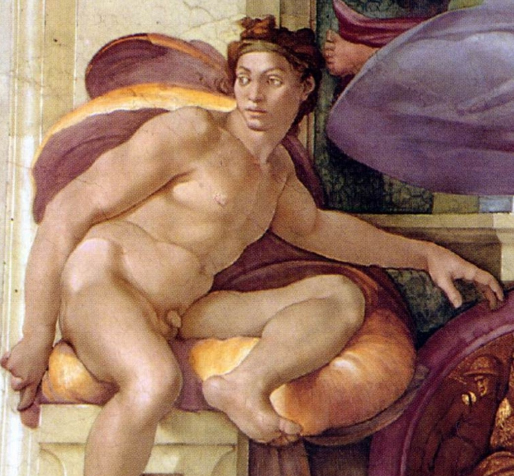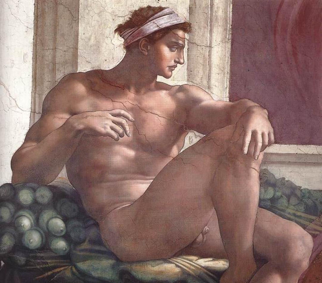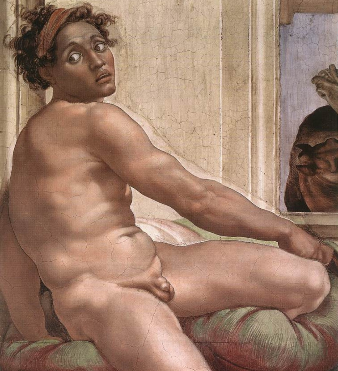 그림보다는 조각을 더 장기라고 생각하고 살아온 그에게 그리기도 힘들고 어려운 엄청난 크기의 대작 프레스코화를 그리도록 계속 주문한 교황들이 밉기도 하였을 것이다. 그래서 교황들이 미사를 집전하는 제단의 바로 뒤쪽에 지옥의 동굴 입구를 배치하였다. 지금 제대에서 신도들을 향해 헛소리를 하면 돌아서면 바로 지옥의 임구가 기다리고 있다는 듯이. 이런 어려운 그림의 주문도 아마 얄미운 건축가 브라만테(Bramante)의 공작이라고 그는 생각했다. 브라만테는 당시 회화에 약한 미켈란젤로가 거작 프레스코화에서 보기 좋게 실패하는 것을 보고 싶었으리라. 그래서 그는 남긴 글에서 브라만테를 많이 씹었다. 하지만 이런 질투의 끝에 불세출의 걸작이 나온 것이다. 뒤끝은 작렬하는 성격이지만 오히려 그런 것이 원동력이 되어 그는 조각가, 화가, 건축가, 시인으로서 역사에 길이 남을 업적을 남겼다. 그는 성당의 성화에서 다음과 같은 적나라한 나체를 최초로 도입하여 그린 천재이고, 이들을 "이그누디(Ignudi)"라고 불렀다.