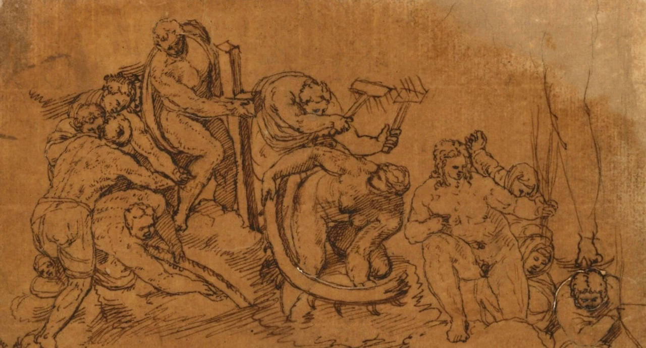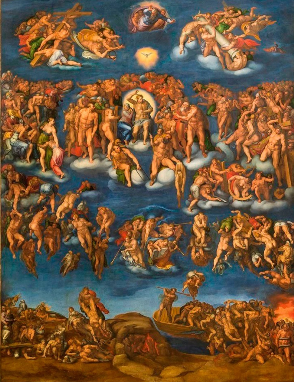 위의 작품은 1548년에 알레산드로 파르네세 추기경(Cardinal Alessandro Farnese)으로부터 주문을 받아 제작했던 마르첼로 베누스티(Marcello Venusti)가 그린 미켈란젤로의 원작 그림을 모사한 것이다. 말하자면 덧칠하기 전의 모양을 최대한 살린 것이다. 아무튼 미켈란젤로가 거의 사경(死境)이 가까워져도 작품을 수정할 수가 없었다. 마침내 1564년 2월에 미켈란젤로가 사망하자 제자들이 그의 장례식을 치른 후, 비오 4세 교황의 의뢰로 다니엘라 다 볼테라(Daniele da Volterra)가 스승의 작품에 덧칠을 하여 천이나 나뭇잎으로 주요 부분을 가리게 되었다. 심지어 부서진 수레바퀴를 들고 있는 성녀(聖女) 카타리나(Catherine)와 그녀의 뒤쪽에 있는 성인 블레이세(Blaise)가 배후위(後背位)의 자세로 그녀에게 밀착하는 듯이 보이는데, 이 부분이 음란한 마음으로 보면 매우 음란하여 폼페이의 목욕탕 벽화로 그려진 그림들과 비슷한 구도이다. 그래서 카테리나는 옷을 입히고, 둘이 서로 바라보는 머리를 파내고 다시 그려서 예수 쪽을 바라보도록 고쳤다. 이 일로 볼테라는 “Il Braghettone(바지를 만드는 사람)”으로 불리게 되었다. 원래의 구조는 미켈란젤로의 아래의 스케치를 참고하면 된다.